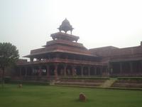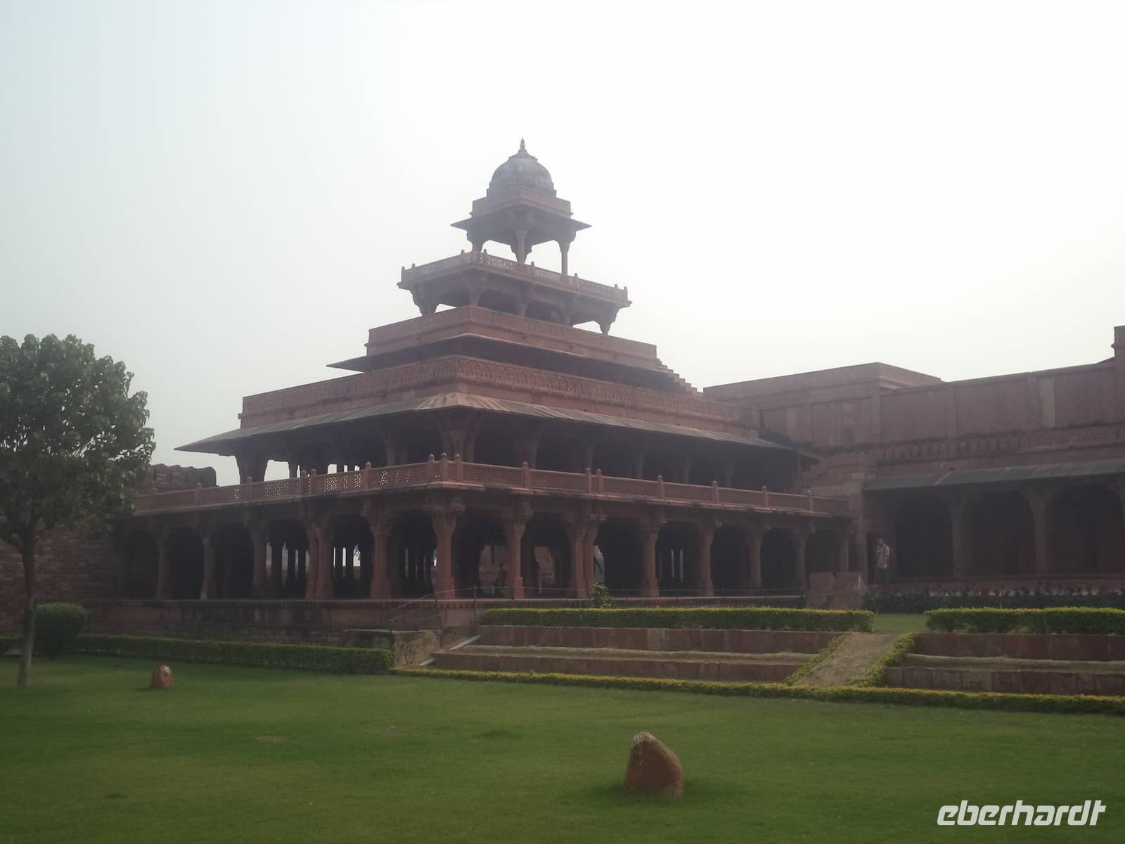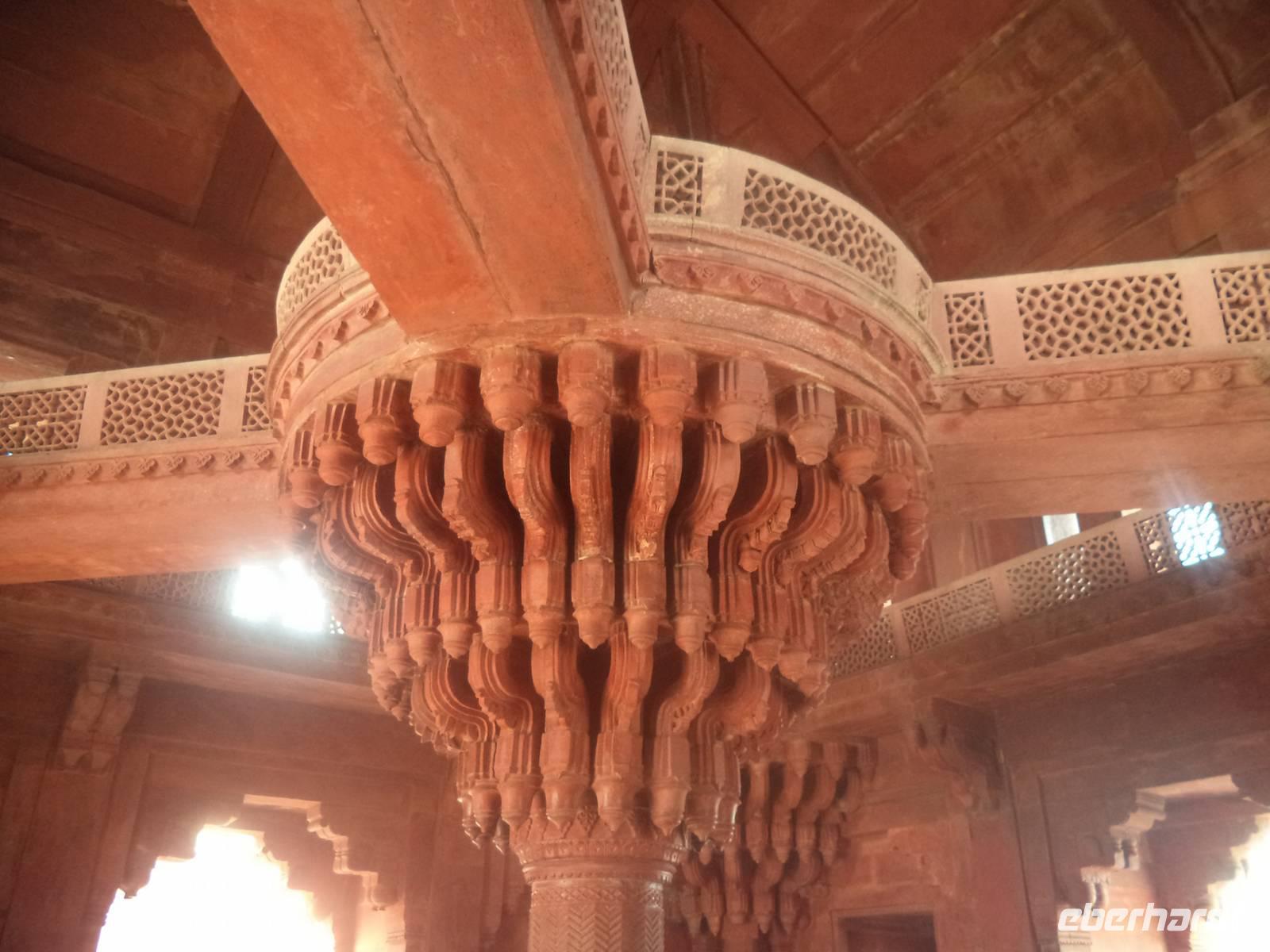 Der nächste Reisehöhepunkt hieß Fatehpur Sikri, einst Hauptstadt des Mogulreiches im 16. Jashrhundert unter Kaiser Akhbar dem Großen, der den Standort aber nach nur 12 Jahren wegen Wassermangel wieder aufgeben musste. Aus Umweltschutzgründen gelangt man nur noch per Elektro-Shuttlebus zum historischen Gelände. Mogul Akhbars ehemalige Hauptstadt ist bis heute sehr gut erhalten und lässt die Besucher auch in gewisser Weise teilhaben an der Geschichte und den traditionellen Lebensweise bei Hofe. Wir begannen unseren Rundgang im Bereich der Audienzhalle und sahen auch den einstigen luftigen „Windpalast" für die heißen Sommer in Fatehpur, den „Vergnügungshof" und die Paläste von Akhbars Frauen. Natürlich bestaunten wir auch das sogenannte „Schatzhaus" des Herrschers und seinen ehemaligen Beratungs- und Audienzpalast, der mit der „Säule der Religionen" eines der wohl bekanntesten und berühmtesten Details der „Geisterstadt" Fathepur enthält. Sie enthält wundervolle in Sandstein ausgeführte Kerbschnitzereien, deren vielfältige Muster nicht nur ein Zusammenschnitt von Motiven aus verschiedenen Religionen sondern auch ein gelungenes Zeugnis für die damals an Akhbars Hof herrschende religiöse Toleranz sind.