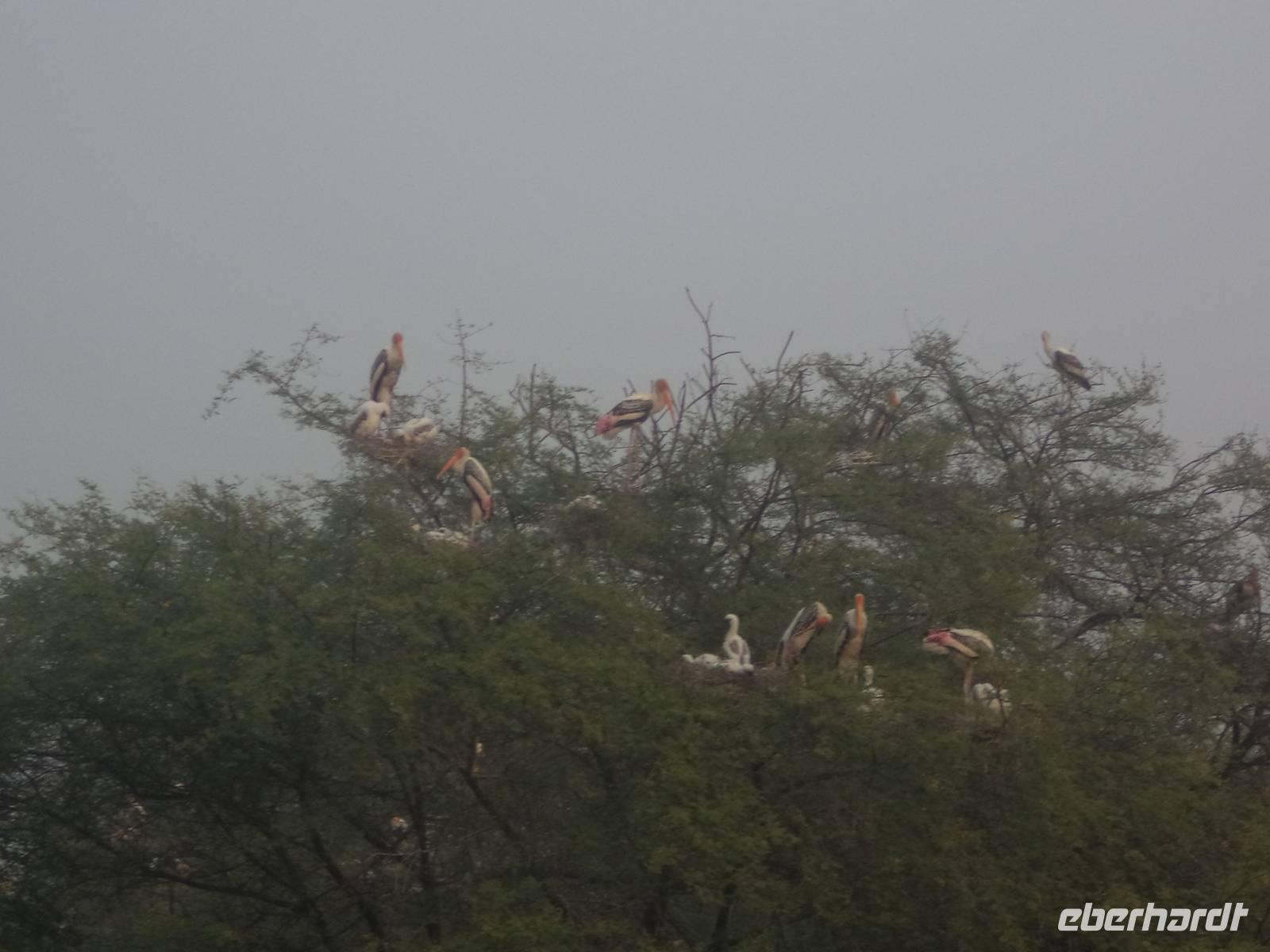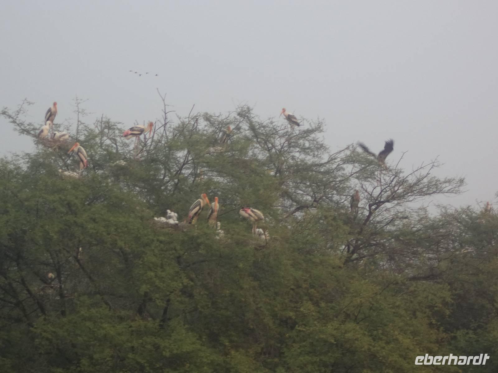 Später stärkten wir uns bei einem Mittagessen, bevor uns der Keoladeo-Nationalpark, Indiens kleinster NP, in seinen Bann zog. Bekannt ist der Park, den wir auf einer Rikschah-Safari näher kennenlernten, für seine vielen Vogelarten, darunter bei ergiebigem Monsun in der riesigen Sumpflandschaft verteilt insbesondere Buntstörche. Viele besondere Fotos konnten wir hier „schießen", auch wenn Bilder den Gesamteindruck des Geklappers aus tausenden Storchennestern nur unvollständig wiedergeben. Nach ereignisreichen eineinhalb Stunden Vogelpark-Aufenthalt bestiegen wir wieder unseren Bus, der uns in Rajasthans Hauptstadt Jaipur brachte, die wir aber erst nach Einbruch der Dunkelheit erreichten.