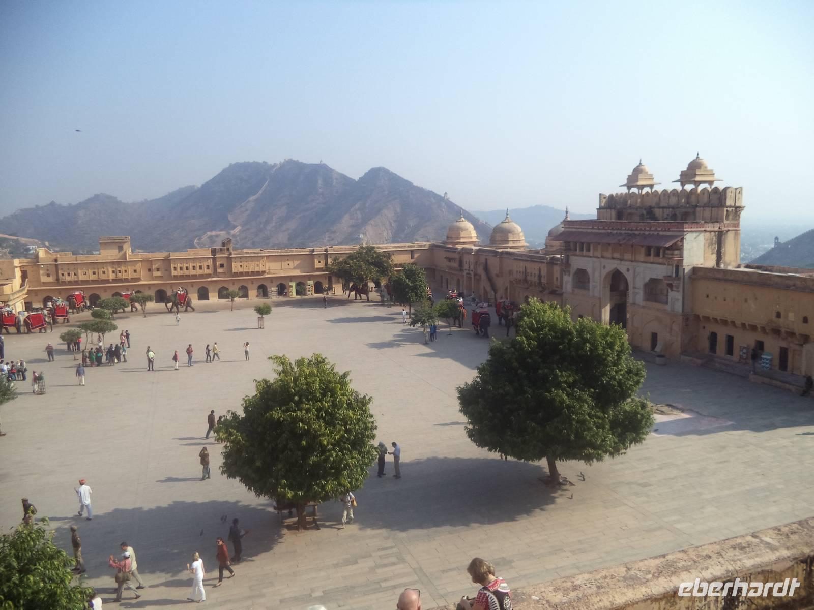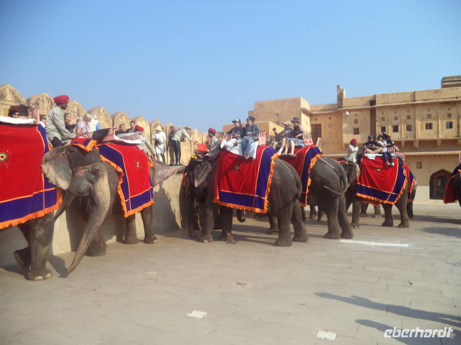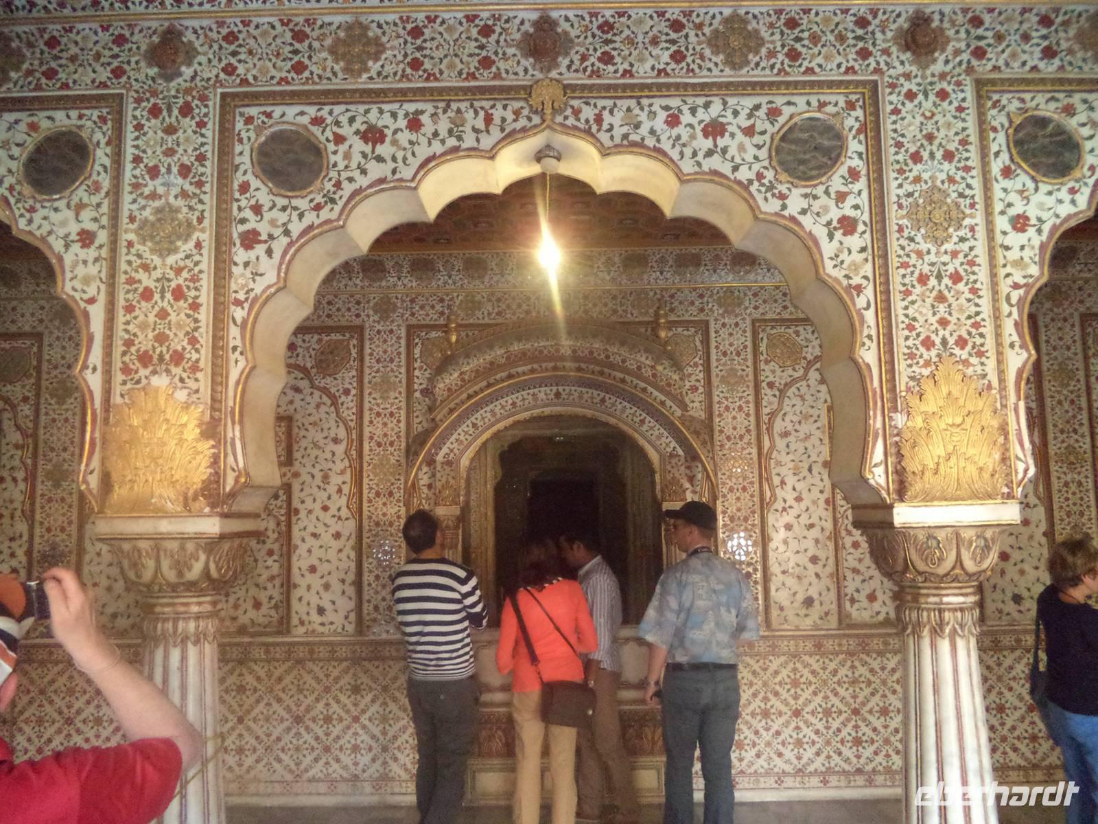 Nach dem Frühstück brachen wir heute auf zum ersten Abenteuer: dem Elefantenritt. Auf dem Weg zur „Talstation" der Elefanten zu Füßen des Amber-Forts passierten wir erst einmal Jaipurs meistfotografiertes Objekt: den Hawa Mahal, den berühmten „Palast der Winde". Eigentlich ist es nur eine zum Stadtschloß-Komplex gehörende Fassade, aber der kunstvoll gearbeitete rote Sandstein brilliert mit hunderten Fenstern, die eigentlich durchbrochene steinerne Platten als Sichtblenden sind. In jedem Indien-Reiseführer ist diese Fassade als Paradestück indischer Palastarchitektur zu finden, die einst den Damen des Rajputen-Hofes von Jaipur als Rückzugsmöglichkeit diente, um verborgen durch die Fensterblenden zu sehen, was auf der Straße vor sich ging, ohne selbst gesehen zu werden. Dann setzten wir unseren Weg fort und erreichten den Berg zu Füßen der Festung Amber, einst Hauptstadt eines großen Reiches, denn die inzwischen weit bedeutendere Stadt Jaipur, die heute etwa so groß wie Berlin ist, wurde erst vor knapp dreihundert Jahren gegründet. Auf buntgeschmückten Elefanten überwinden heute Touristen den Höhenunterschied des steilen Burgbergs, ganz so wie es früher die Herrscher und ihre wichtigsten Gäste taten. hinauf befördern. Ein Elefantenritt ist natürlich etwas Besonderes und zählt für viele Gäste zu den Höhepunkten der Reise! Zu zweit schaukelten wir auf dem Elefantenrücken, der ein leidlich bequemes Podest zum Sitzen trägt in ein paar Minuten hinauf in den ersten, den großen Vorhof zum Palast. Hier lockt - nachdem man abgestiegen ist, sich der bunten Außenfassade des Amber Fort zugewendet hat und über eine Treppe oder eine Ramope höhergestiegen ist, der zweite Vorplatz mit der gewaltigen ehemaligen Audienzhalle, deren Wände durch tausende geschickt eingesetzte Spiegelscherben verziert sind. Dann begaben wir uns, geführt durch Reiseleiter Ambrish, zum Inneren Eingangstor, das als Prunkstück altindischen Kunsthandwerks gelten darf und schon von weitem mit wundervollen Malereien an den Außenwänden leuchtet. Nach Passieren dieses Tores trifft man auch im Palastinneren allenthalben auf. Verzierungen durch Intarsien und Malerei sowie die historischen Kühlanlagen, die ähnlich bis heute in indischen Bauten verwendet werden und die im Sommer die Temperaturen im Palast auch bei großer Hitze durch geschickten Einsatz fließenden kühlen Wassers erträglich hielten. Tücher, Vorhänge und dünne, wasserbenetzte Teppiche wurden zudem durch Menschenkraft früher fächelnd bewegt, was kühlenden Luftzug erzeugte und bereits im 15., 16. und 17. Jahrhundert für Komfort sorgte.