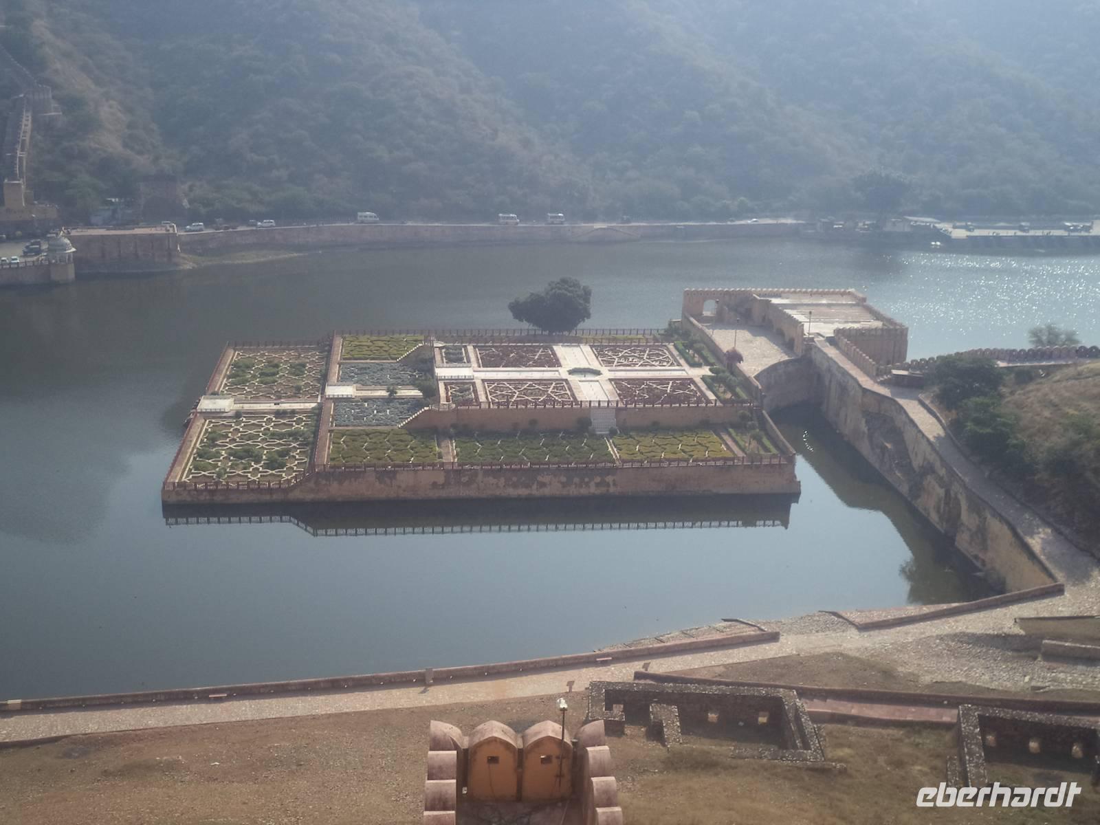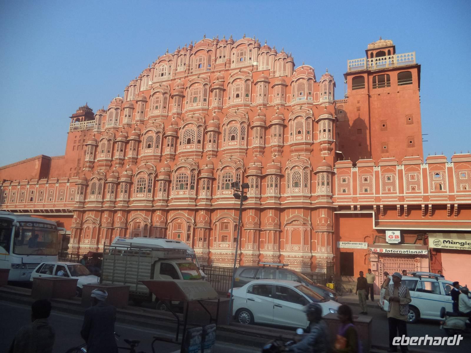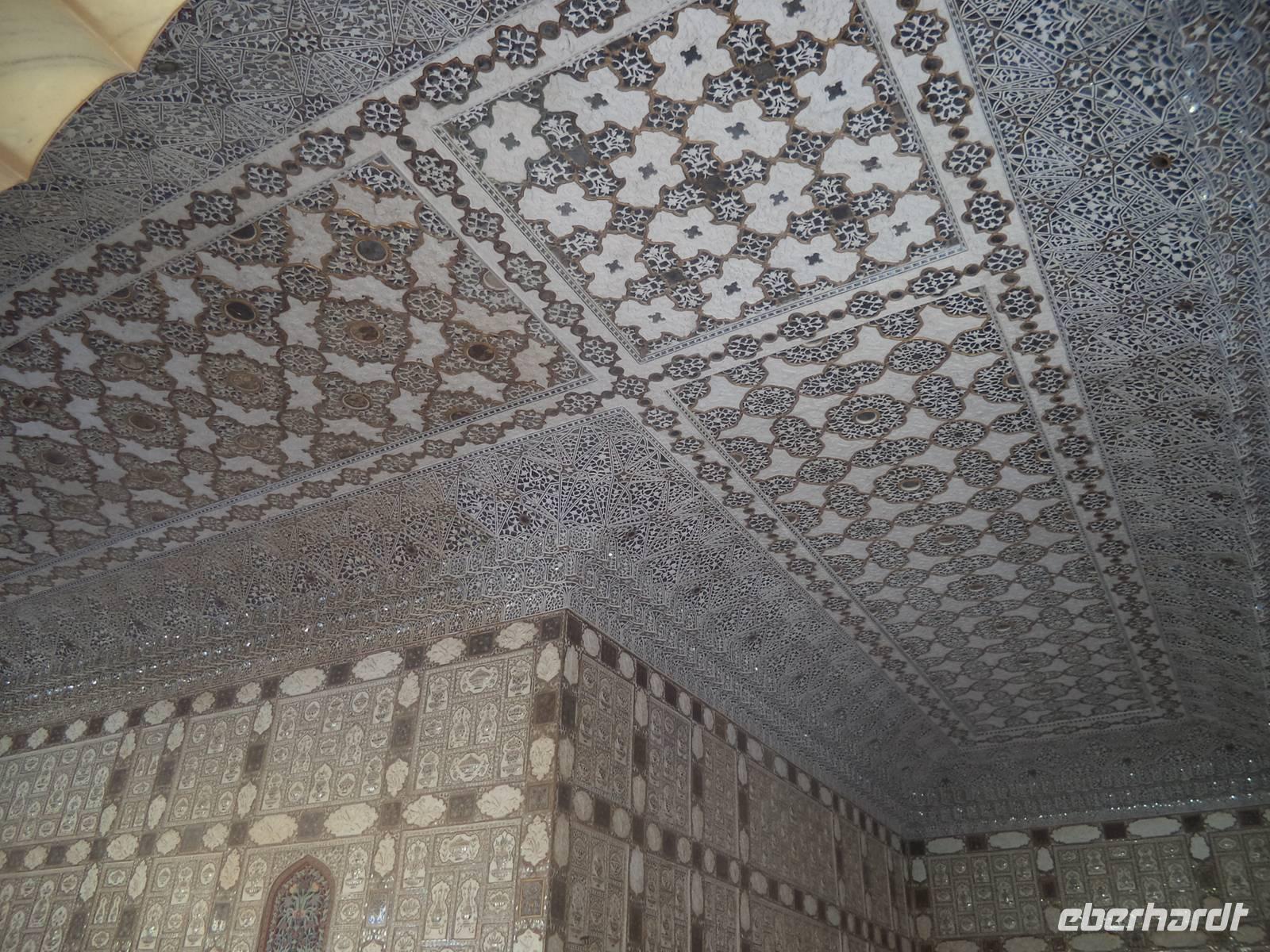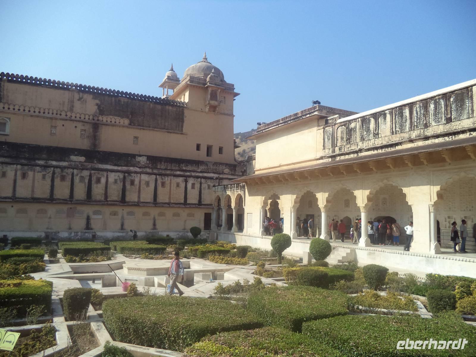Nach dem Frühstück brachen wir heute auf zum ersten Abenteuer: dem Elefantenritt. Auf dem Weg zur „Talstation" der Elefanten zu Füßen des Amber-Forts passierten wir erst einmal Jaipurs meistfotografiertes Objekt: den Hawa Mahal, den berühmten „Palast der Winde". Eigentlich ist es nur eine zum Stadtschloß-Komplex gehörende Fassade, aber der kunstvoll gearbeitete rote Sandstein brilliert mit hunderten Fenstern, die eigentlich durchbrochene steinerne Platten als Sichtblenden sind. In jedem Indien-Reiseführer ist diese Fassade als Paradestück indischer Palastarchitektur zu finden, die einst den Damen des Rajputen-Hofes von Jaipur als Rückzugsmöglichkeit diente, um verborgen durch die Fensterblenden zu sehen, was auf der Straße vor sich ging, ohne selbst gesehen zu werden. Dann setzten wir unseren Weg fort und erreichten den Berg zu Füßen der Festung Amber, einst Hauptstadt eines großen Reiches, denn die inzwischen weit bedeutendere Stadt Jaipur, die heute etwa so groß wie Berlin ist, wurde erst vor knapp dreihundert Jahren gegründet. Auf buntgeschmückten Elefanten überwinden heute Touristen den Höhenunterschied des steilen Burgbergs, ganz so wie es früher die Herrscher und ihre wichtigsten Gäste taten. hinauf befördern. Ein Elefantenritt ist natürlich etwas Besonderes und zählt für viele Gäste zu den Höhepunkten der Reise! Zu zweit schaukelten wir auf dem Elefantenrücken, der ein leidlich bequemes Podest zum Sitzen trägt in ein paar Minuten hinauf in den ersten, den großen Vorhof zum Palast. Hier lockt - nachdem man abgestiegen ist, sich der bunten Außenfassade des Amber Fort zugewendet hat und über eine Treppe oder eine Ramope höhergestiegen ist, der zweite Vorplatz mit der gewaltigen ehemaligen Audienzhalle, deren Wände durch tausende geschickt eingesetzte Spiegelscherben verziert sind. Dann begaben wir uns, geführt durch Reiseleiter Ambrish, zum Inneren Eingangstor, das als Prunkstück altindischen Kunsthandwerks gelten darf und schon von weitem mit wundervollen Malereien an den Außenwänden leuchtet. Nach Passieren dieses Tores trifft man auch im Palastinneren allenthalben auf. Verzierungen durch Intarsien und Malerei sowie die historischen Kühlanlagen, die ähnlich bis heute in indischen Bauten verwendet werden und die im Sommer die Temperaturen im Palast auch bei großer Hitze durch geschickten Einsatz fließenden kühlen Wassers erträglich hielten. Tücher, Vorhänge und dünne, wasserbenetzte Teppiche wurden zudem durch Menschenkraft früher fächelnd bewegt, was kühlenden Luftzug erzeugte und bereits im 15., 16. und 17. Jahrhundert für Komfort sorgte.