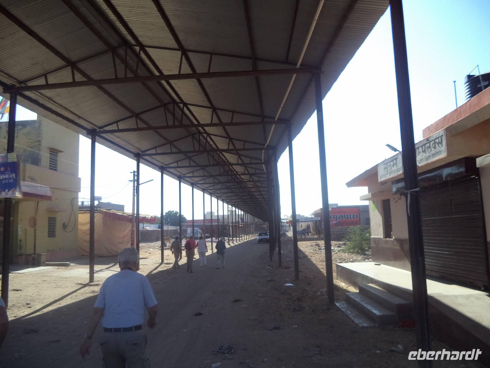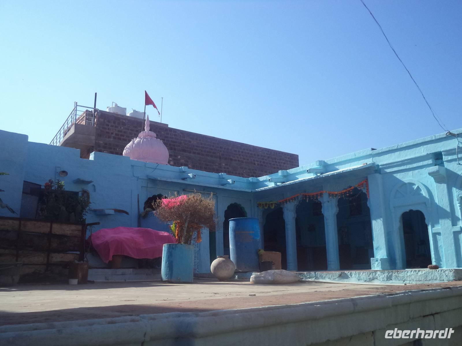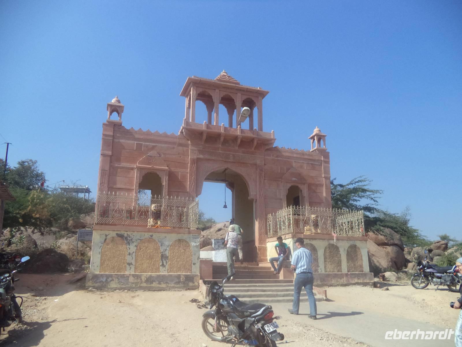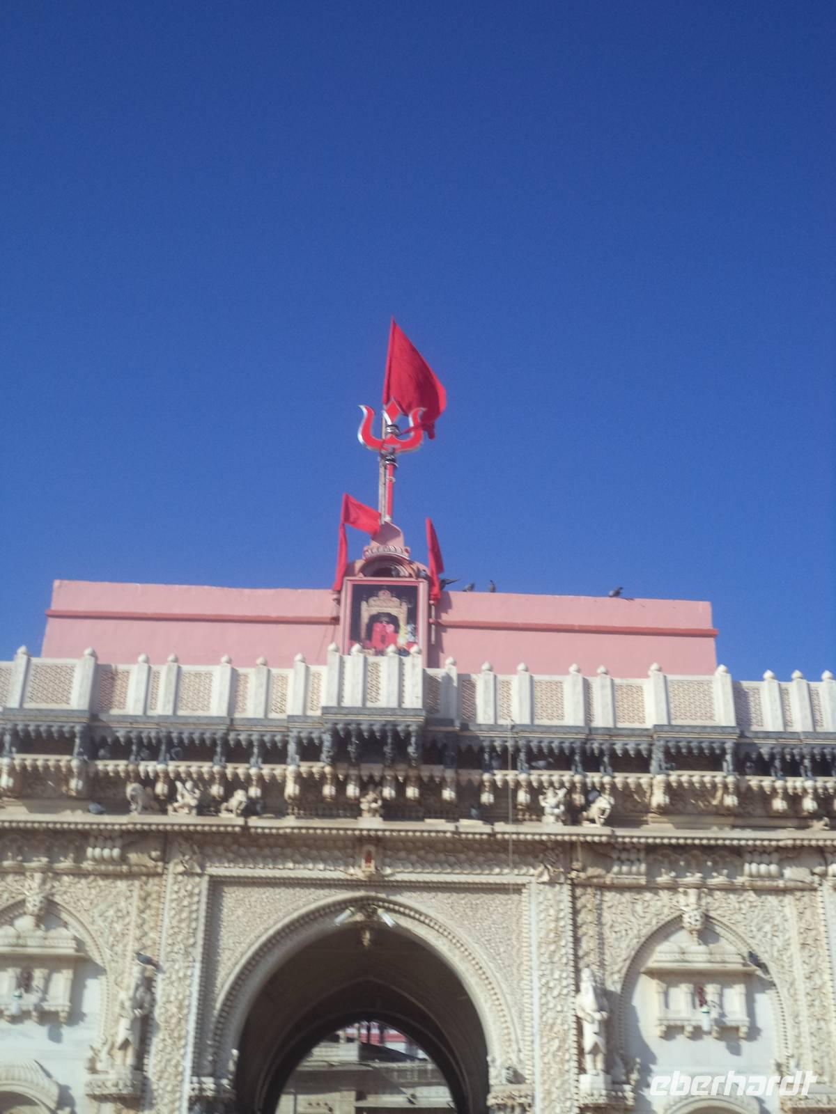 Die Haupt-Attraktion von Osyan ist aber der gewaltige neue Pilgertempel, dessen Aufbau in vielen Stufen das Himmelsgefüge darstellen soll. Zahlreichen Steinschnitzereien zieren ihn, angebracht zur Verehrung der vielen bedeutenden Hindugötter, allen voran der hier wie auch sonst übliche, mit seinem Dreizack - dem Trishul - gekennzeichneten Zerstörergott Shiva. Wir verließen wir Osyan und begaben uns weiter in Richtung Zentrum der Wüste. Nach der Mittagspause war noch Zeit für ein kleines „Richtig Reisen!"-Extra: einen Abstecher in einen anderen Hindu-Wallfahrtsort. Ramdeora, in dessen Tempel der aus dem nationalen Heldenepos jedem Inder bekannte Gott Rama verehrt wird, unterscheidet sich gravierend von Osyan. Mit seiner langgezogenen, wellblech-überdachten Prozessionsstraße, die am Rama-Tempel endet, erlebt er punktuell nur im August jeden Jahres mehrere Millionen Pilger. Dennoch ist auch zu anderen Zeiten vor dem Tempel der Service für opferwillige Gläubige rund ums Jahr aktiv, denn hier gibt es überall um die Tempel herum zahlreiche Verkaufsstände speziell für Opfergaben.