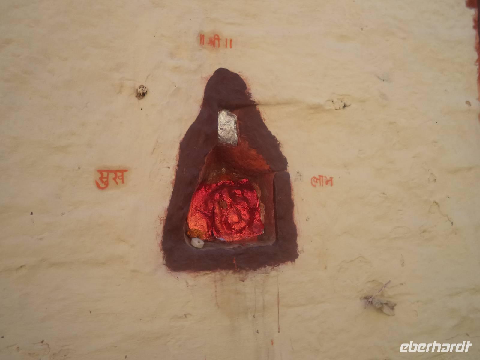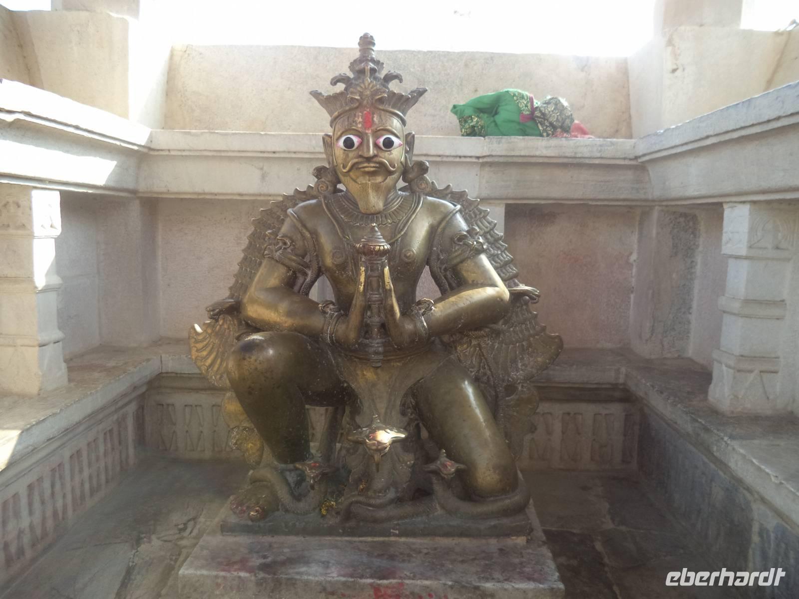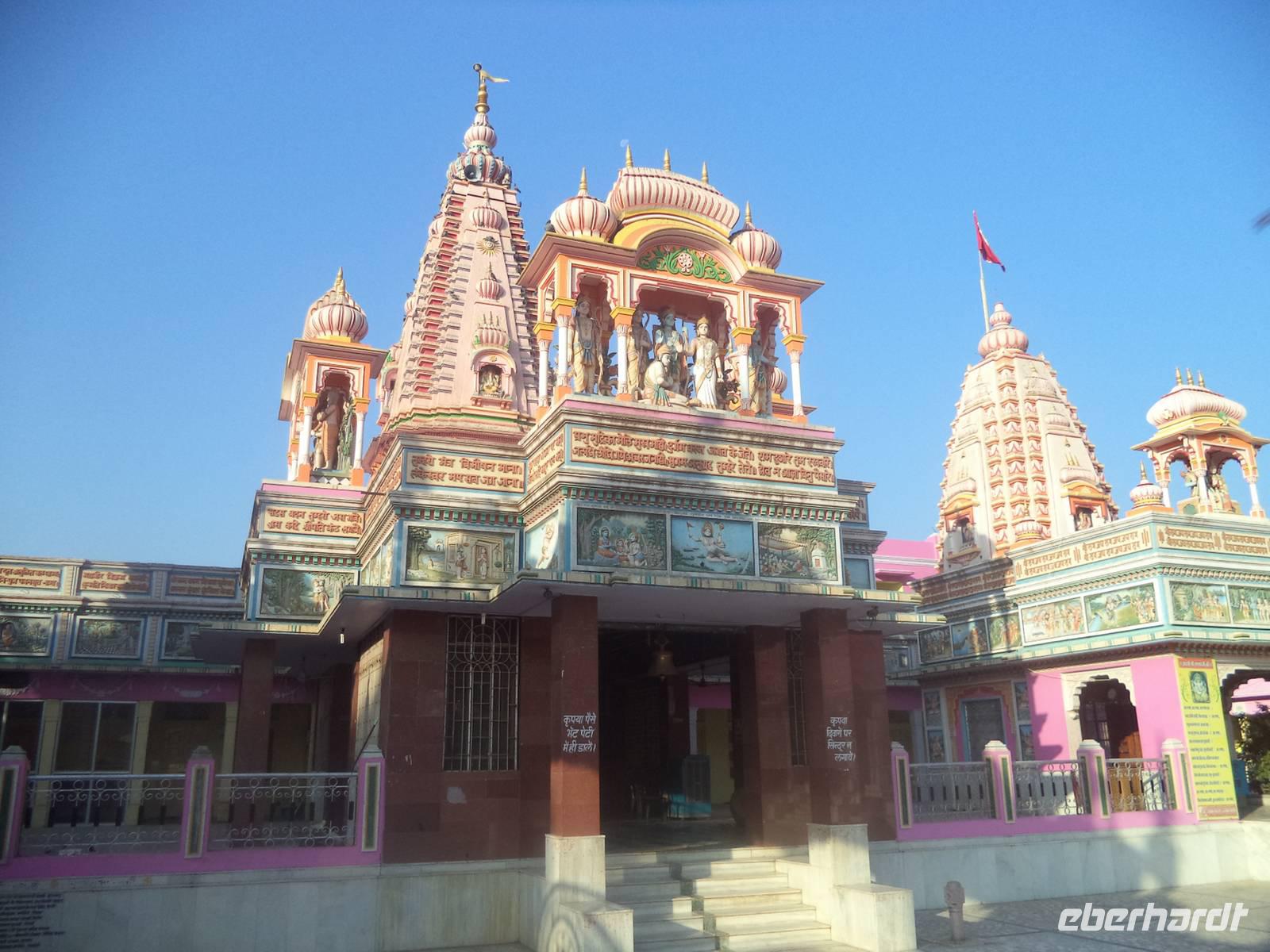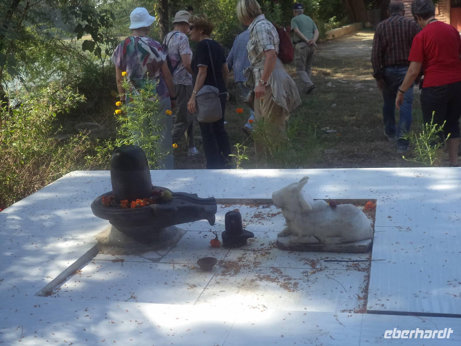 Die Haupt-Attraktion von Osyan ist aber der gewaltige neue Pilgertempel, dessen Aufbau in vielen Stufen das Himmelsgefüge darstellen soll. Zahlreichen Steinschnitzereien zieren ihn, angebracht zur Verehrung der vielen bedeutenden Hindugötter, allen voran der hier wie auch sonst übliche, mit seinem Dreizack - dem Trishul - gekennzeichneten Zerstörergott Shiva. Wir verließen wir Osyan und begaben uns weiter in Richtung Zentrum der Wüste. Nach der Mittagspause war noch Zeit für ein kleines „Richtig Reisen!"-Extra: einen Abstecher in einen anderen Hindu-Wallfahrtsort. Ramdeora, in dessen Tempel der aus dem nationalen Heldenepos jedem Inder bekannte Gott Rama verehrt wird, unterscheidet sich gravierend von Osyan. Mit seiner langgezogenen, wellblech-überdachten Prozessionsstraße, die am Rama-Tempel endet, erlebt er punktuell nur im August jeden Jahres mehrere Millionen Pilger. Dennoch ist auch zu anderen Zeiten vor dem Tempel der Service für opferwillige Gläubige rund ums Jahr aktiv, denn hier gibt es überall um die Tempel herum zahlreiche Verkaufsstände speziell für Opfergaben.