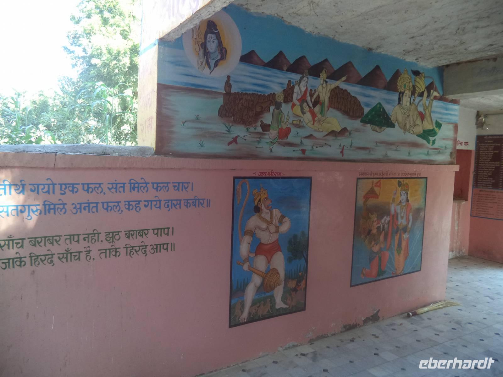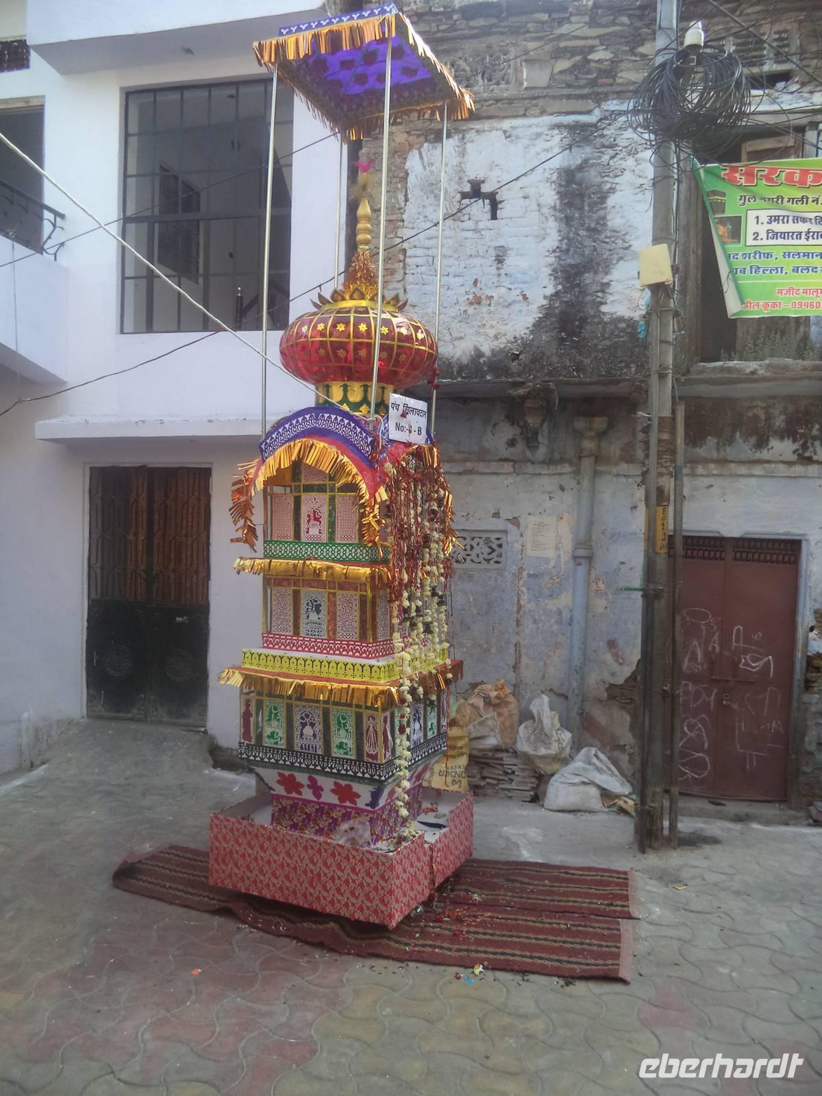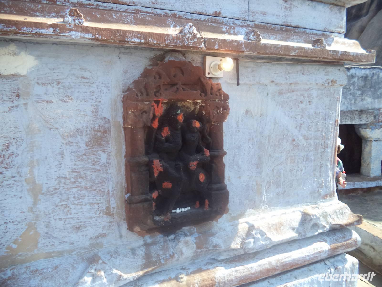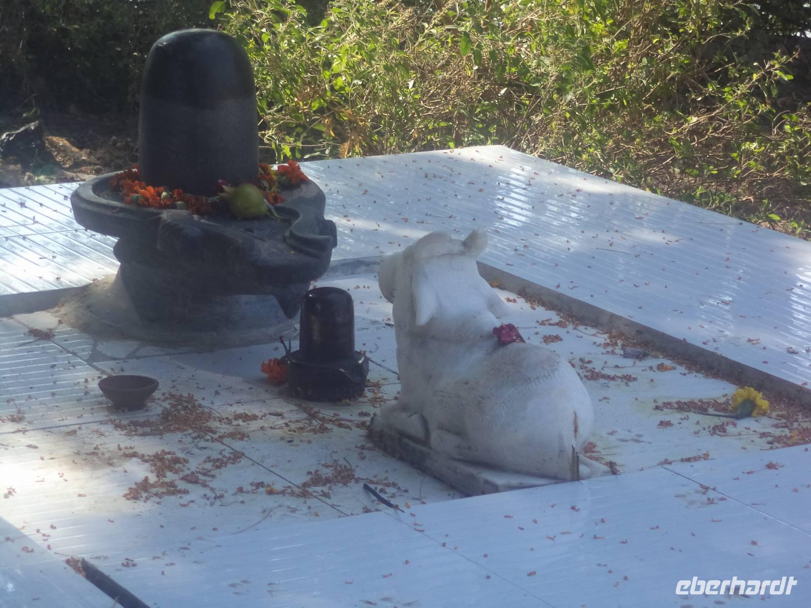 Die Haupt-Attraktion von Osyan ist aber der gewaltige neue Pilgertempel, dessen Aufbau in vielen Stufen das Himmelsgefüge darstellen soll. Zahlreichen Steinschnitzereien zieren ihn, angebracht zur Verehrung der vielen bedeutenden Hindugötter, allen voran der hier wie auch sonst übliche, mit seinem Dreizack - dem Trishul - gekennzeichneten Zerstörergott Shiva. Wir verließen wir Osyan und begaben uns weiter in Richtung Zentrum der Wüste. Nach der Mittagspause war noch Zeit für ein kleines „Richtig Reisen!"-Extra: einen Abstecher in einen anderen Hindu-Wallfahrtsort. Ramdeora, in dessen Tempel der aus dem nationalen Heldenepos jedem Inder bekannte Gott Rama verehrt wird, unterscheidet sich gravierend von Osyan. Mit seiner langgezogenen, wellblech-überdachten Prozessionsstraße, die am Rama-Tempel endet, erlebt er punktuell nur im August jeden Jahres mehrere Millionen Pilger. Dennoch ist auch zu anderen Zeiten vor dem Tempel der Service für opferwillige Gläubige rund ums Jahr aktiv, denn hier gibt es überall um die Tempel herum zahlreiche Verkaufsstände speziell für Opfergaben.