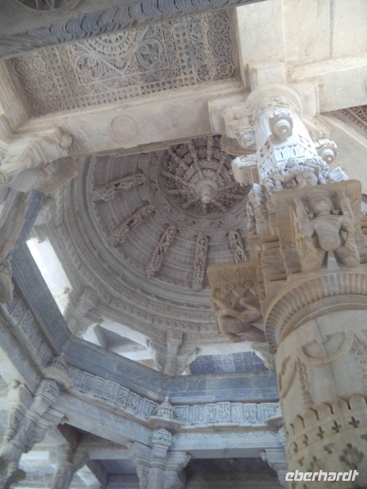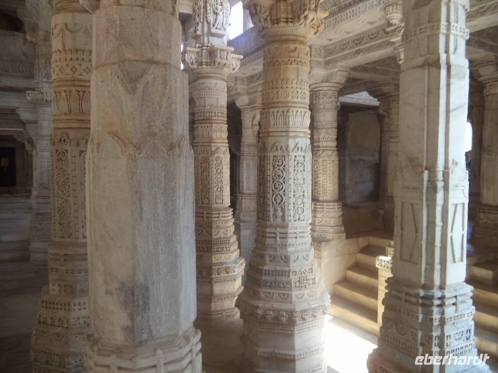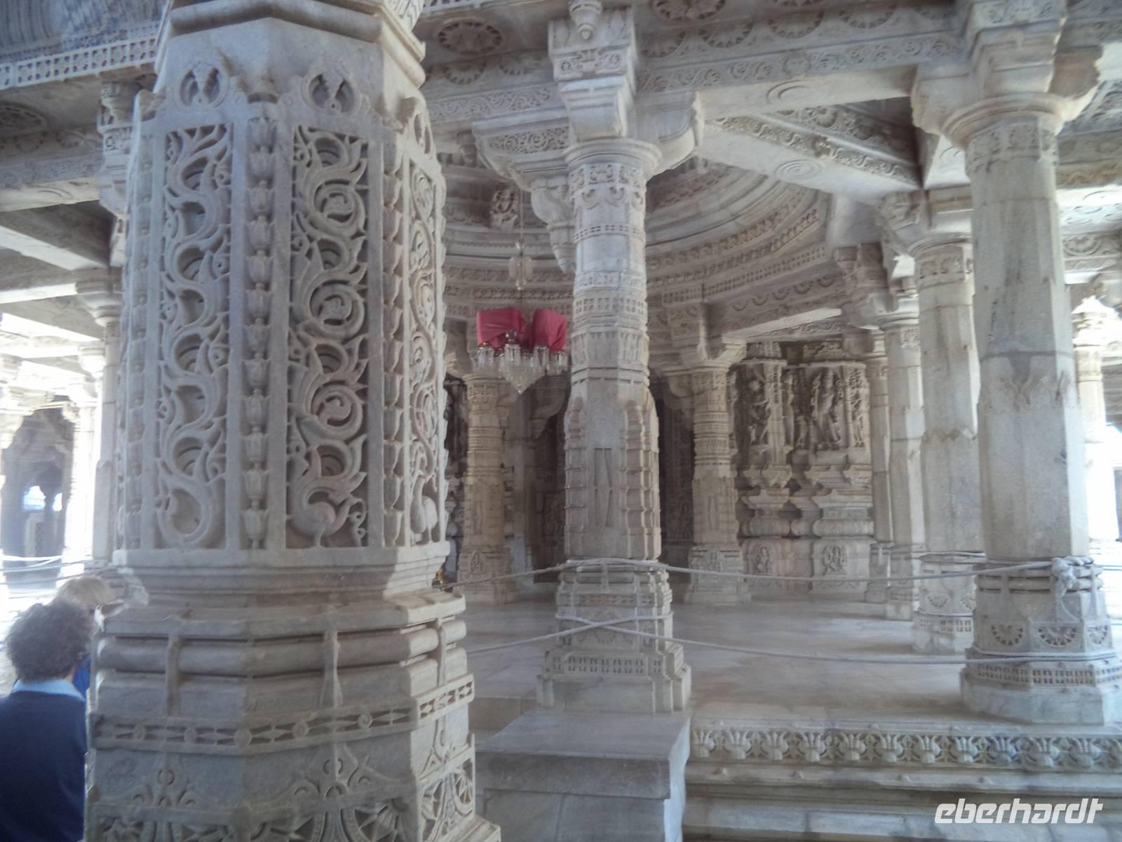 Die Besichtigung der Tempelanlage von Ranakpur war wiederum Tageshöhepunkt. Der in der zweiten Hälfte des 15. Jahrhunderts errichtete Jain-Tempel ist eines der wichtigsten Pilgerziele dieser Religionsgemeinschaft und größer als die älteren, aber zumeist bekannteren Dilwara-Tempel auf dem Abu-Berg im westlichen Rajasthan. Der dem „Wegbereiter" der Jain-Religion Adinath gewidmete Tempel ist zwar äußerlich eher unscheinbar, verfügt im Inneren jedoch über 1440 mit Kerbschnitzerei reich verzierte Sälen aus weißem Marmor. Das Erscheinungsbild des Tempelinneren ist eine eindrucksvolle Show der schönsten Stücke jainistischen Kunsthandwerks, ausgeführt in einem der härtesten zu bearbeitenden Gesteine.