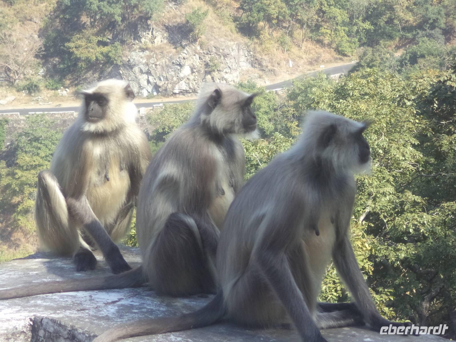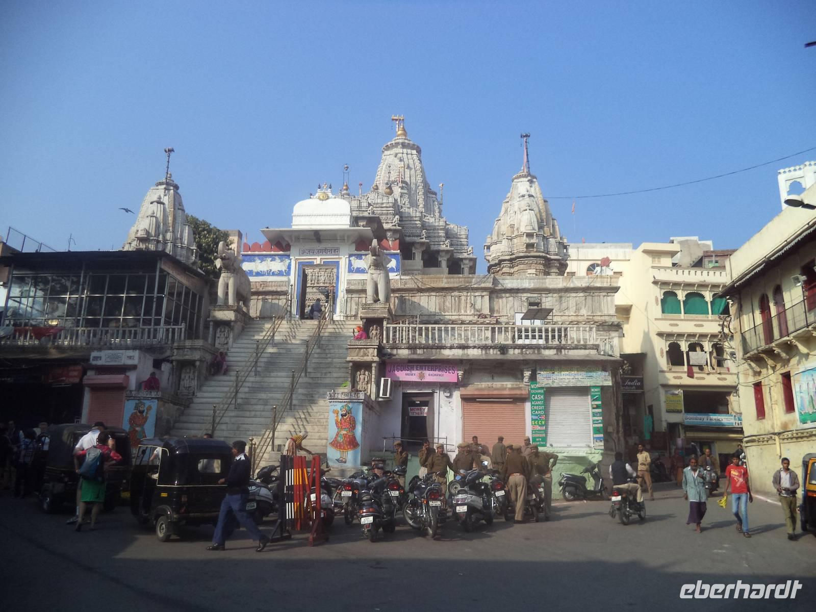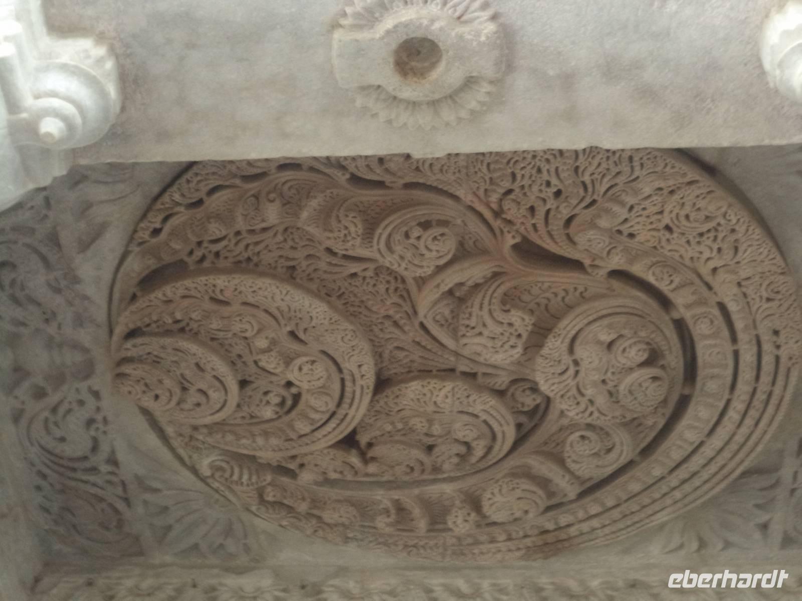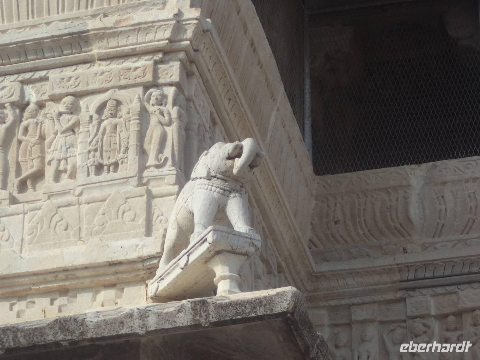 Die Besichtigung der Tempelanlage von Ranakpur war wiederum Tageshöhepunkt. Der in der zweiten Hälfte des 15. Jahrhunderts errichtete Jain-Tempel ist eines der wichtigsten Pilgerziele dieser Religionsgemeinschaft und größer als die älteren, aber zumeist bekannteren Dilwara-Tempel auf dem Abu-Berg im westlichen Rajasthan. Der dem „Wegbereiter" der Jain-Religion Adinath gewidmete Tempel ist zwar äußerlich eher unscheinbar, verfügt im Inneren jedoch über 1440 mit Kerbschnitzerei reich verzierte Sälen aus weißem Marmor. Das Erscheinungsbild des Tempelinneren ist eine eindrucksvolle Show der schönsten Stücke jainistischen Kunsthandwerks, ausgeführt in einem der härtesten zu bearbeitenden Gesteine.