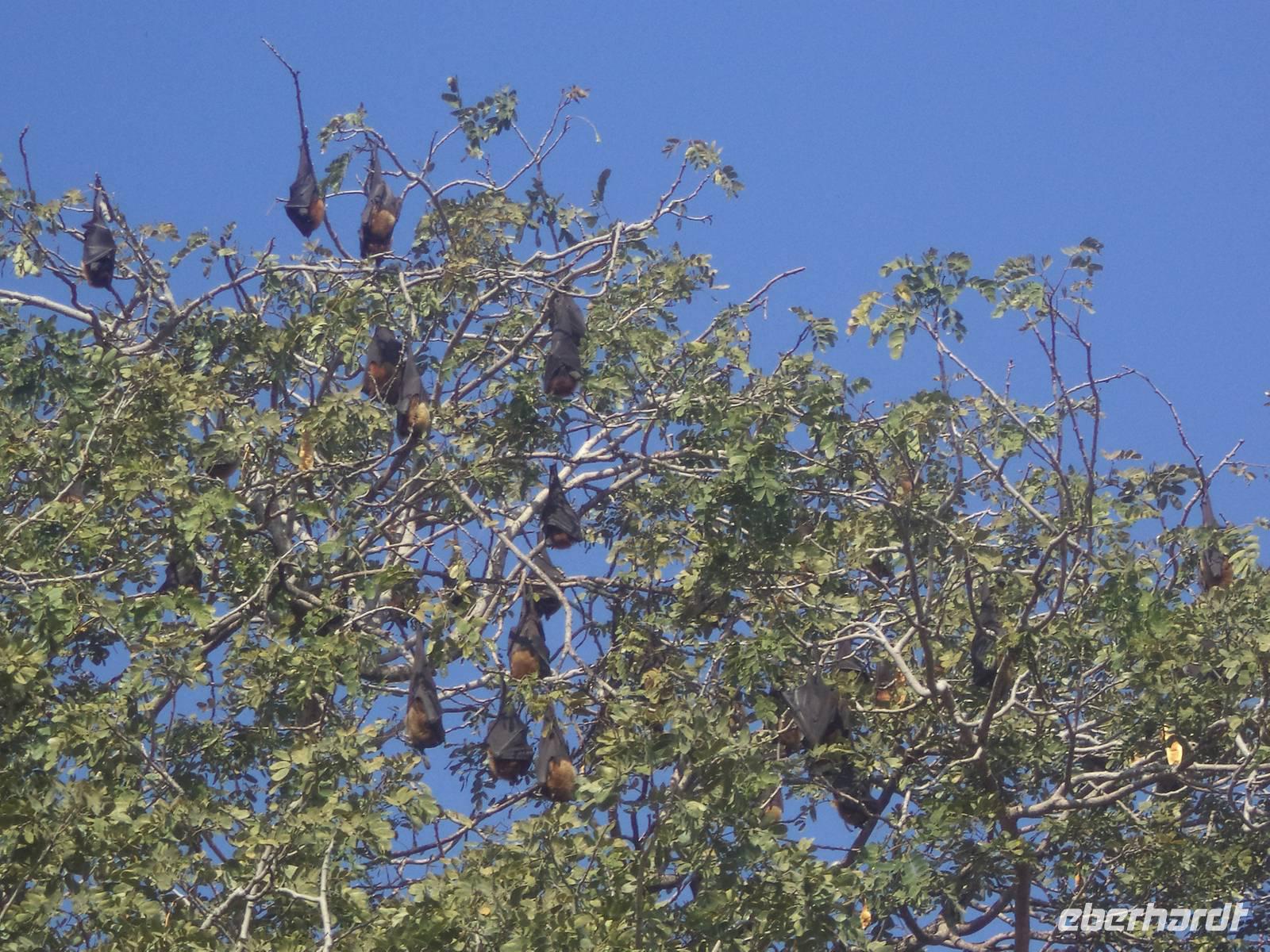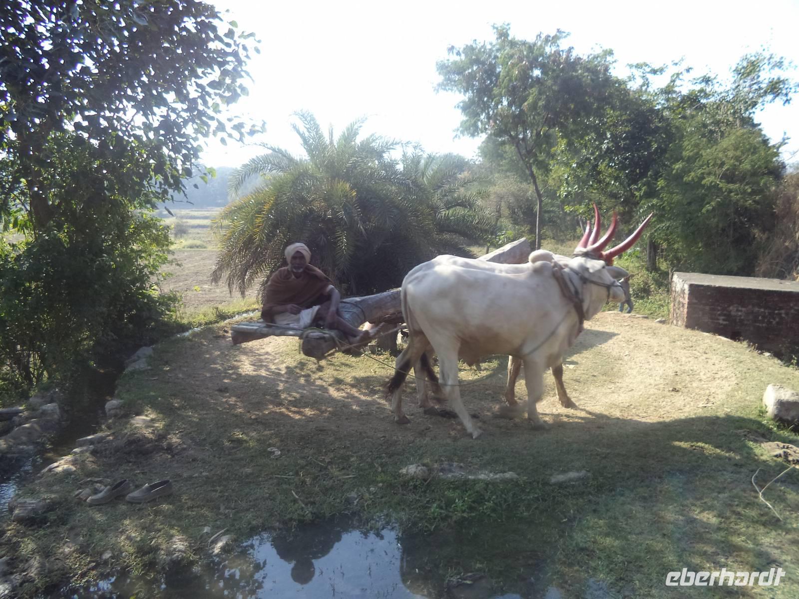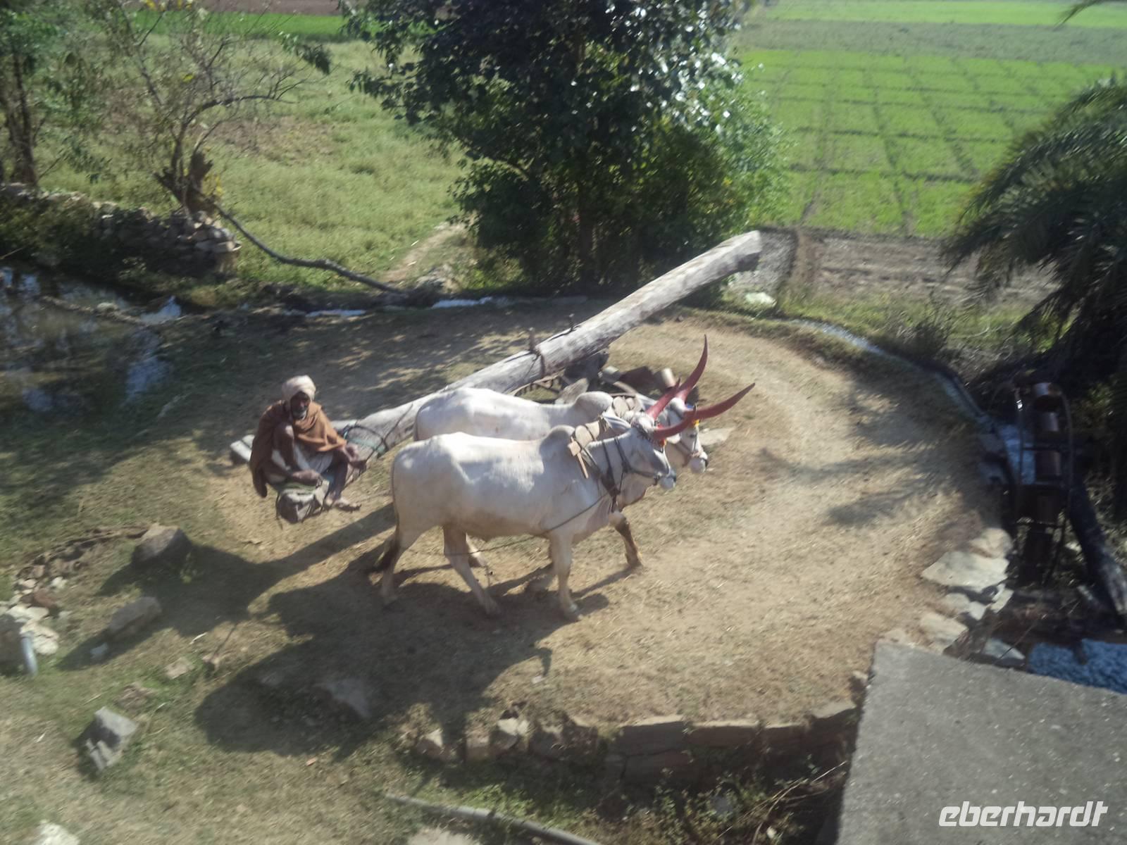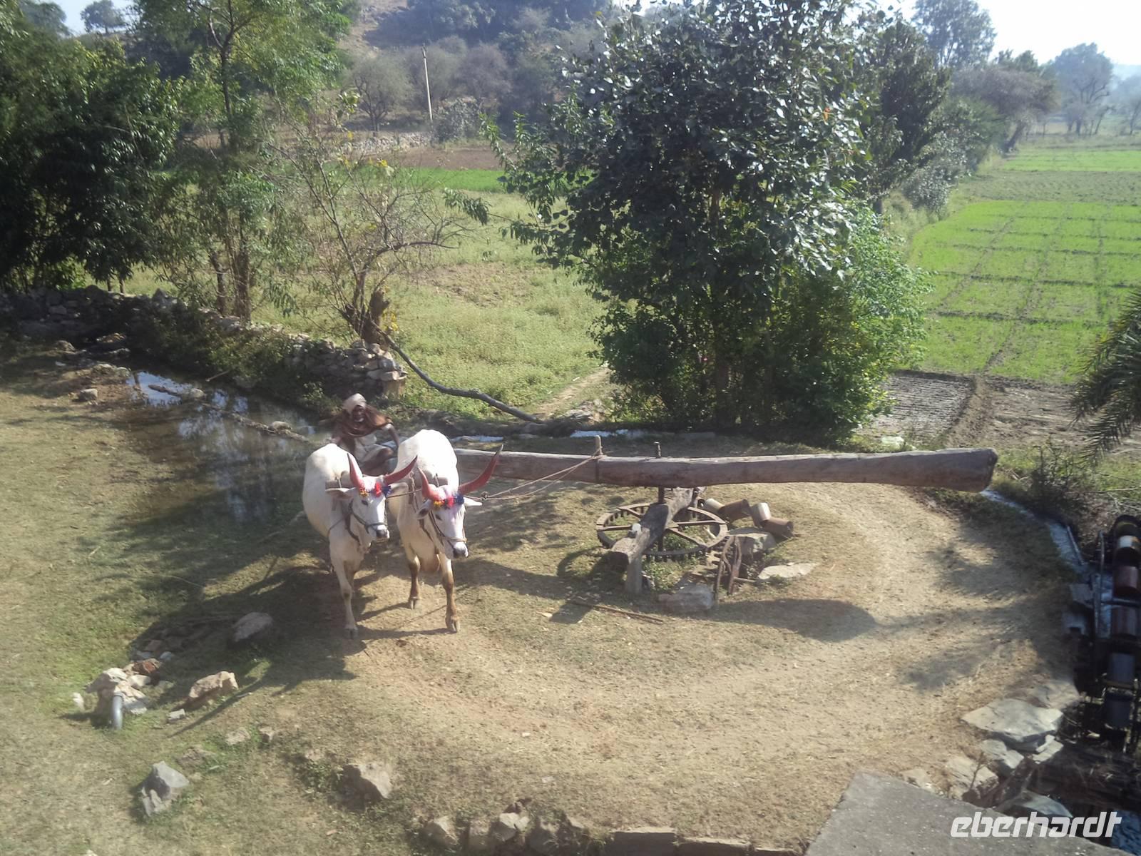 Bei der heutigen Busfahrt war zunächst Ranakpur mit seinen herrlic verzierten Tempeln der Jain-Religion unser Ziel. Unterwegs gab es zunächst einen Fotostopp an einem Baum, den tagsüber viele Flughunde in ihrer Ruhephase bevölkern und danach hielten wir an einer der historischen Wasserschöpf-Anlagen, die sich hier in den felsigen und normalerweise wasserarmen Höhenzügen des Aravalli-Gebirges finden. Nach ergiebigem Monsunregen erhalten sich aber viele Teiche und Wasserlöcher und an einigen Stellen gibt es Quell- und Grudwasser-Seen, aus denen die Bauern seit den Zeiten der arischen Eroberung vor über viertausend Jahren Wasser schöpfen, das dann über Kanäle verteilt, ihre kargen Felder bewässert. An langen „Förderbändern", die über ein großes Holzrad laufend senkrecht bis zum Wasser reichen, hängen die Schöpfkrüge, während das die Förderkette bewegende Schöpfrad über ein klug erdachtes, wenn auch etwas primitiv wirkendes System von Zahnrädern bewegt wird - diese wiederum angetrieben durch ein Ochsengespann in einer Art Göpel-Anlage (die es in Europa so erst seit dem Mittelalter gibt).
