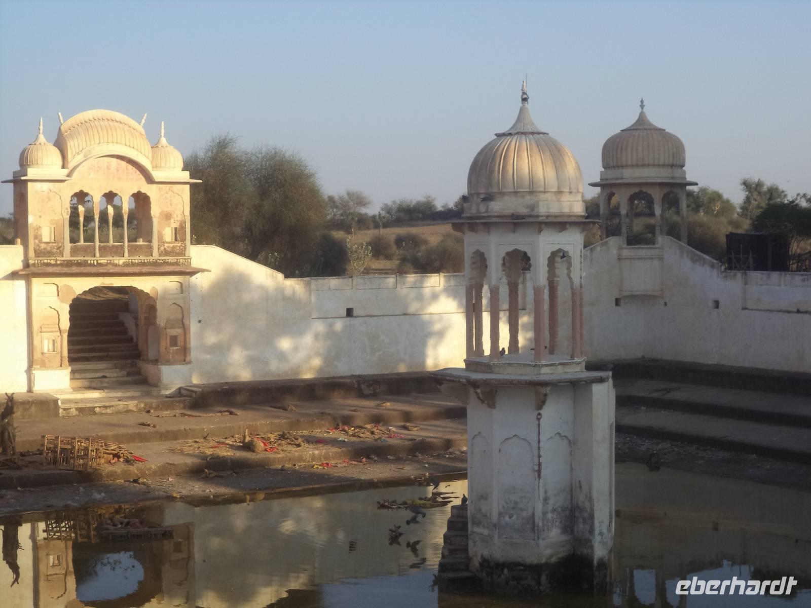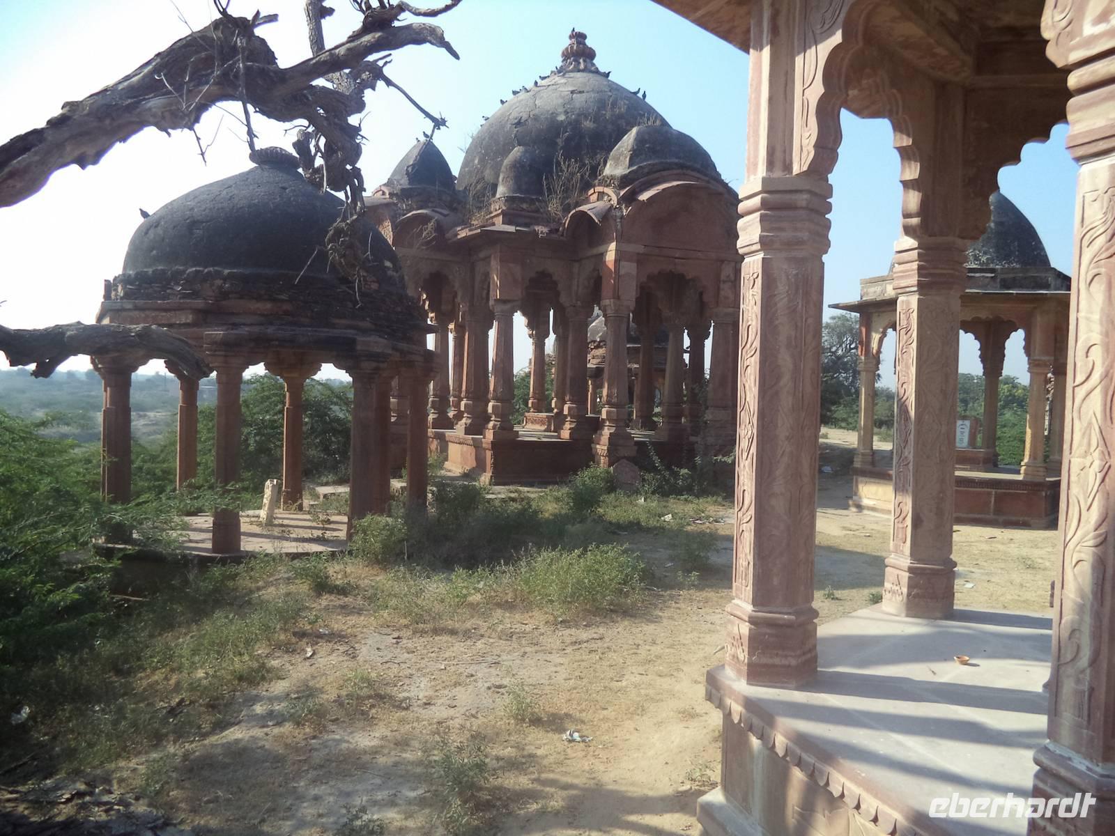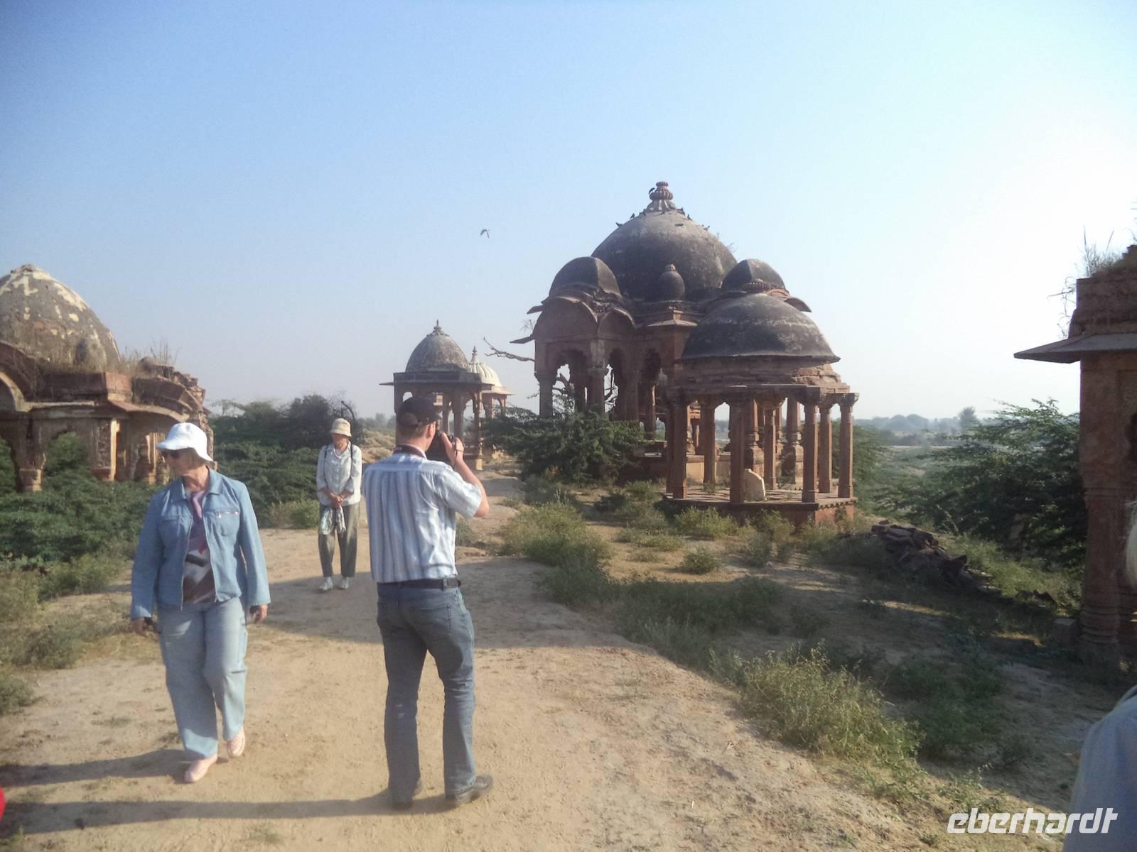 Eine halbtägige Jeepsafari am Vormittag gab unseren Gästen die Möglichkeit, mehr vom Leben auf dem Land mitzubekommen und dennoch - etwas später - ein bisschen Erholung zu suchen. Alle Gäste haben die Möglichkeit genutzt, hier mehr vom „echten" Indien zu erleben : mit ein paar Jeeps fuhren wir querfeldein durch die Steppe, sahen Antilopen und Springböcke und machten einen kleinen Bummel zu den Überresten der traditionellen historischen Verbrennungsstätten der Rajas von Khejrela. Um den Körper der Verstorbenen nach Hindusitte in den fünf Elementen (Erde, Feuer, Wasser, Luft und Universum) aufgehen zu lassen, werden Hindus verbrannt. Bei wichtigen Persönlichkeiten erinnert an der Stätte ihrer Einäscherung eine steinerne Plattform, später mit - ebenfalls steinernem - Baldachin versehen, an das Ereignis. Diese Cenotaphien, „Chhatris" genannt, sind die wichtigsten Gedenkstätten der Umgebung und wir konnten sie uns ansehen, bevor wir in ein traditionelles Dorf der Einheimischen fuhren. Die Gewohnheit, dass sich die Männer hier mitunter zu gemeinsamen Zeremonien treffen, hatte man für uns ein wenig nachgestellt, aber der Eindruck, einen Einblick in authentisches Dorfleben des Stammes der Bishnoi zu erhalten, blieb. Unser Halbtagesprogramm „Jeepsafari" endete an einem weithin sichtbaren Felsenheiligtum mit mehreren uralten Tempeln und bis zur Unkenntlichkeit mit Opfergaben verschmierten Reliefs in einem als Picknick organisierten Mittagessen. Der Nachmittag aber war dann wirklich der Erholung vorbehalten und wir verbrachten Rest des Tages faulenzend am Pool.