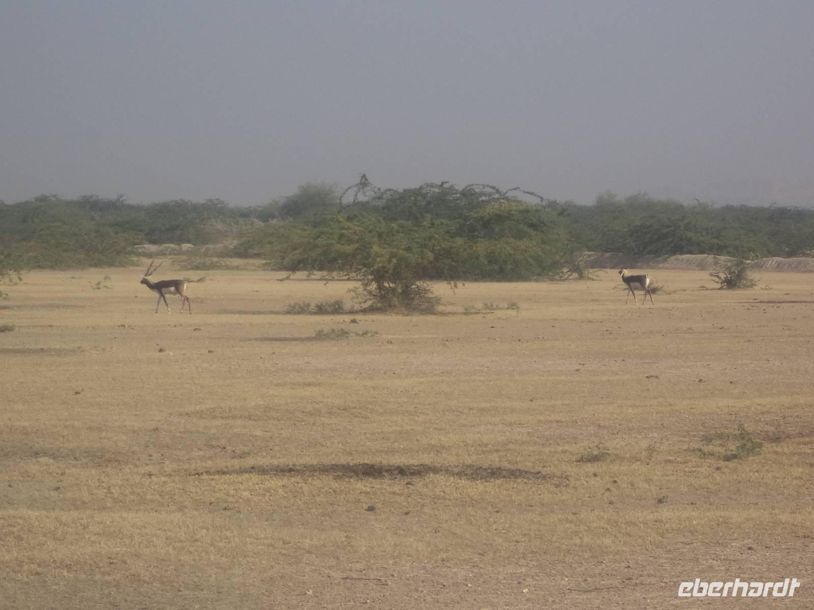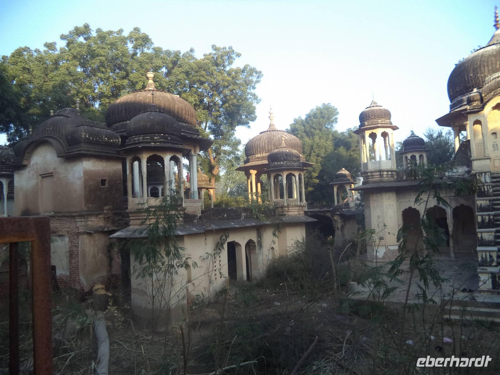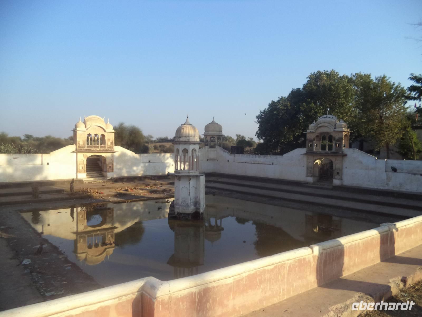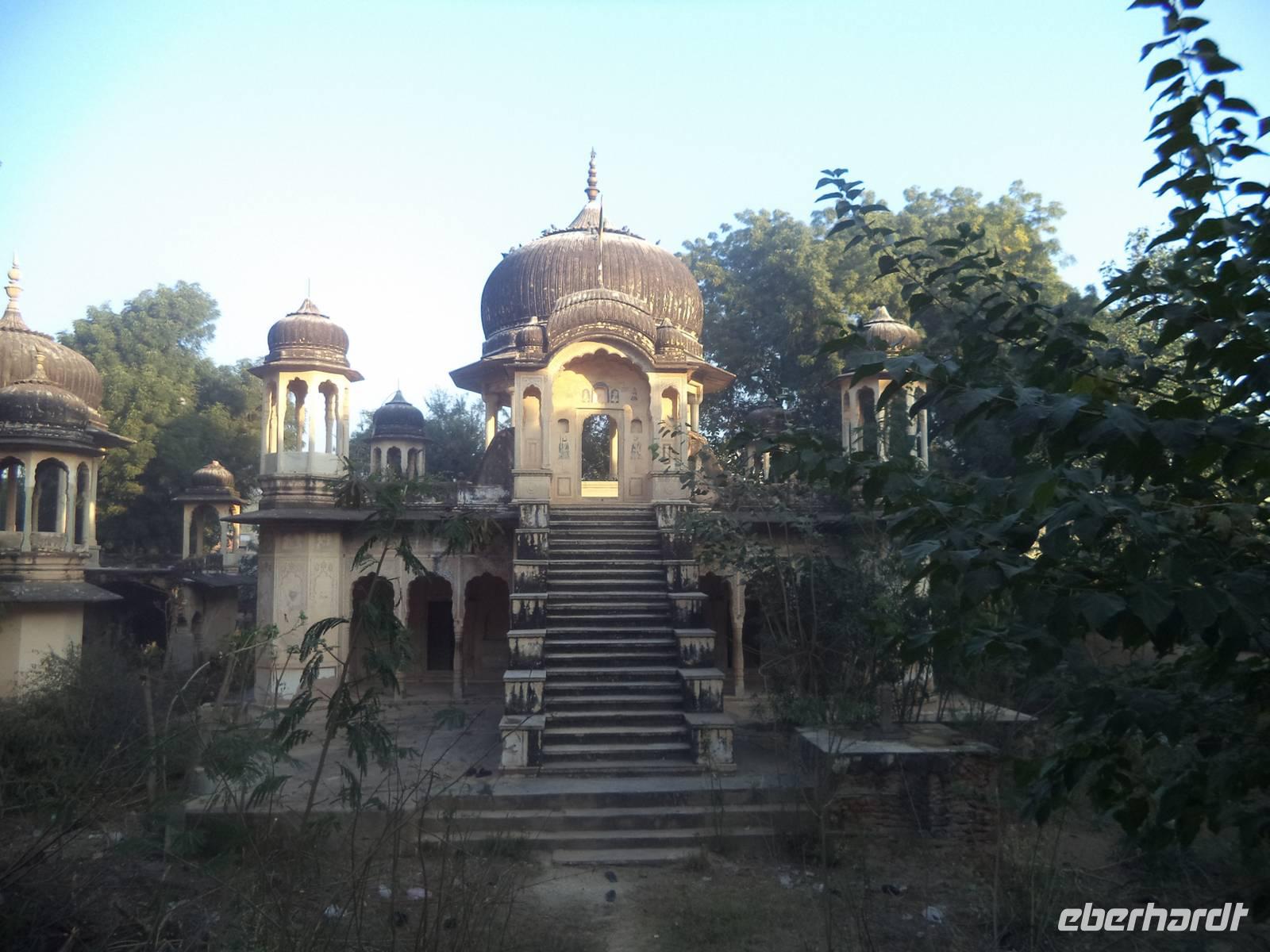 Eine halbtägige Jeepsafari am Vormittag gab unseren Gästen die Möglichkeit, mehr vom Leben auf dem Land mitzubekommen und dennoch - etwas später - ein bisschen Erholung zu suchen. Alle Gäste haben die Möglichkeit genutzt, hier mehr vom „echten" Indien zu erleben : mit ein paar Jeeps fuhren wir querfeldein durch die Steppe, sahen Antilopen und Springböcke und machten einen kleinen Bummel zu den Überresten der traditionellen historischen Verbrennungsstätten der Rajas von Khejrela. Um den Körper der Verstorbenen nach Hindusitte in den fünf Elementen (Erde, Feuer, Wasser, Luft und Universum) aufgehen zu lassen, werden Hindus verbrannt. Bei wichtigen Persönlichkeiten erinnert an der Stätte ihrer Einäscherung eine steinerne Plattform, später mit - ebenfalls steinernem - Baldachin versehen, an das Ereignis. Diese Cenotaphien, „Chhatris" genannt, sind die wichtigsten Gedenkstätten der Umgebung und wir konnten sie uns ansehen, bevor wir in ein traditionelles Dorf der Einheimischen fuhren. Die Gewohnheit, dass sich die Männer hier mitunter zu gemeinsamen Zeremonien treffen, hatte man für uns ein wenig nachgestellt, aber der Eindruck, einen Einblick in authentisches Dorfleben des Stammes der Bishnoi zu erhalten, blieb. Unser Halbtagesprogramm „Jeepsafari" endete an einem weithin sichtbaren Felsenheiligtum mit mehreren uralten Tempeln und bis zur Unkenntlichkeit mit Opfergaben verschmierten Reliefs in einem als Picknick organisierten Mittagessen. Der Nachmittag aber war dann wirklich der Erholung vorbehalten und wir verbrachten Rest des Tages faulenzend am Pool.