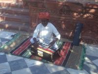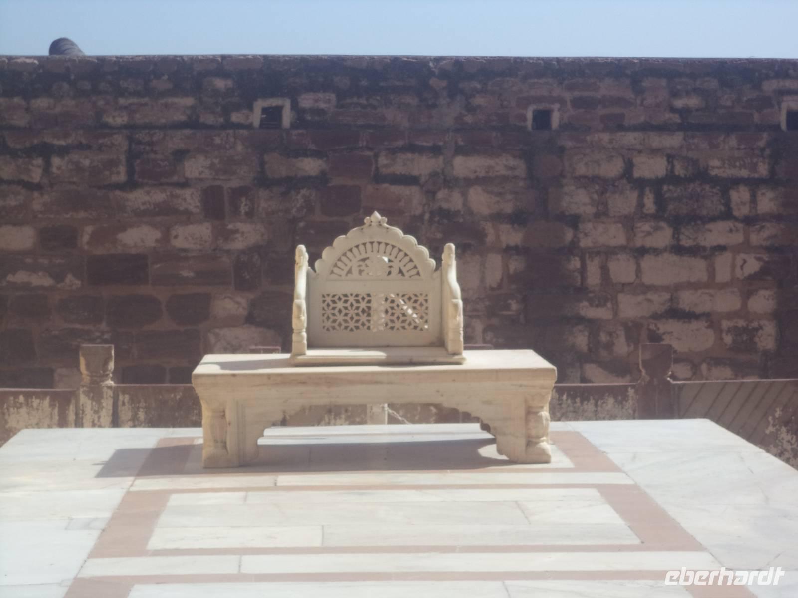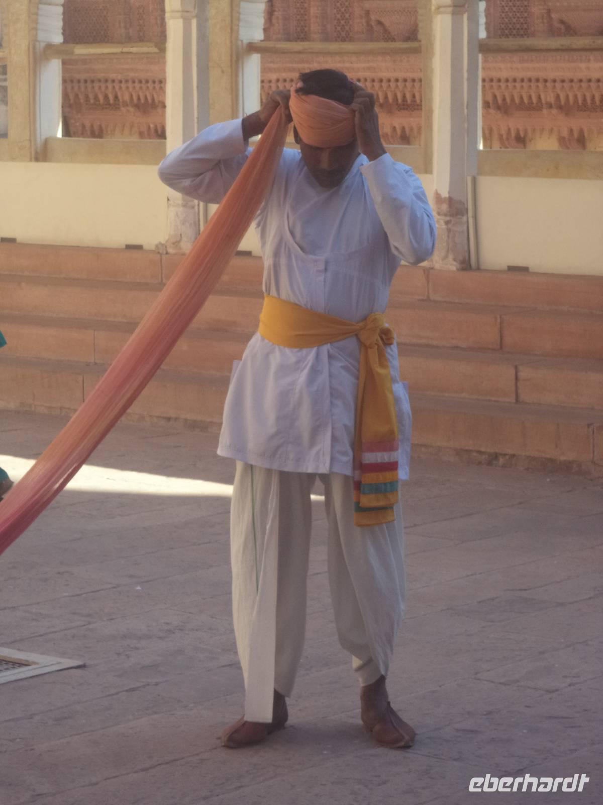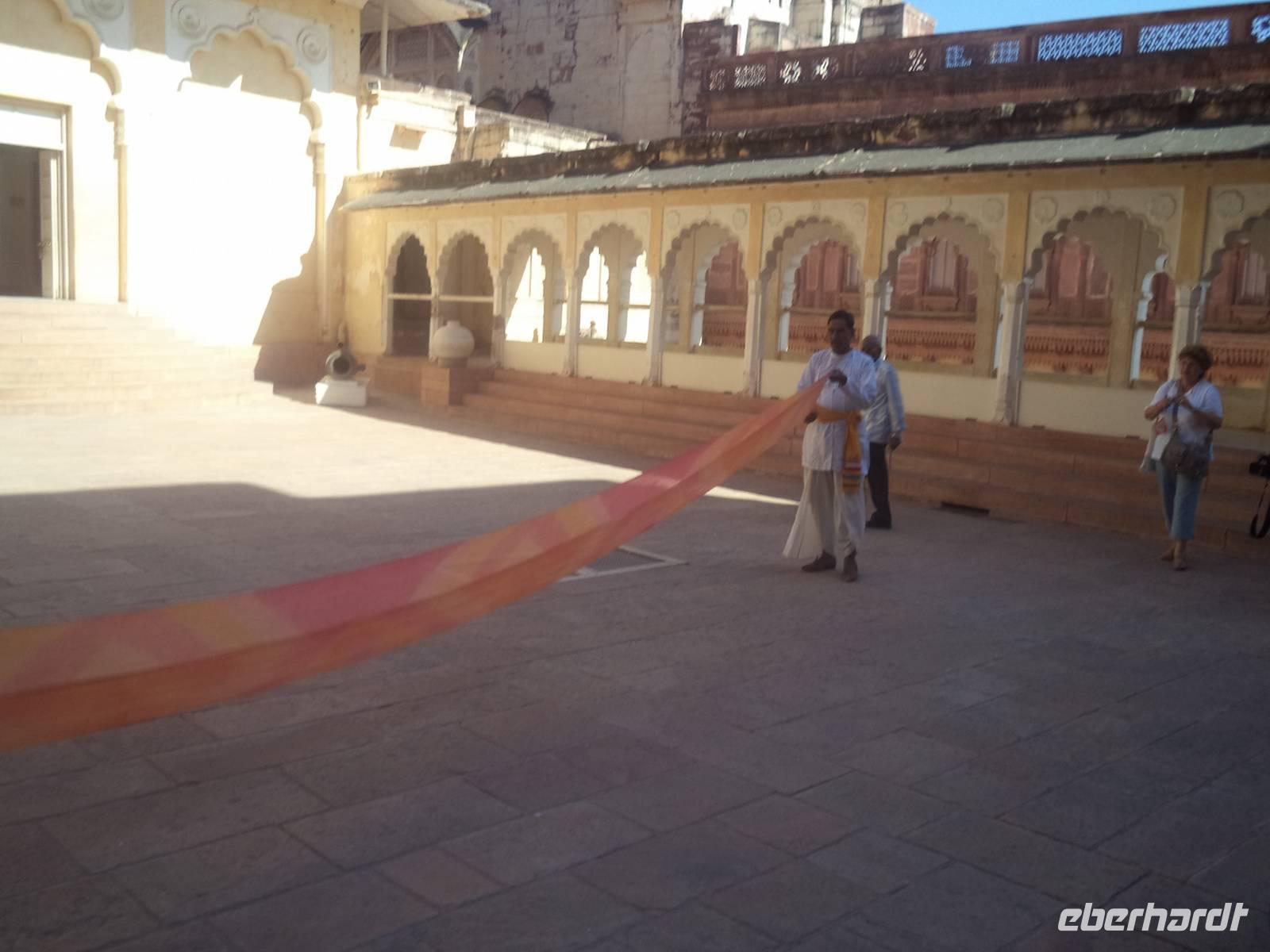 Das zweite Wahrzeichen ist das hoch auf einem Felsen liegende, nie eroberte Meherangarh Fort, einst Residenzschloss und Felsenfeste von Jodhpur. Insgesamt über fast zehn Kilometer erstrecken sich die gewaltigen Wehrmauern mit acht Toren und umschließen die Festung, 300 m hoch über der Stadt auf einem Felsen thronend. Wir begannen unseren Besuch mit einer Fahrstuhlfahrt, die uns den beschwerlichen Aufstieg ersparte. Der Königliche Palast, überall reich verziert mit schönen Ausblicken auf die „blaue" Stadt Jodhpur, enthält auch noch den alten Audienzhof mit dem historischen Marmorthron von Jodhpur. Nachdem uns die Palastwache vorgeführt hatte wie man einen Turban wickelt - er besteht aus einer acht bis neun Meter langen Stoffbahn, die ihr Träger sich gekonnt um den Kopf legt - machten wir einen Rundgang durch die Prunk- und Repräsentationsgemächer des alten Staates Marwar.
