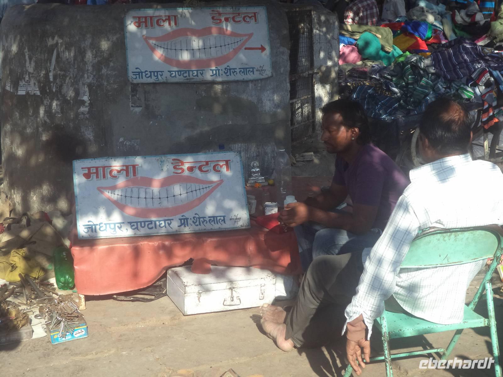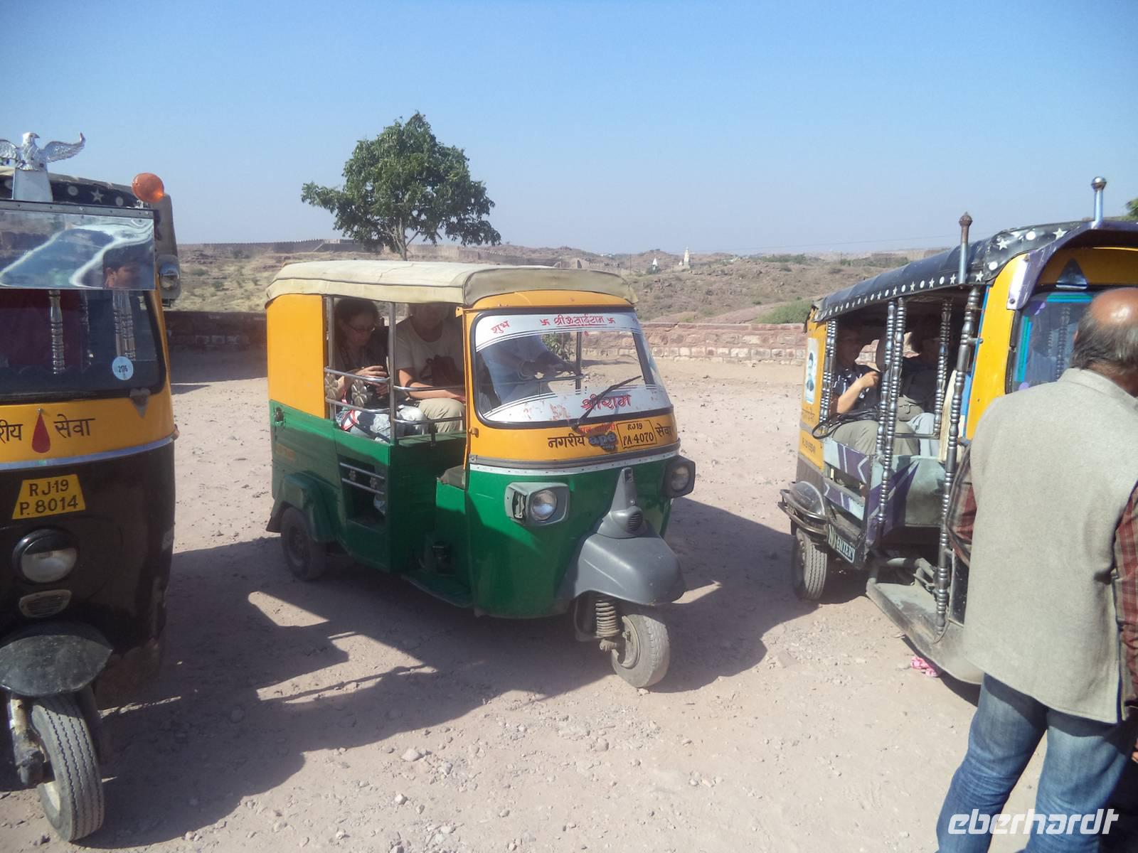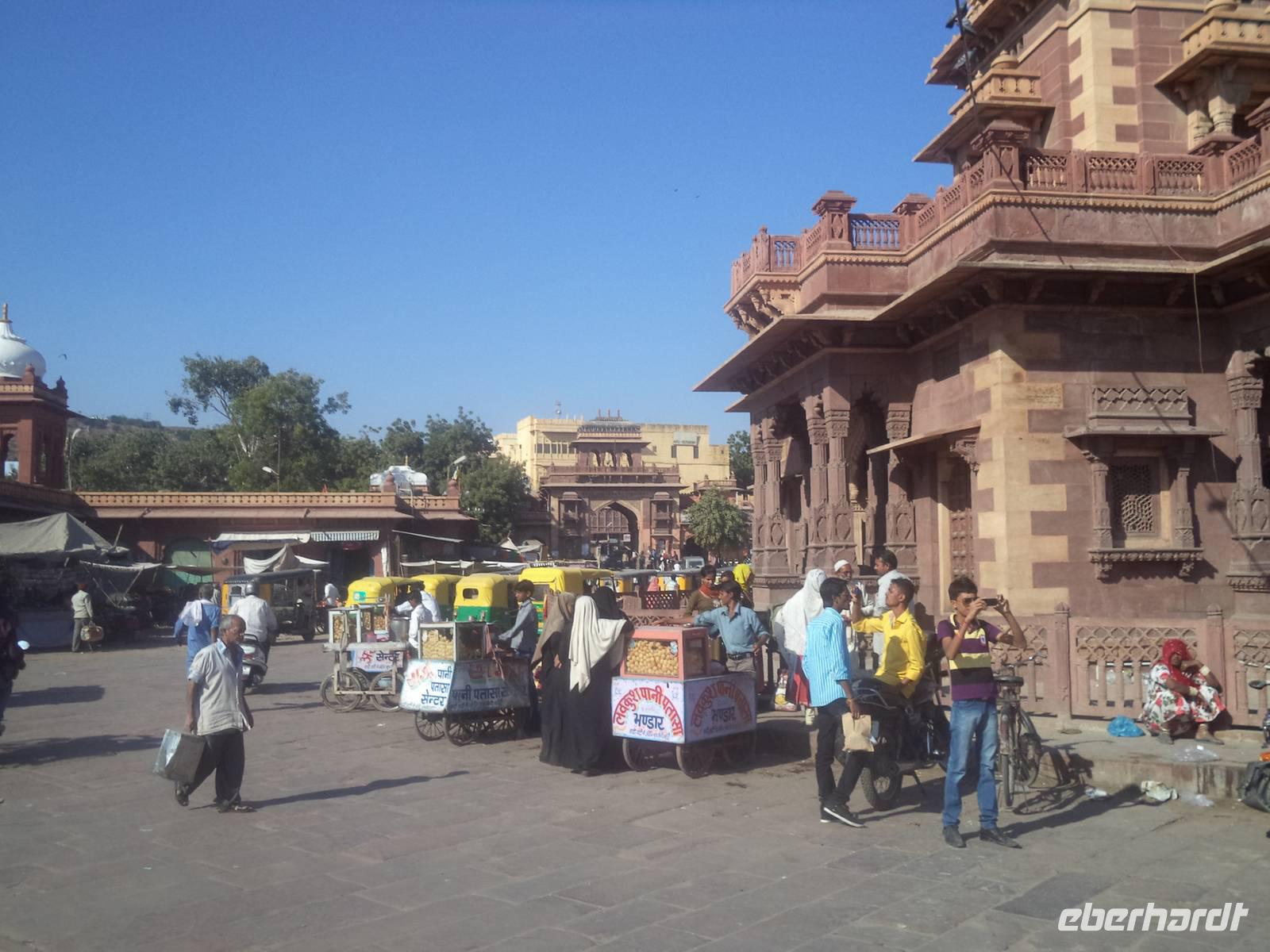 Dann begaben wir uns in spontan angemieteten Dreiradtaxis in die engen Gassen der Altstadt von Jodhpur. Ein bekannten Gewürzhändler war unser Ziel und hier erfuhren die Gäste vieles zu den „Masalas", den indischen Gewürzmischungen und auch ein wenig über die indische Art zu kochen. In der anschließenden Freizeit erlebten unsere Gäste den vielleicht buntesten und aufregendsten Markt von Rajasthan. Aufgebaut wie einst die mittelalterlichen Märkte in Europa bietet er von Lebensmitteln, Obst und Gemüse bis zu Kleidung und Einrichtungsgegenständen alles was man sich vorstellen kann - auch ein Paar Sandalen kann man sich hier im Handumdrehen anfertigen lassen - wahlweise aus Leder oder alten Autoreifen...