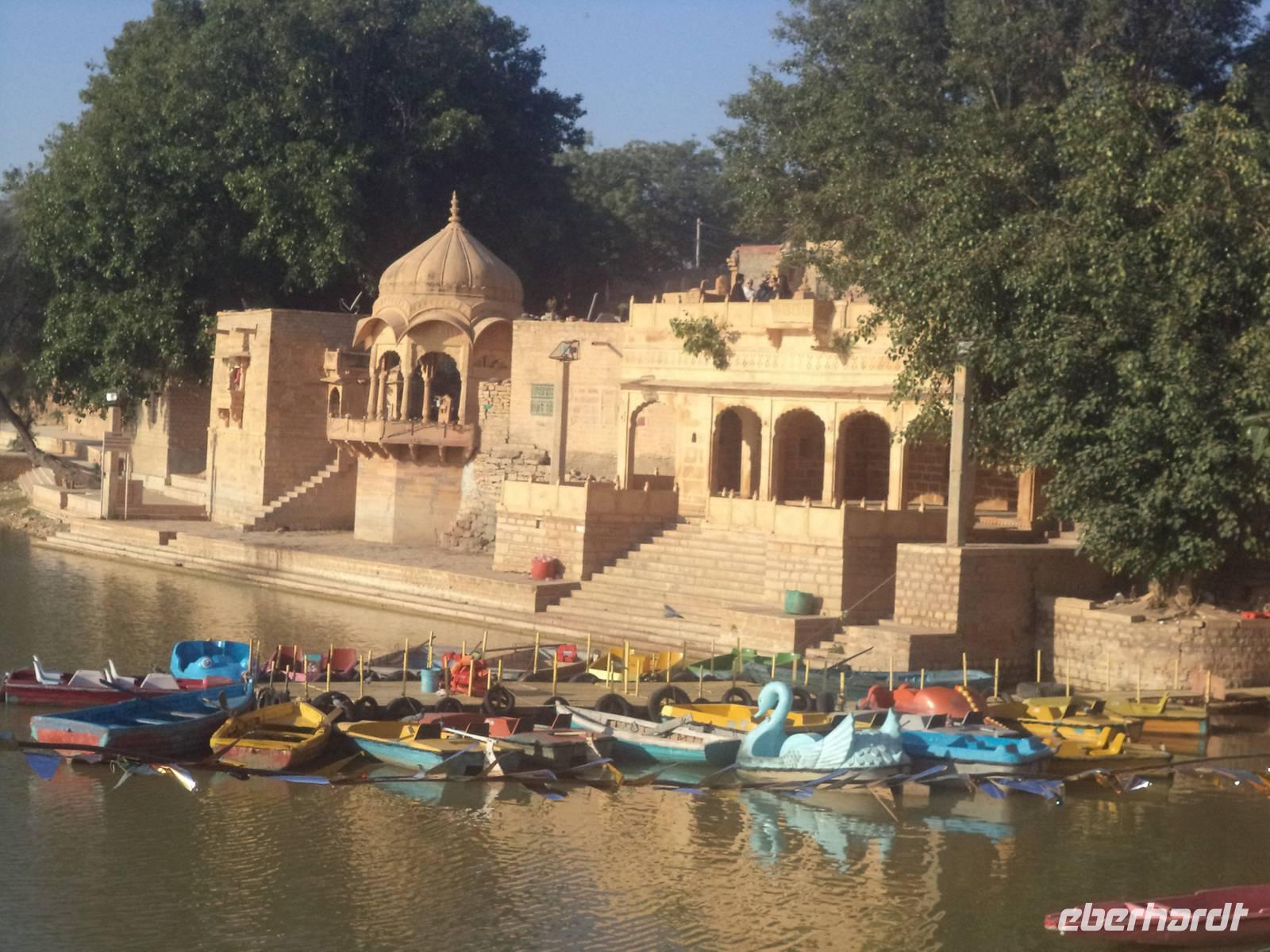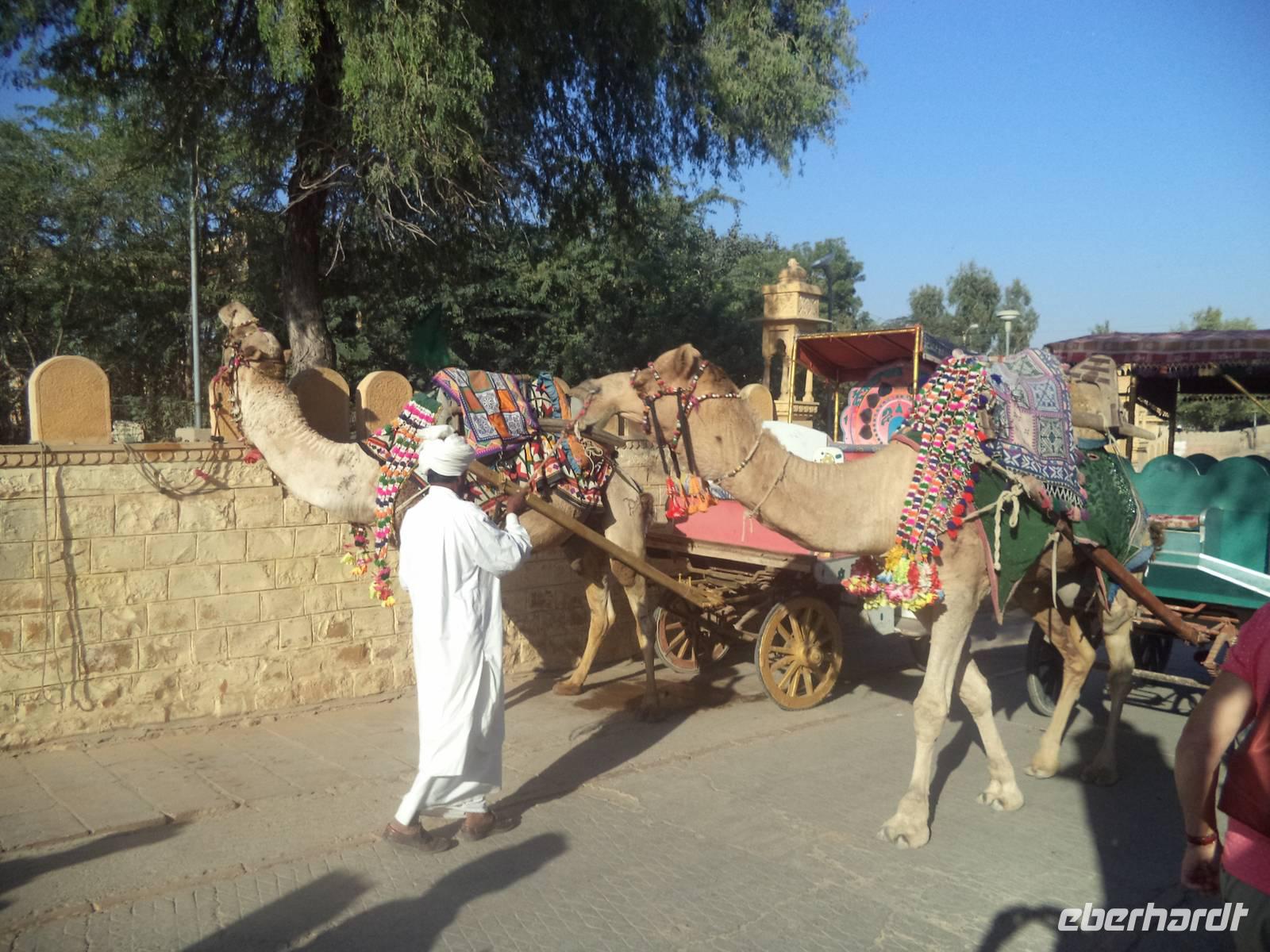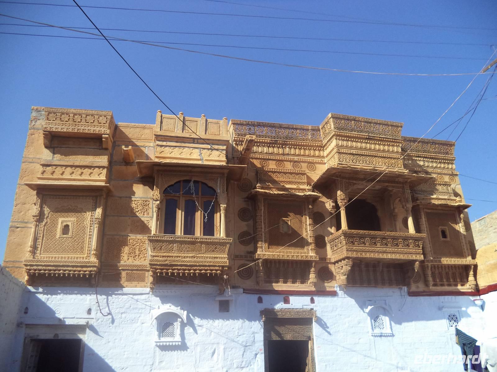 Ein kurzer Stopp am „heiligen" See vor den Toren Jaisalmers bildete den Auftakt der Besichtigung, ein Tempelkomplex nahe einem mitten in der Wüste angelegten Monsunstausee mit altem Tor und einem Shivatempel angelegt. Dann erreichten wir die Türme und doppelten Mauern der Altstadt-Zitadelle, bis heute aufregendes Prunkstück indischer Festungsarchitektur. Die von mehrere Dutzend Meter hohen Mauern umgebene Festungsstadt betraten wir durch ein beeindruckendes Tore-System und eine steile Zufahrtsstraße und besichtigten dann die Altstadt. Nicht zum ersten Mal machten wir dabei die Erfahrung, wie es ist, wenn heilige Kühe im Gegenverkehr herankommen. Eine Unmenge Fotomotive - herrliche geschnitzte Sandsteinfassaden der Wohnhäuser - machten die Stadtführung im Festungsinneren mit Blick auf den Stadtpalast zu einem Erlebnis. Später sahen wir uns dann - nach etwas Freizeit auf dem Zitadellenplatz - die Neustadt mit ihren „Havelis" an. Einst waren sie Paläste reicher Händler, mitunter auch Verwaltungsangestellter, Offiziere oder Adeliger und wurden auf einzigartige Weise mit wie Holzschnitt wirkenden filigran geschmückten Sandsteinfassaden voll kunstvoller Kerbschnitzerei verziert.