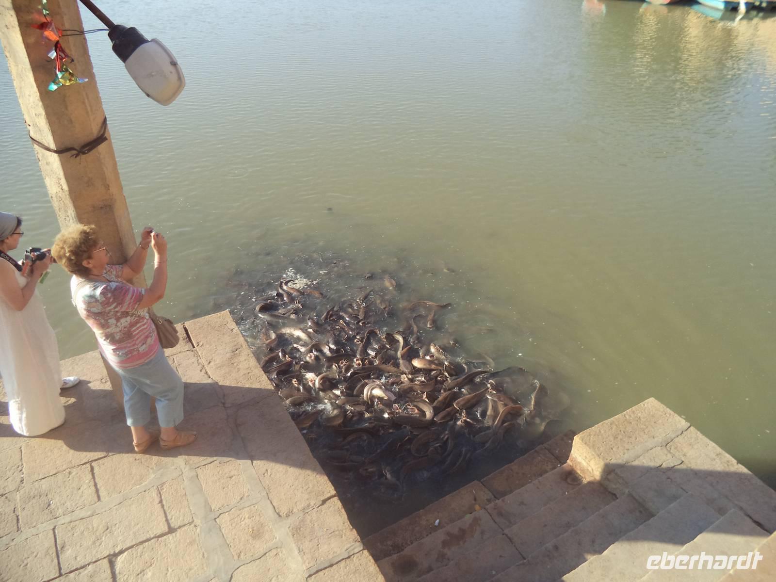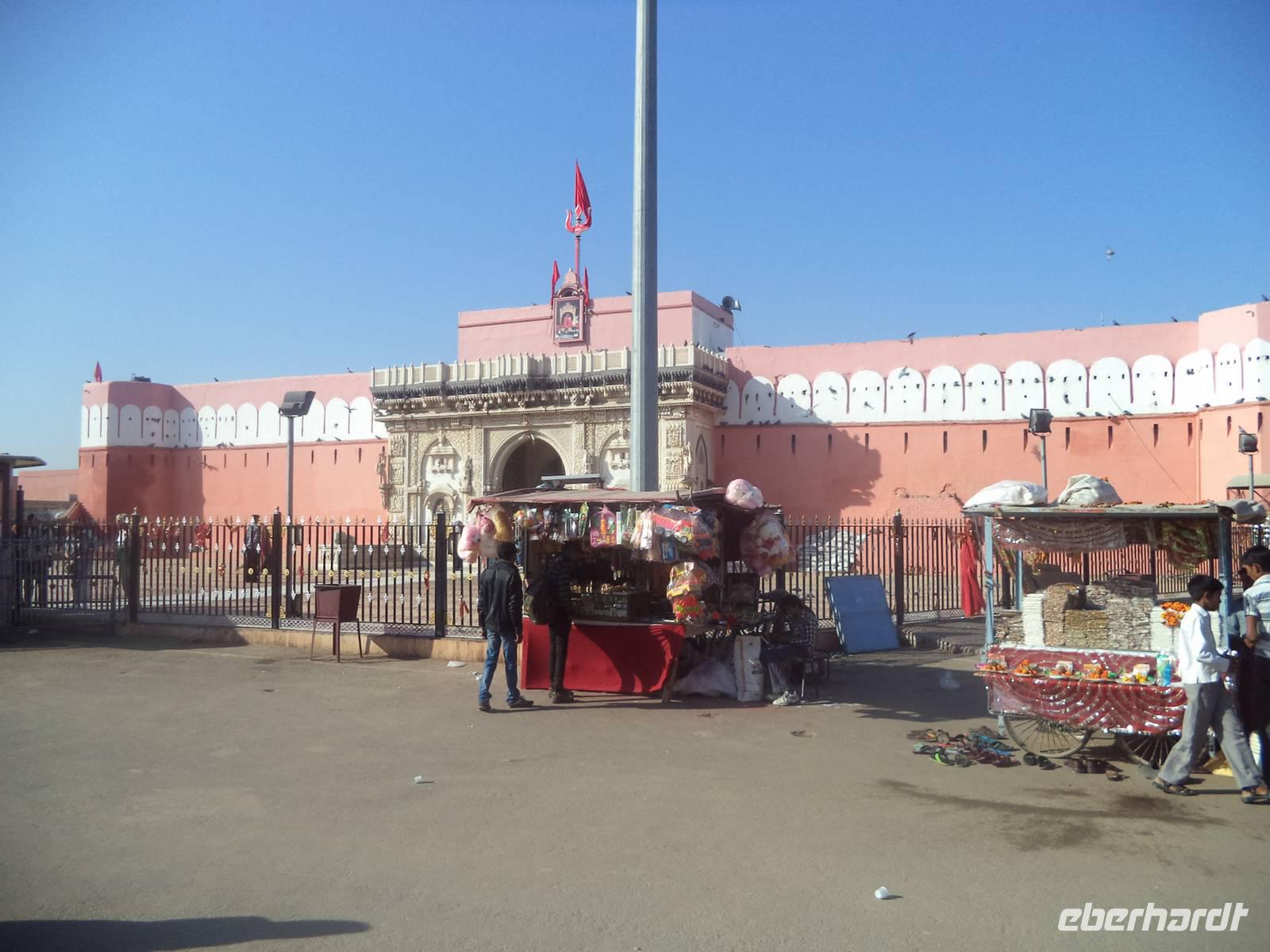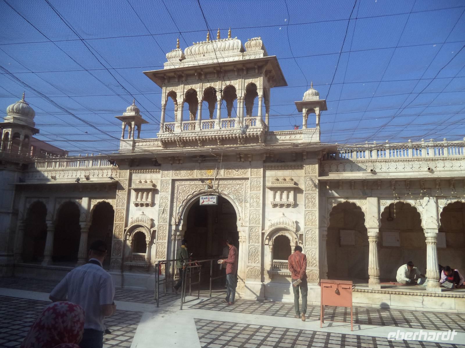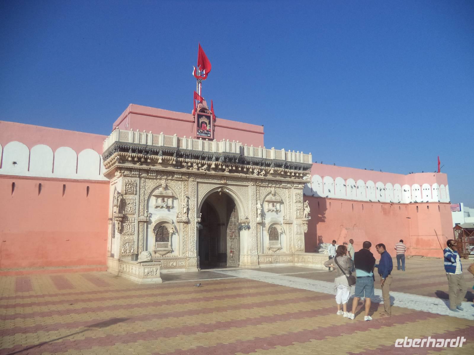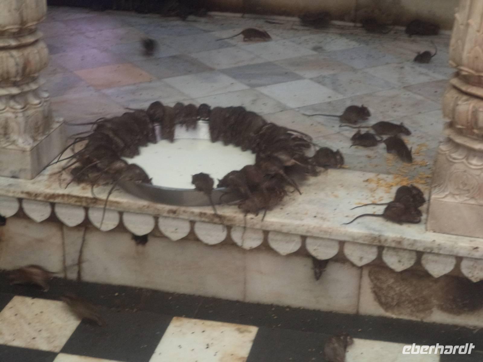 Heute begann der Tag mit einem Abstecher in die alte Stadt Deshnok, zum vielleicht stets am meisten diskutierten Programmpunkt. Da die Besichtigung des Rattentempels nicht jedermanns Sache ist, haben wir sie in unseren Katalogen „fakultativ" eingebaut. Der Besuch des „Rattentempels", in ganz Indien bekannt und bei zahllosen Pilgern das ganze Jahr über beliebt, ist für gläubige Hindus ein „Muss". Im Tempel der „Karni Mata", wo etwa zwanzigtausend freilaufende Ratten zu finden sind, wird eine Inkarnation der Fruchtbarkeitsgöttin Durga verehrt. Hier berichtet die Legende, dass die Ratten als Dichter wiedergeboren werden könnten. Da zum Hinduglauben die Verehrung jeglicher Art von Leben gehört, werden die Ratten hier wesentlich positiver gesehen als bei uns in Europa.