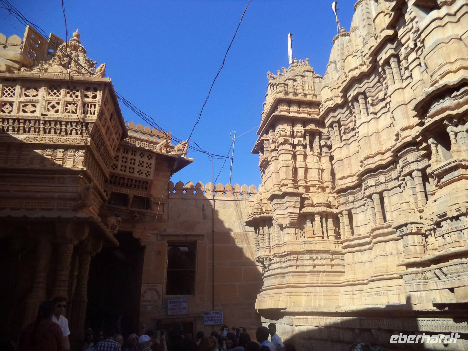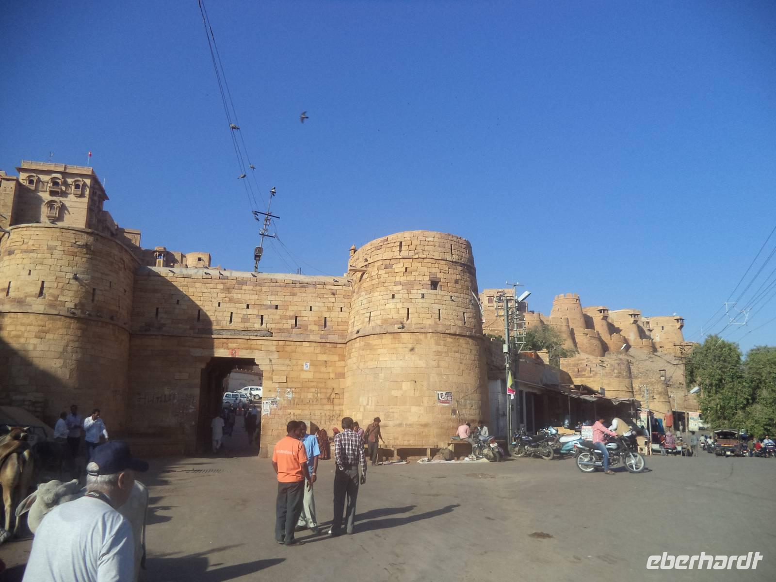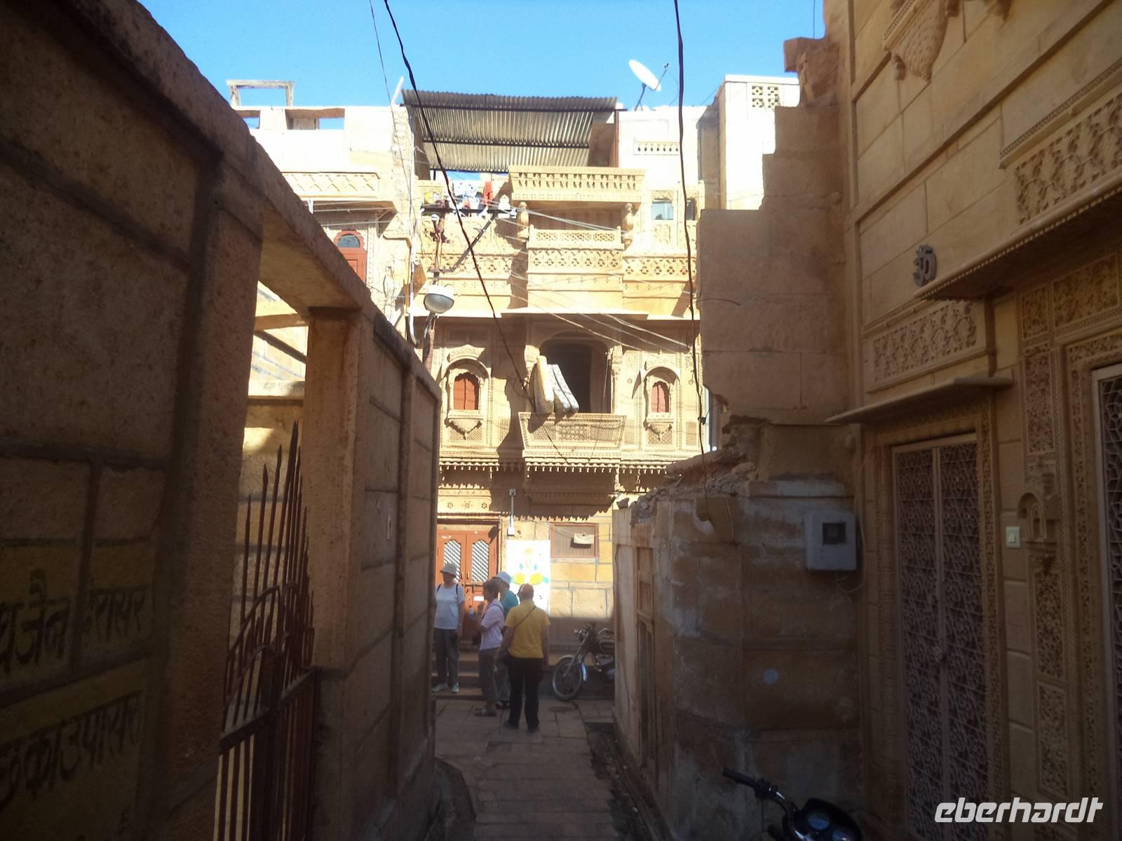 Der Tag begann mit einer ausführlichen Stadtbesichtigung der Altstadt von Jaisalmer. „Goldene Stadt" wird der Ort, der in Verbindung zur historischen Seidenstraße steht, wegen dem hier bevorzugten Baumaterial, dem honigfarbenen Sandstein, genannt. Aus dem sind die Mauern und auch die 99 Türme der Altstadtzitadelle errichtet worden, eine der größten, bis heute ununterbrochen bewohnten Festungen der Welt.