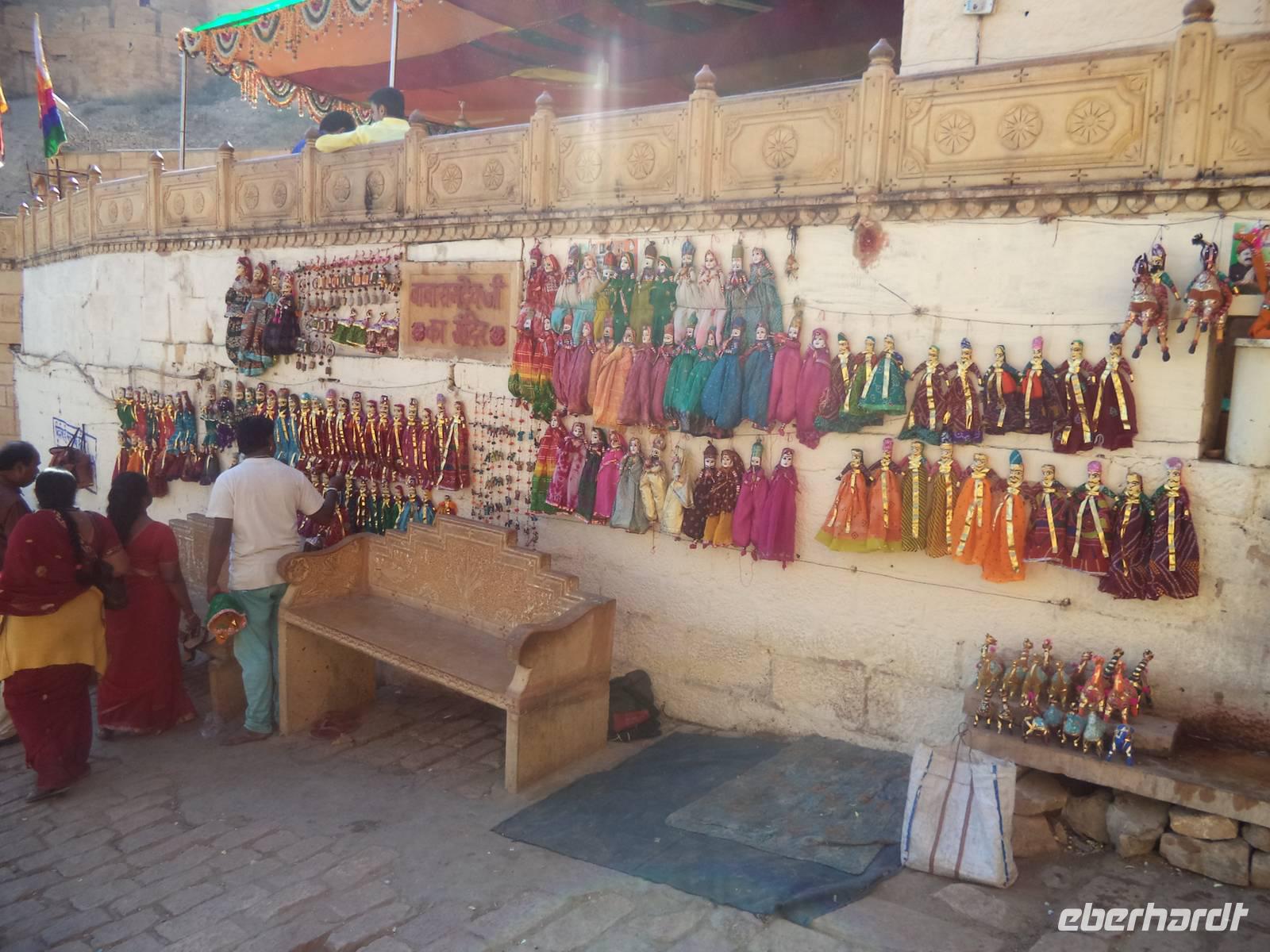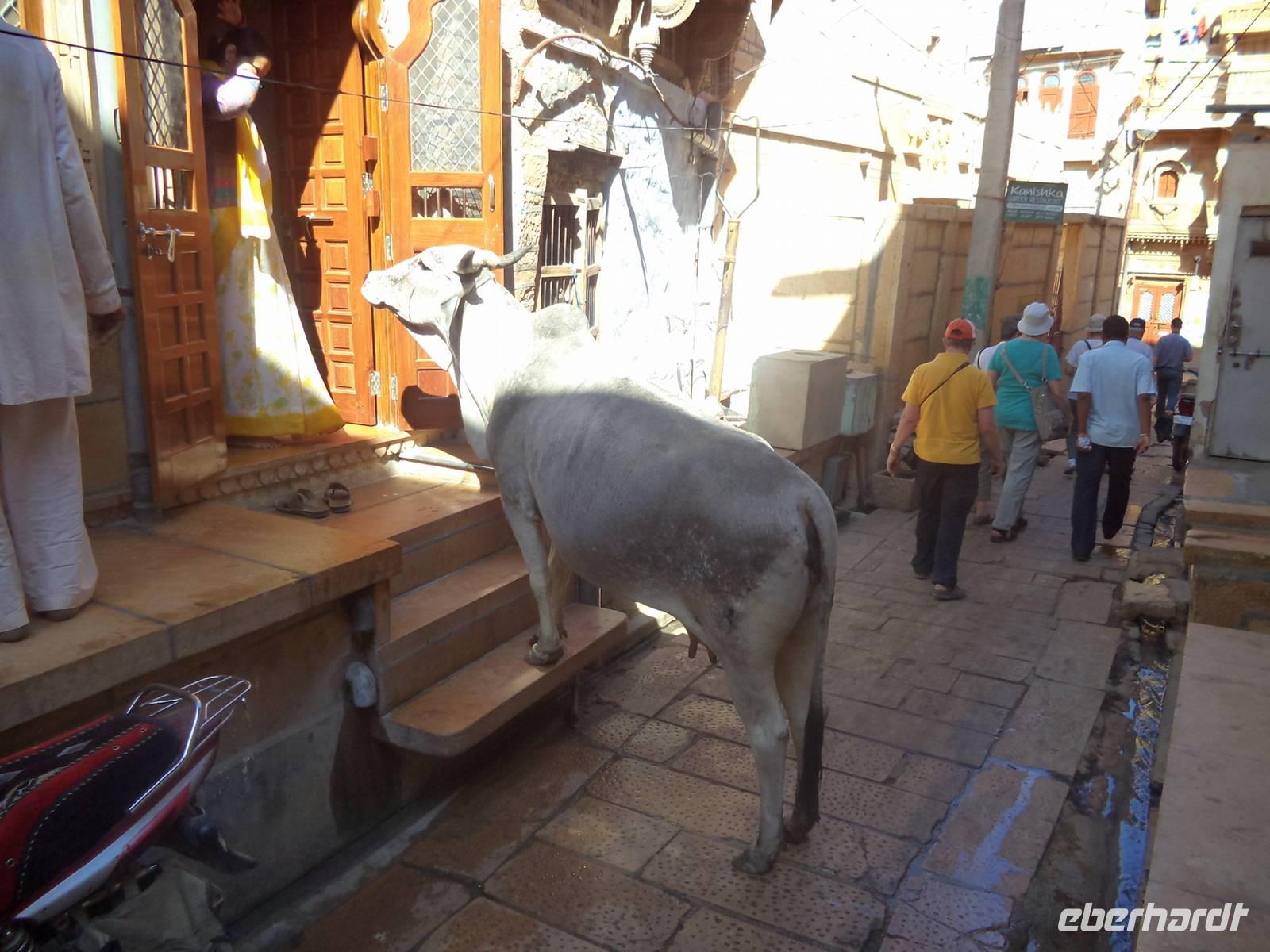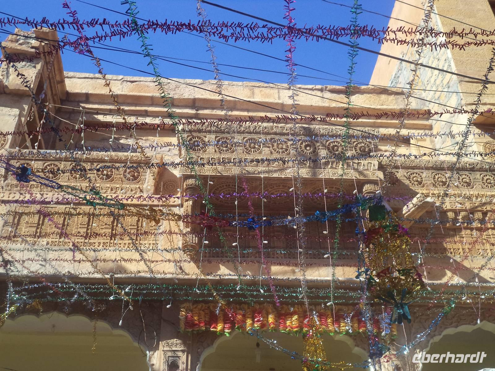 Der Tag begann mit einer ausführlichen Stadtbesichtigung der Altstadt von Jaisalmer. „Goldene Stadt" wird der Ort, der in Verbindung zur historischen Seidenstraße steht, wegen dem hier bevorzugten Baumaterial, dem honigfarbenen Sandstein, genannt. Aus dem sind die Mauern und auch die 99 Türme der Altstadtzitadelle errichtet worden, eine der größten, bis heute ununterbrochen bewohnten Festungen der Welt.