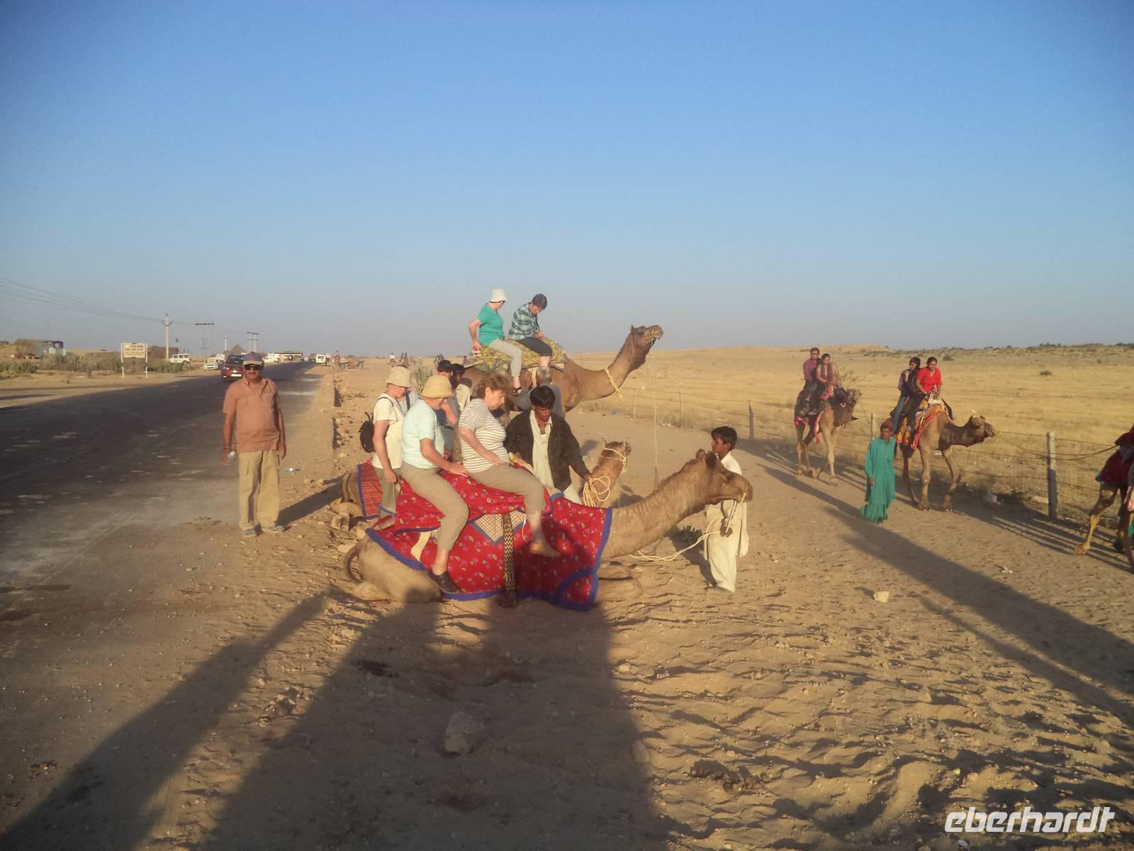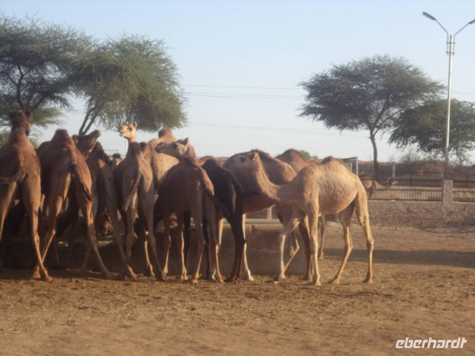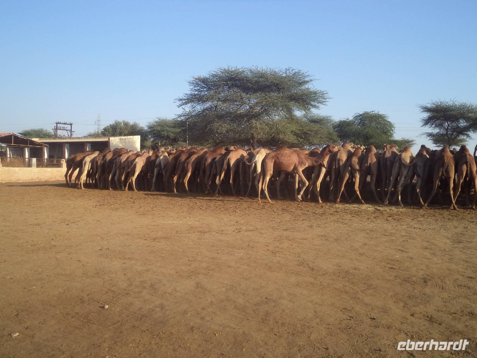Gegen 16.00 Uhr kamen wir dann zu Indiens einziger Kamelfarm. Die Dromedare waren gerade von den Weiden in die Ställe und zur Tränke geholt worden. Hier gibt es neben der Zuchtstelle für Rennkamele - zur speziellen Verwendung für die indischen Grenztruppen, ein staatliches Kamelforschungszentrum, eine Molkerei, ein „Kamel-Krankenhaus" und Souvenirshops. Während unseres Besuches sahen wir Jungtiere, Kamelbabies und Muttertiere., konnten uns aber auch mit verschiedenen Kamelrassen vertraut machen. Wie schon im Vorjahr gab es auch diesmal zu unserem Leidwesen nicht die sonst immer groß angekündigte Gelegenheit zur Verkostung von Kamelmilch und -eis.