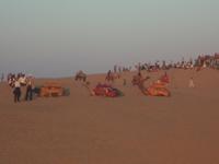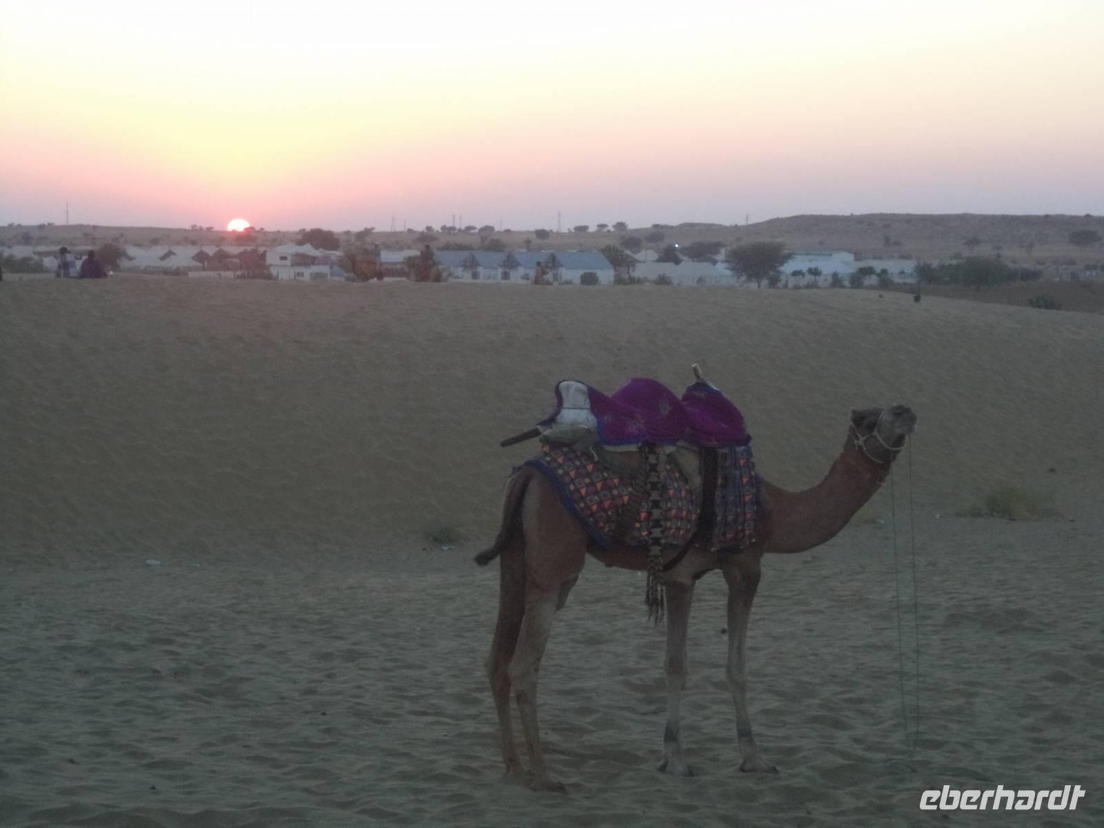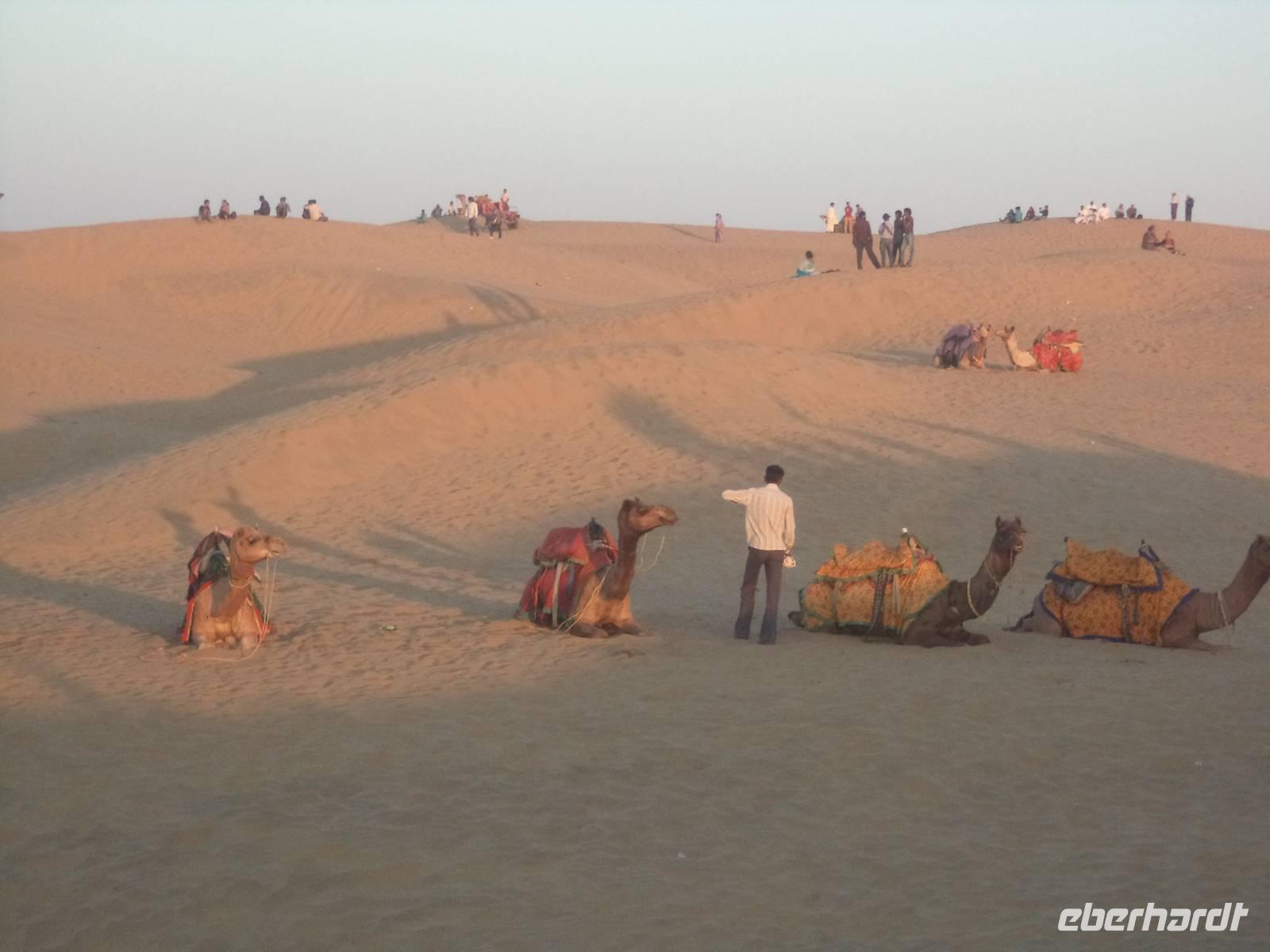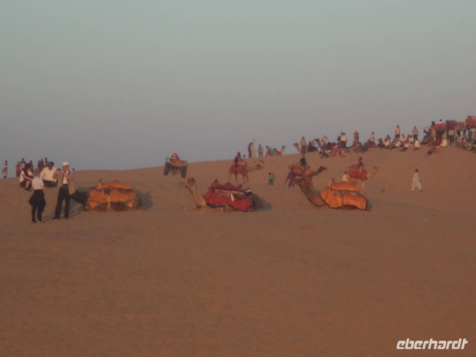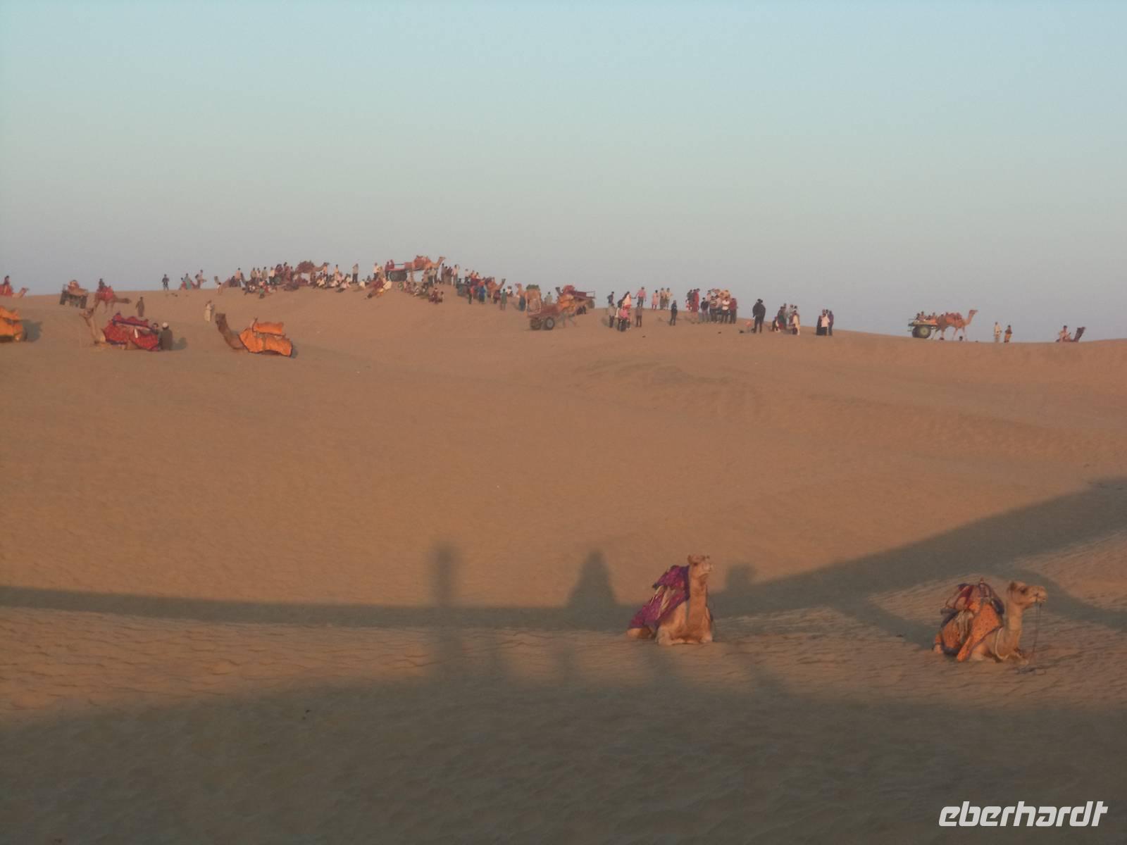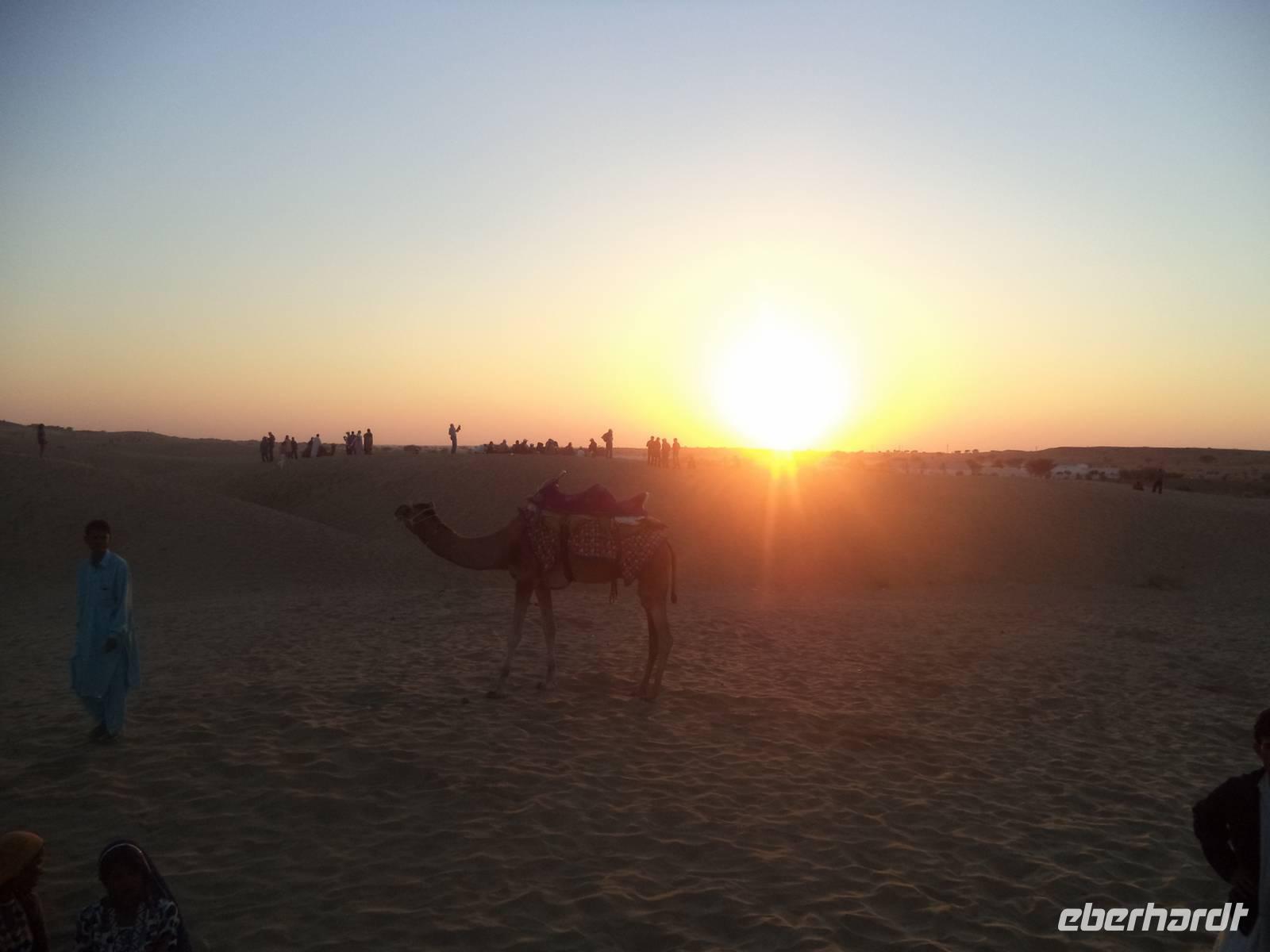 Später brachte uns der Bus in Richtung pakistanische Grenze ins Herz der Wüste Thar. Die ist etwa so groß wie Rumänien und gehört zu den unwirtlichsten Gebieten des indischen Subkontinents. Einen Eindruck davon sollten wir beim voll Spannung erwarteten Dromedarritt erhalten. Eine gute Stunde vor Sonnenuntergang hatten wir dann den Rastplatz der Reitkamele erreicht. Etwas zaghaft bestiegen wir die ungewöhnlichen Reittiere bzw. den bereitgestellten Kamelwagen. Etwa vierzig Minuten dauerte der Weg durch die Wüstensteppe bis zu den „richtigen" Sanddünen. Hier fand dann der erlebnisreiche Tag seinen Ausklang mit einem filmreifen Sonnenuntergang, untermalt durch die Darbietung von ein paar buntgekleideten Tänzerinnen und einem indischen Musiker, der uns mit einem Stück auf zwei Flöten gleichzeitig bezauberte.