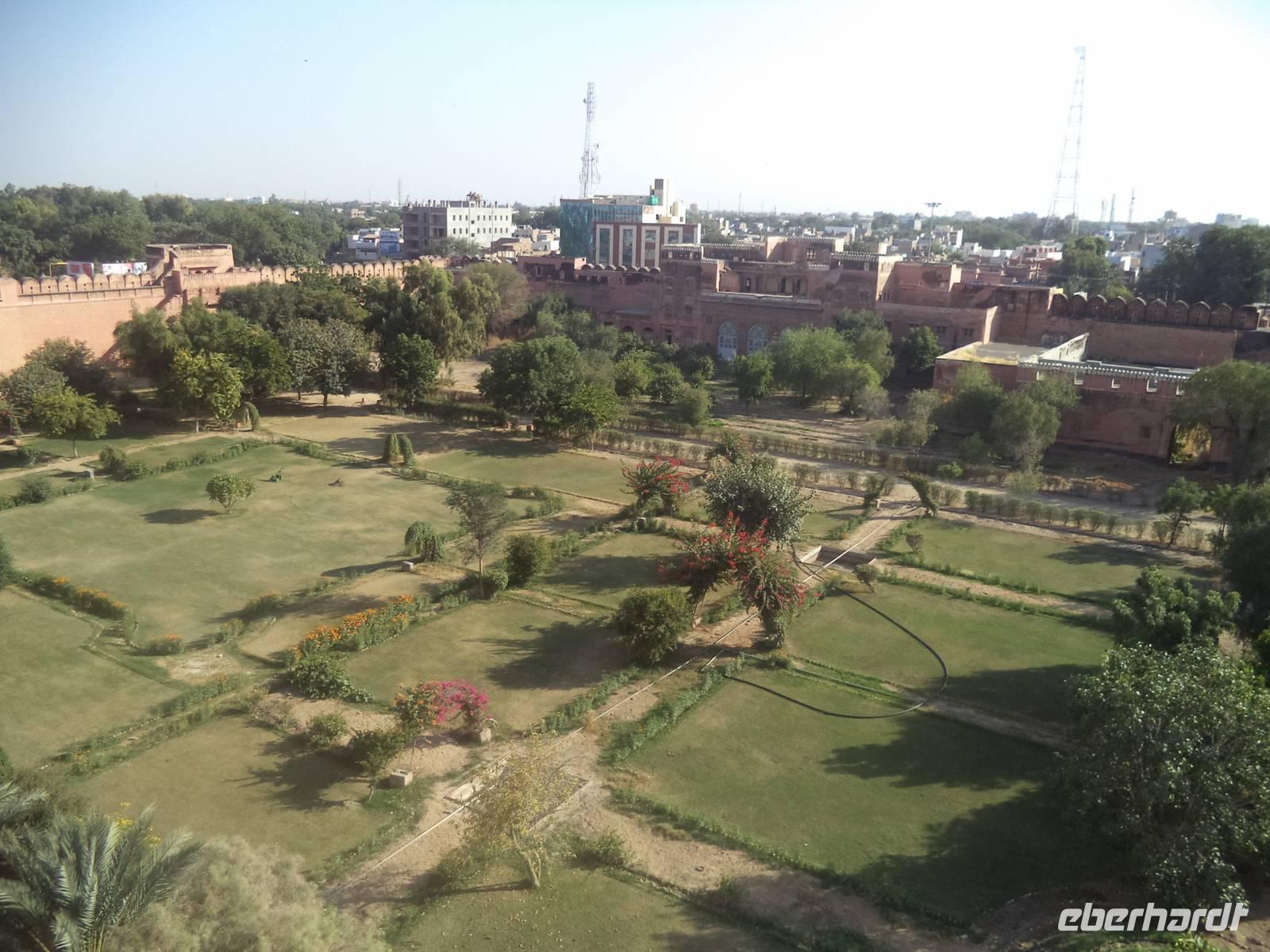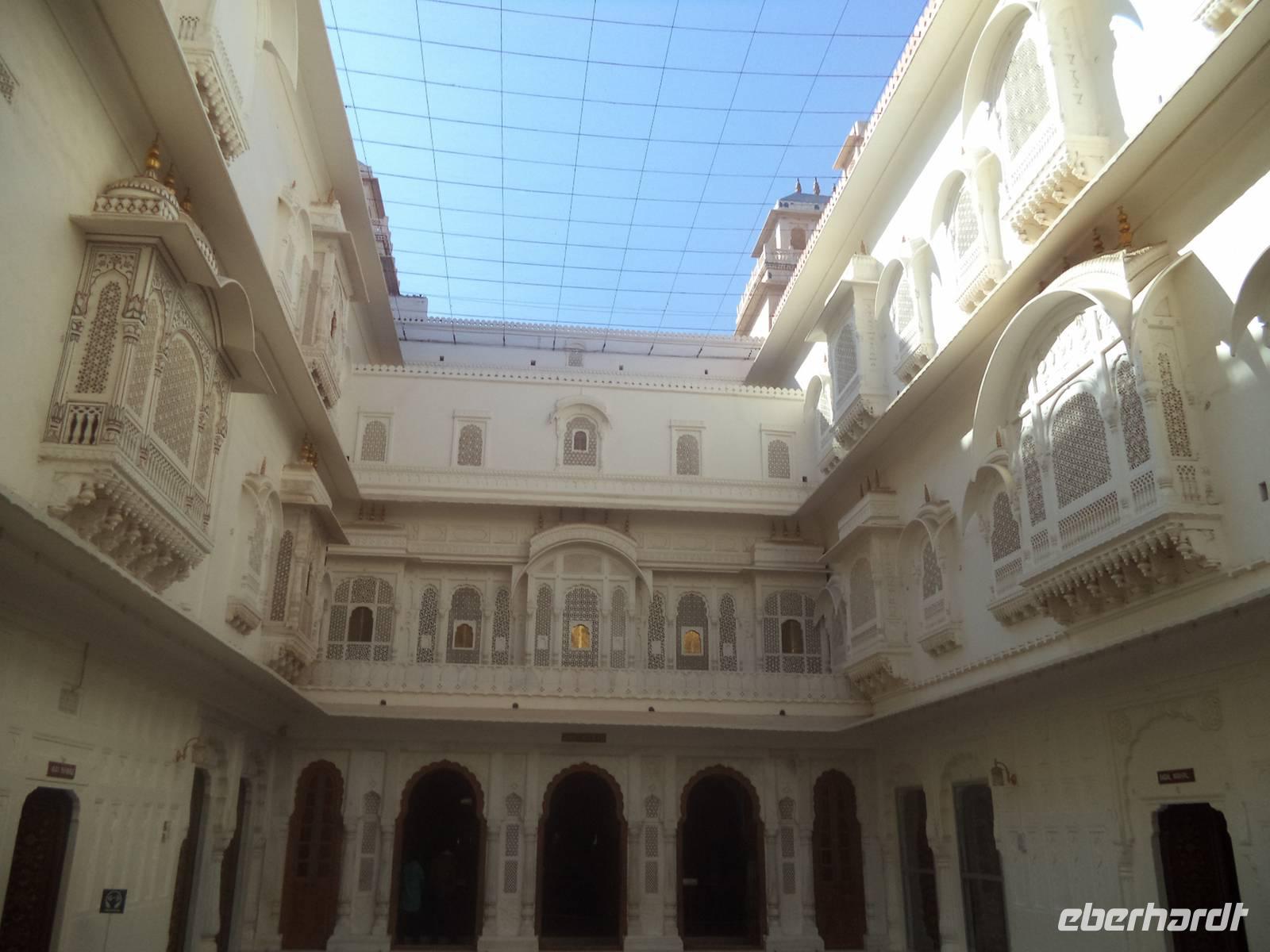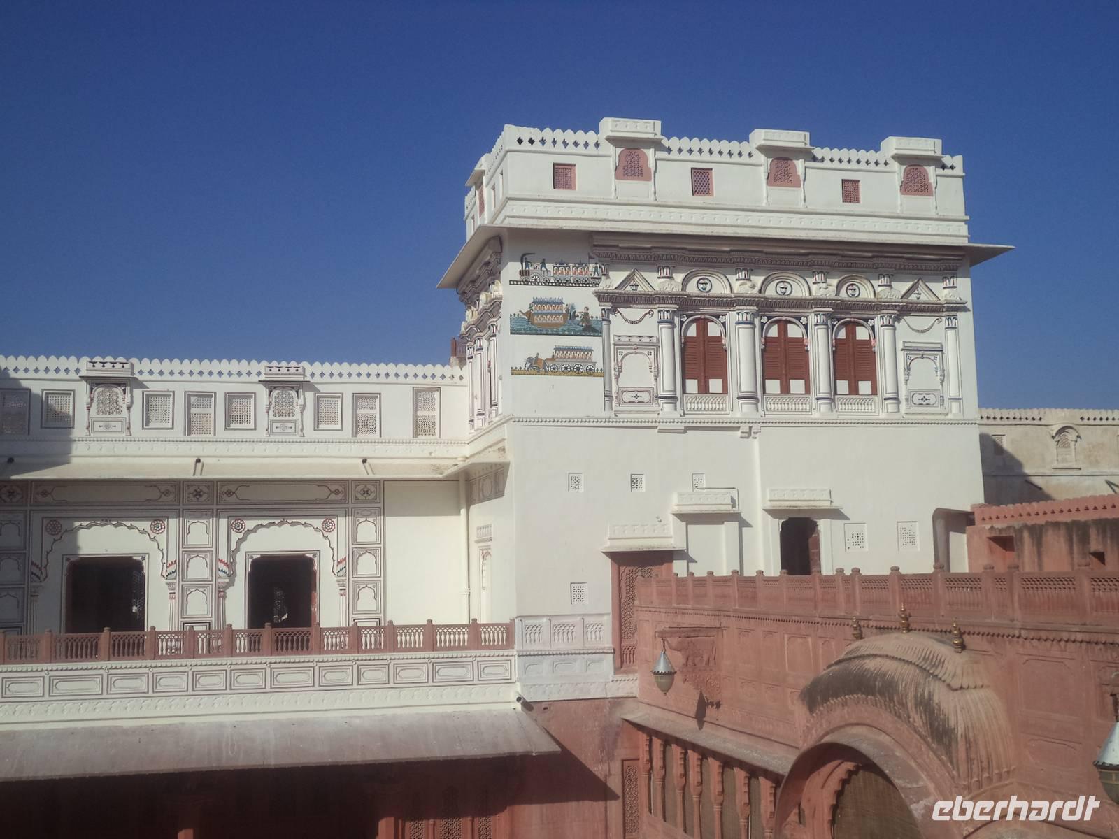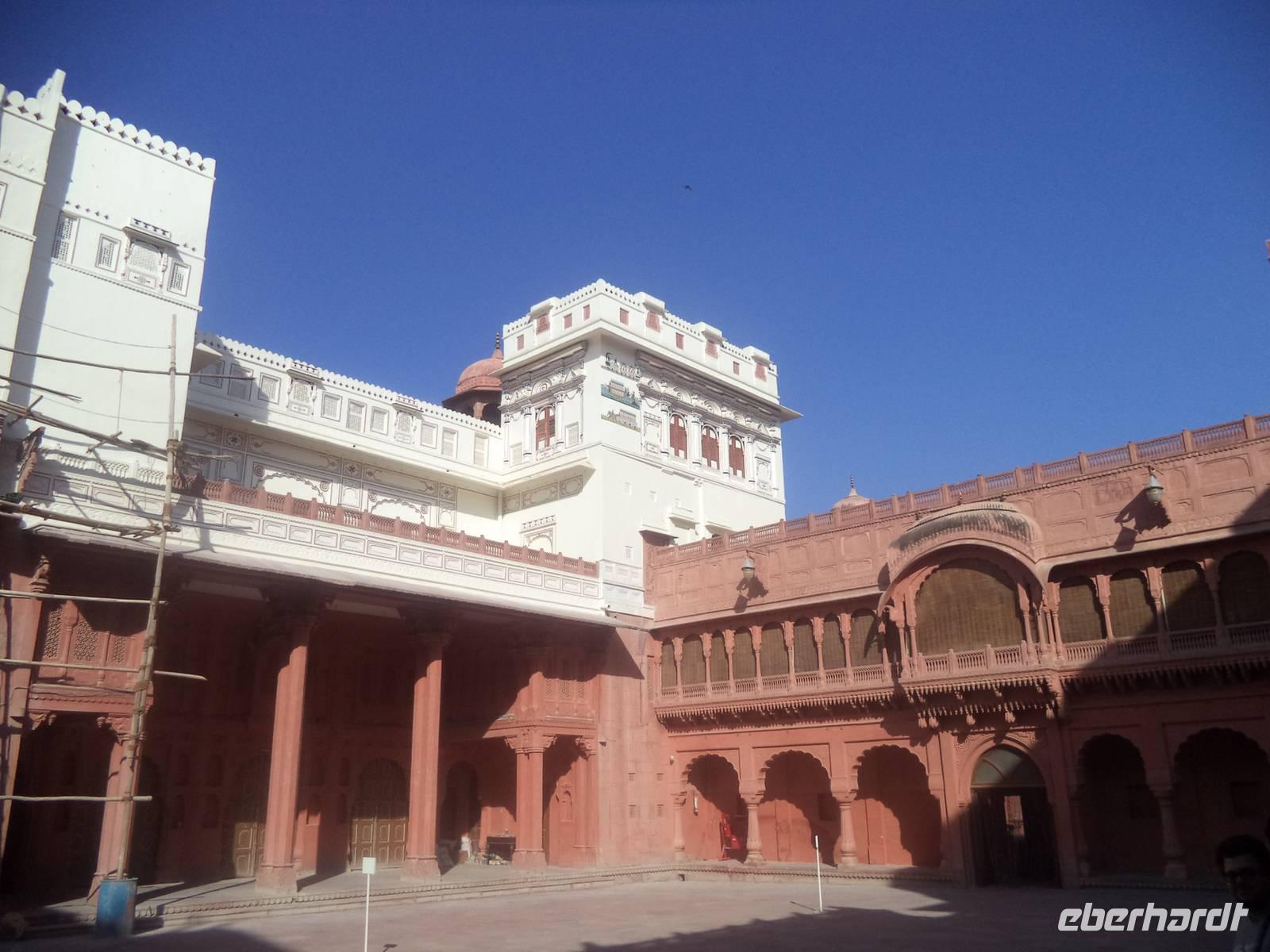 Da auch heute die Strecke lang werden würde, brachen wir sehr früh auf. Nach einigen hundert Kilometern schließlich waren wir in Bikaner, einer weiteren historischen Wüstenhauptstadt mit einstiger Verbindung zur berühmten Seidenstraße. Damals war der Ort ein blühender Handelsplatz, überragt von einem gewaltigen Stadtpalast. Als wir den mittags erreicht hatten, gab es zunächst ein leckeres Mittagessen im Restaurant gegenüber und danach die Besichtigung des riesigen Stadtpalastes. Errichtet wurde das wehrhafte, aber dennoch prunkvolle Junargarh Fort im 16. Jahrhundert zunächst aus Gips, später umgebaut und modernisiert mit Sandstein-Befestigungen. Es beherbergt als Museum heute nicht nur herrliche Palasträume, von denen viele nach bestimmten Themen gestaltet sind, wie etwa der Wolken- oder der Blumenpalast, sondern auch hübsche und strahlend weiße Innenhöfe und verzierte Brunnen.