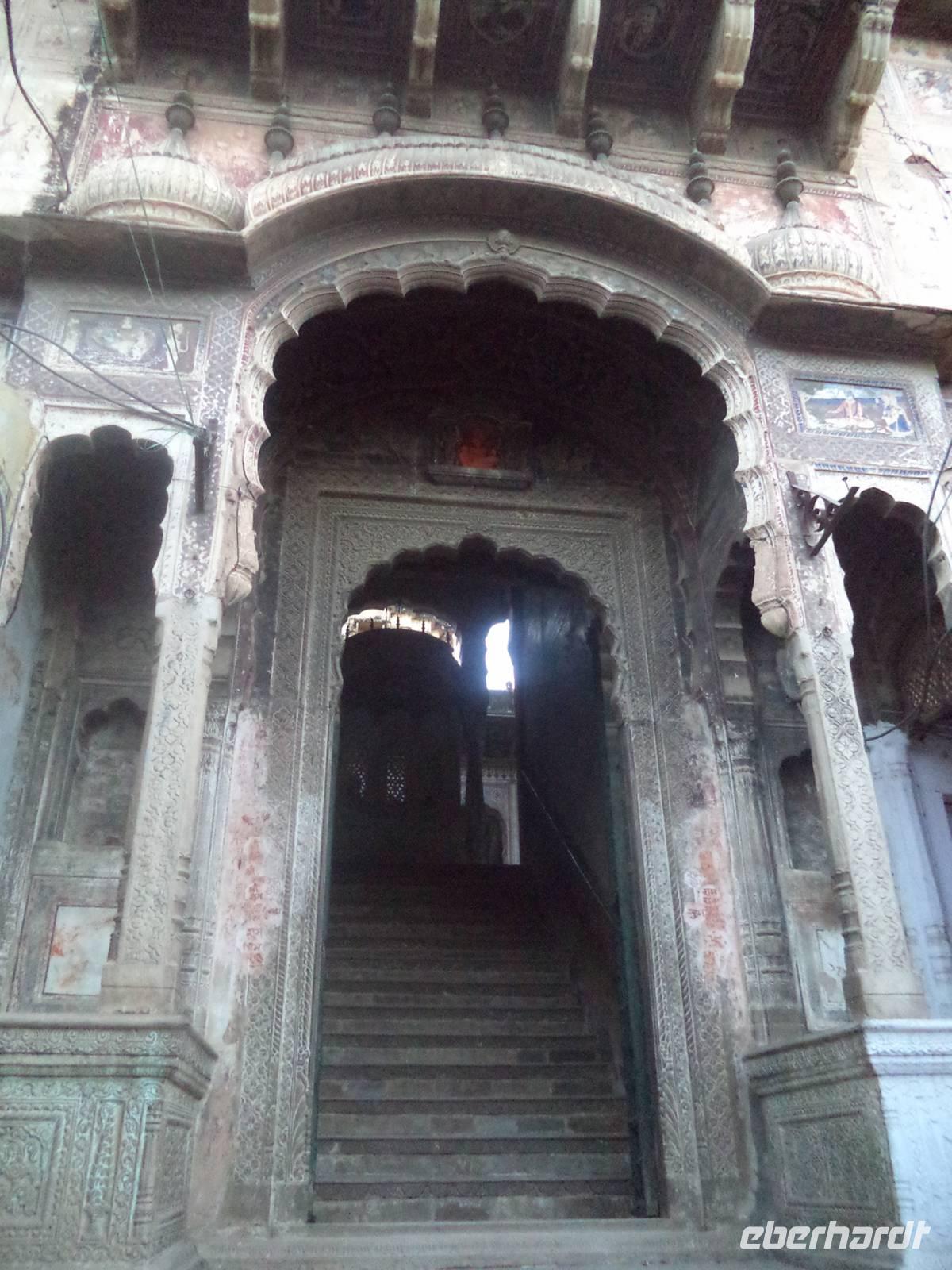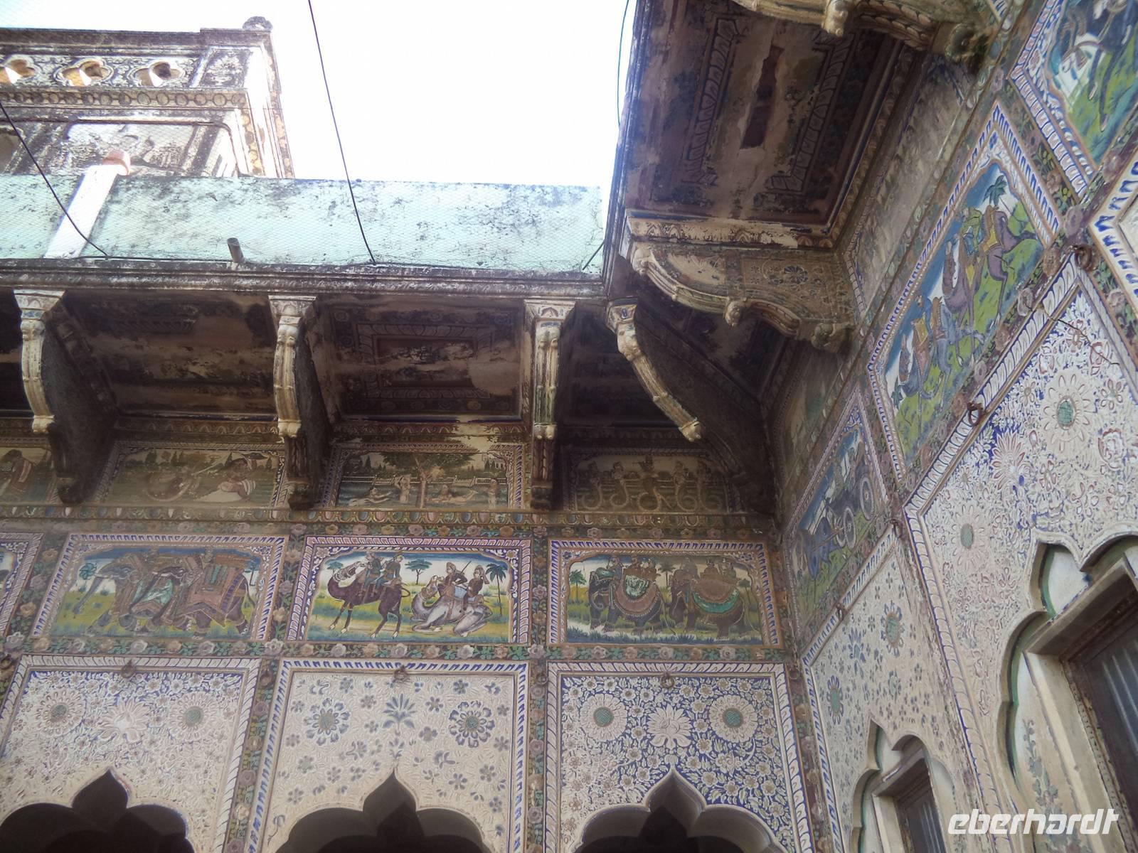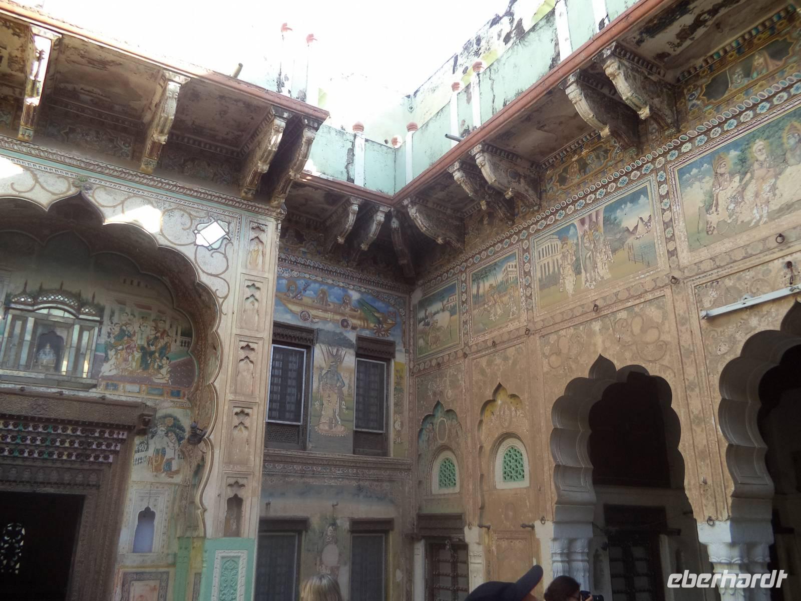Bei der Weiterfahrt zum Reiseende in Delhi gelangten wir nachmittags ins sogenannte „Shekawati-Gebiet" rund um den Ort Mandawa. Wir besahen uns ein Stück der alten und hoffnungslos überfüllt scheinenden Stadt Fatehpur. Ihre verwinkelten engen Gassen, Herz des für seine Wandmalereien bekannten „Shekawati"-Gebiets, beherbergen eine Unmenge bemalter alter Händlerhäuser, wie in Jaisalmer „Havelis" genannt. Heute sind sie zumeist verlassen oder werden von Verwalterfamilien bewohnt. Trotz aller Verblassung und Verkommenheit zeigen aber viele der alten Paläste noch den Abglanz ihrer einstigen Pracht. „Morbider Charme" ist sicherlich der passende Ausdruck, für die immer mehr zur Ruine werdenden architektonischen Besonderheiten und die verbleichende Schönheit der bemalten Paläste. Dazu gibt es noch einige der wie früher durch vier Säulen gekennzeichnete, Wüstenbrunnen, sogenannte „Harlakhas", die charakteristisch für alle Orte diesesGebietes sind. Nach der ausgiebigen Besichtigung eines der großen Havelis und seiner bemalten Innenhöfe fuhren wir noch weiter bis zu unserem Übernachtungsort Nawalgarh im Mandawa—Gebiet. Die Übernachtung in einem restaurierten, völlig authentisch erhaltenen und jetzt zum Hotel umgebauten prächtigen Haveli war beinahe der letzte Höhepunkt unserer ereignisreichen Reise.