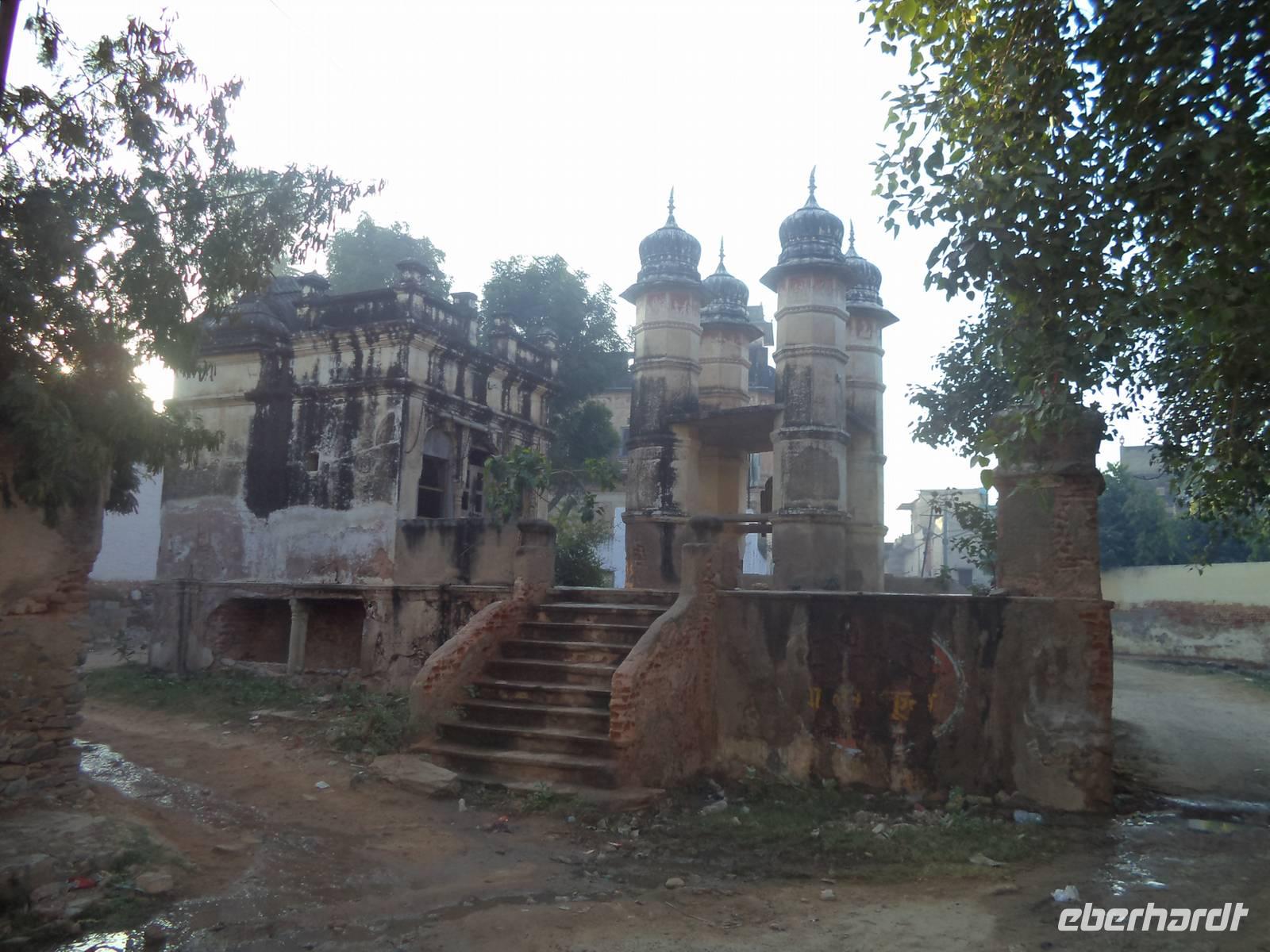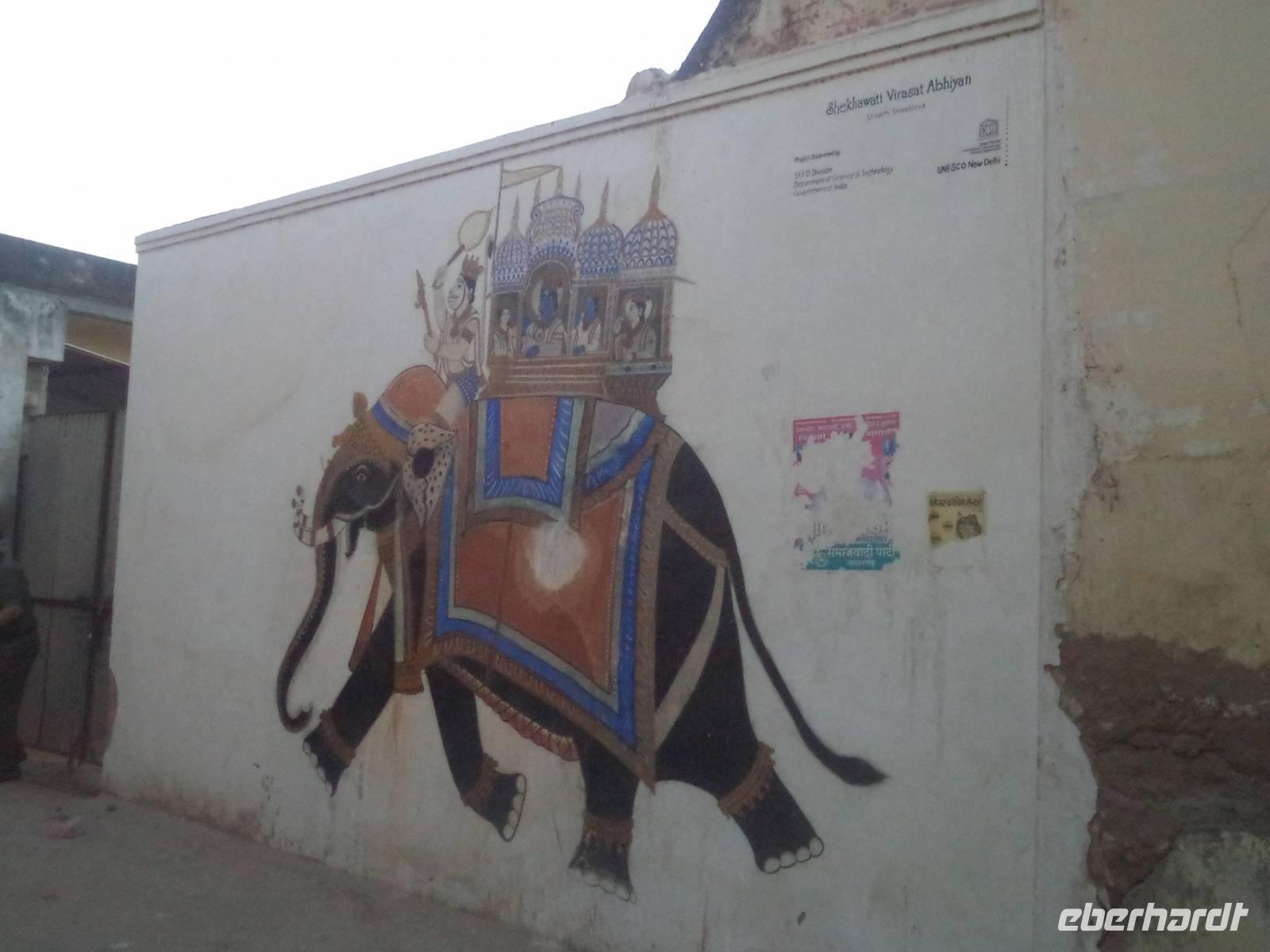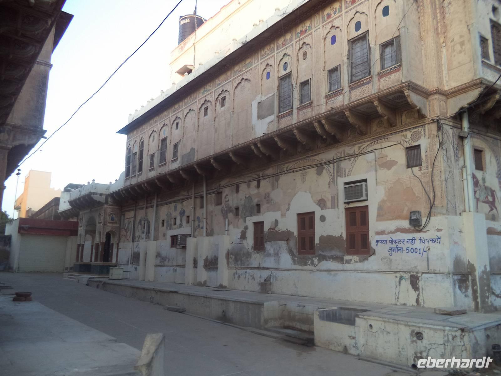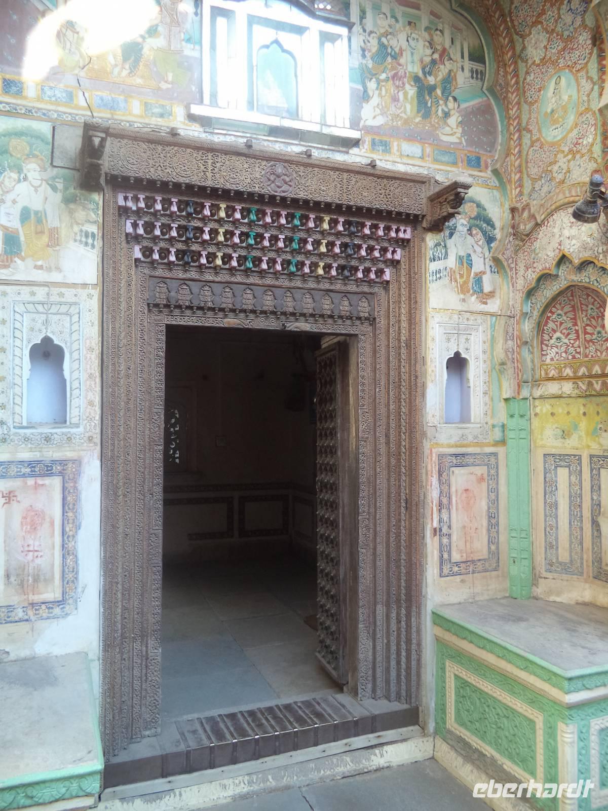 Bei der Weiterfahrt zum Reiseende in Delhi gelangten wir nachmittags ins sogenannte „Shekawati-Gebiet" rund um den Ort Mandawa. Wir besahen uns ein Stück der alten und hoffnungslos überfüllt scheinenden Stadt Fatehpur. Ihre verwinkelten engen Gassen, Herz des für seine Wandmalereien bekannten „Shekawati"-Gebiets, beherbergen eine Unmenge bemalter alter Händlerhäuser, wie in Jaisalmer „Havelis" genannt. Heute sind sie zumeist verlassen oder werden von Verwalterfamilien bewohnt. Trotz aller Verblassung und Verkommenheit zeigen aber viele der alten Paläste noch den Abglanz ihrer einstigen Pracht. „Morbider Charme" ist sicherlich der passende Ausdruck, für die immer mehr zur Ruine werdenden architektonischen Besonderheiten und die verbleichende Schönheit der bemalten Paläste. Dazu gibt es noch einige der wie früher durch vier Säulen gekennzeichnete, Wüstenbrunnen, sogenannte „Harlakhas", die charakteristisch für alle Orte diesesGebietes sind. Nach der ausgiebigen Besichtigung eines der großen Havelis und seiner bemalten Innenhöfe fuhren wir noch weiter bis zu unserem Übernachtungsort Nawalgarh im Mandawa—Gebiet. Die Übernachtung in einem restaurierten, völlig authentisch erhaltenen und jetzt zum Hotel umgebauten prächtigen Haveli war beinahe der letzte Höhepunkt unserer ereignisreichen Reise.