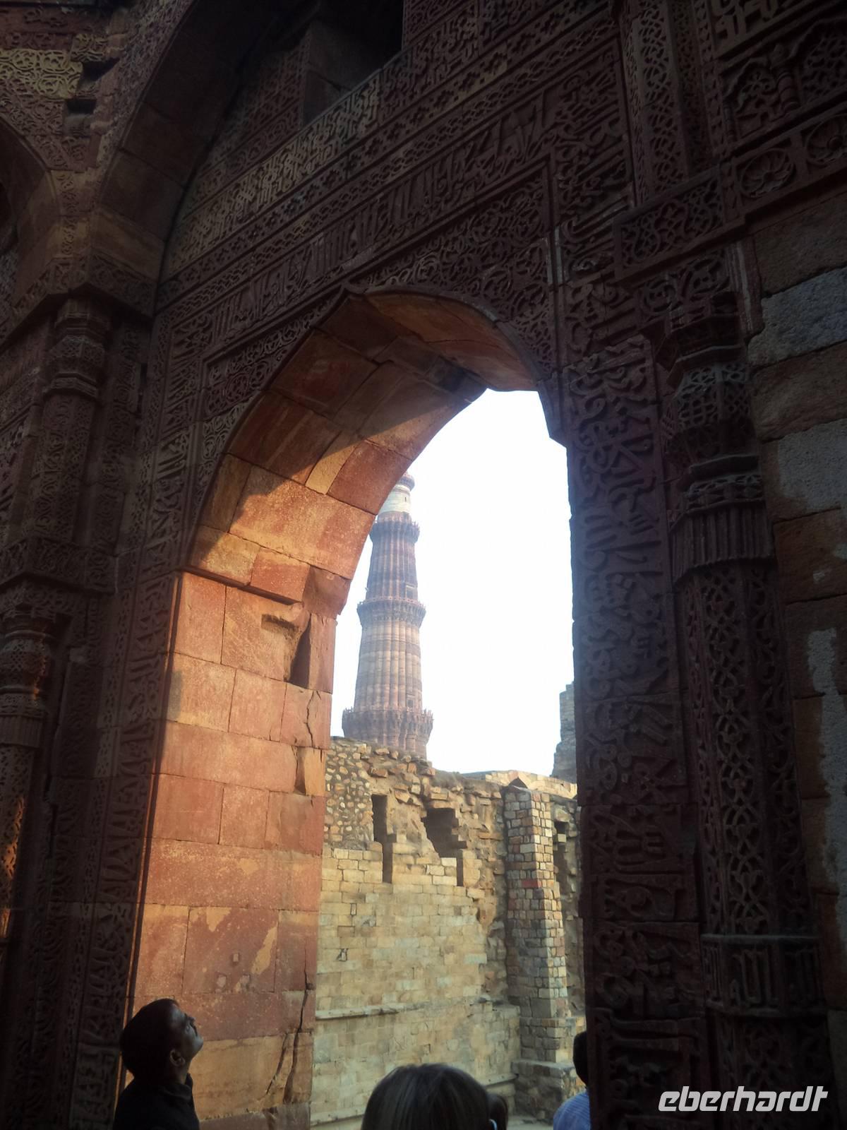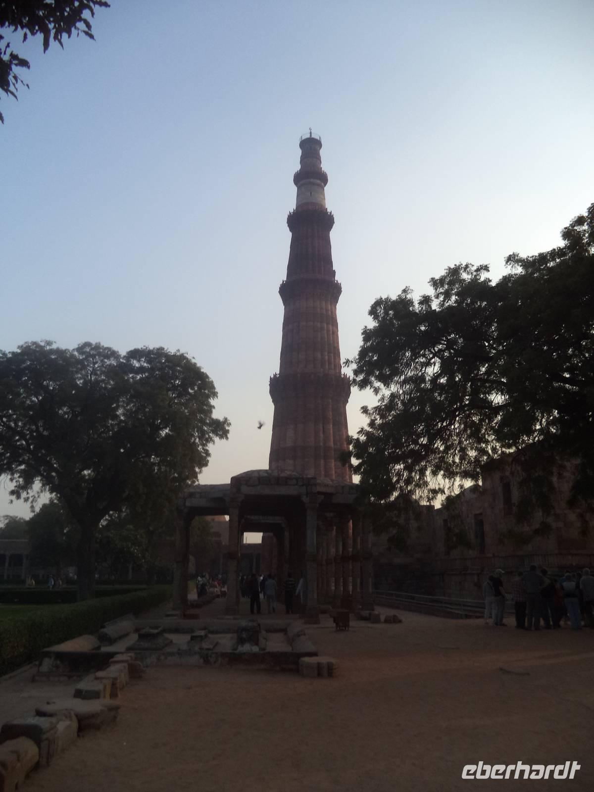 Wenigstens schafften wir es aber, noch rechtzeitig vor Sonnenuntergang am letzten geplanten Besichtigungspunkt zu sein. Das Qutb Minar ist das Minarett einer der ältesten Moscheen in Indien. Das 72 m hohe Bauwerk, lange Zeit das höchste in ganz Asien, wurde als Minarett, Wach- und Siegesturm im 13. Jahrhundert in der Zeit des Sultanats Delhi erbaut. Bis heute gilt der seit 1993 zum UNESCO-Weltkulturerbe zählende Turm zu den höchsten und schönsten Bauwerken des Islam. Insbesondere sein Farbwechsel aus verschieden kolorierten Sandsteinen ist bemerkenswert und in Abhängigkeit von der jeweiligen Beleuchtung eine regelrechte Show.