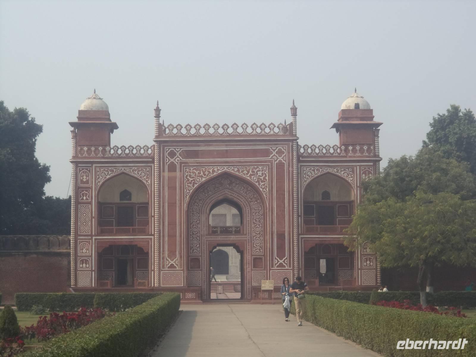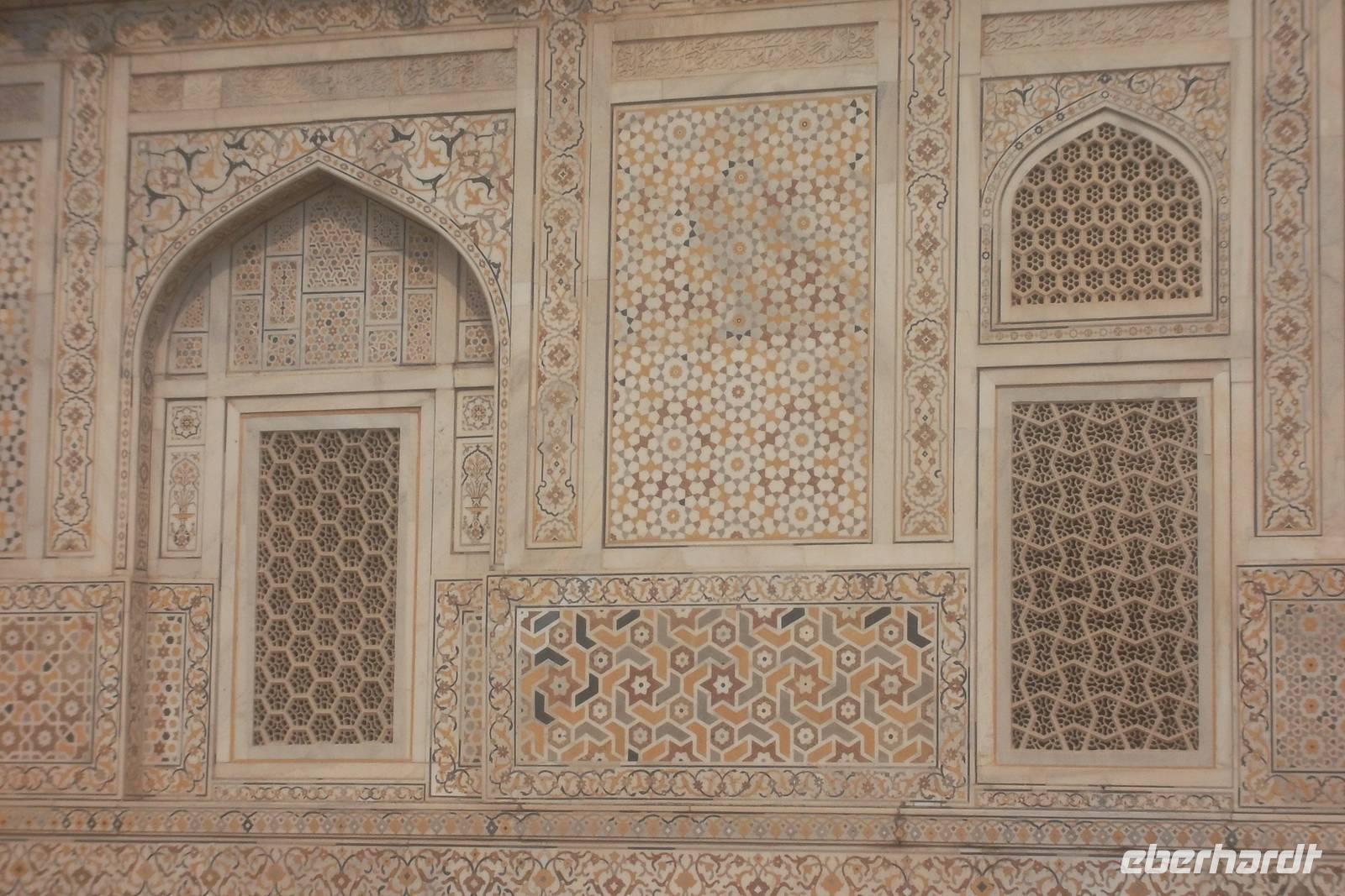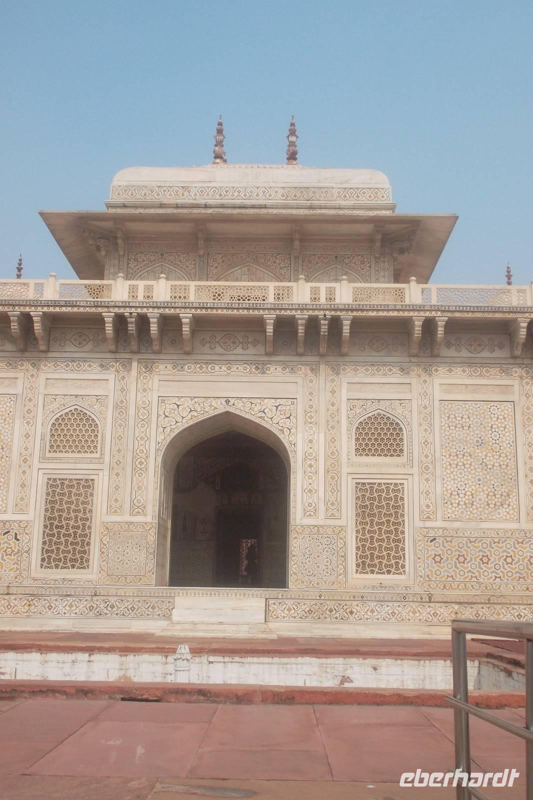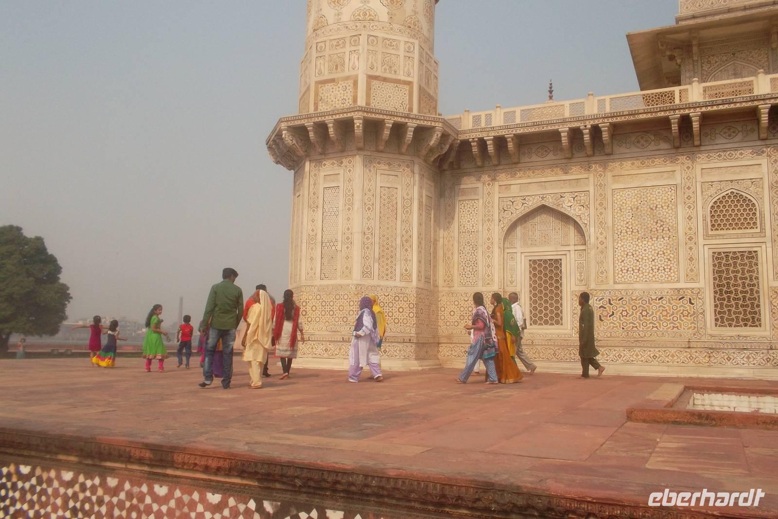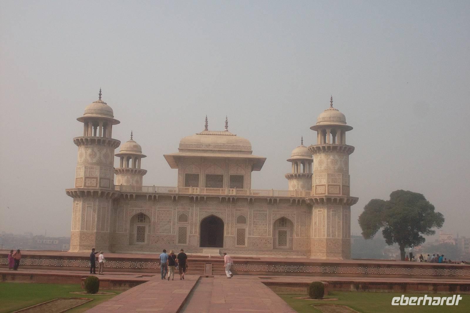 Recht früh heute machten wir uns auf den Weg nach Agra, wo es viel zu sehen gab. Die Fahrt auf der gut intakten und derzeit wenig befahrenen neuen ließ uns rasch die Millionenstadt am Yamuna erreichen. Agra, etwa so grpß wiue Hamburg, hat viele Sehenswürdigkeiten zu bieten. So konnten wir als erstes ein „Richtig-Reisen-Extra" einbauen. Klein aber fein am Ufer des„heiligen" Flusses Yamuna wurde für den Großvater des Taj-Mahal-Erbauers Shah Jahan ein Grabmal errichtet. Der so Geehrte hatte schon zu Lebzeiten für seine Verdienste als Schatzmeister und Wesir den Ehrennamen „Itimad-ud-Daula" (= Stütze des Staates) erhalten, der dann auch auf den prächtigen Grabbau in typischer Mogul-Architektur übertragen wurde. Errichtet wurde das Mausoleum wie auch später das Taj Mahal aus schneeweißem rajasthanischen Marmor, verziert mit Malereien, Schnitzwerk und Einlegearbeiten aus Halbedelstein.