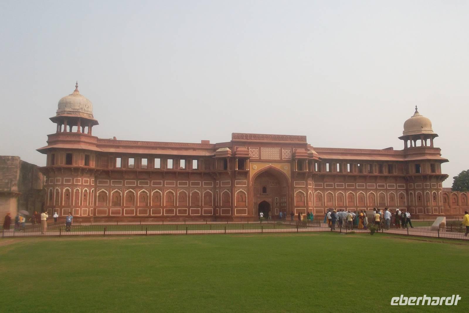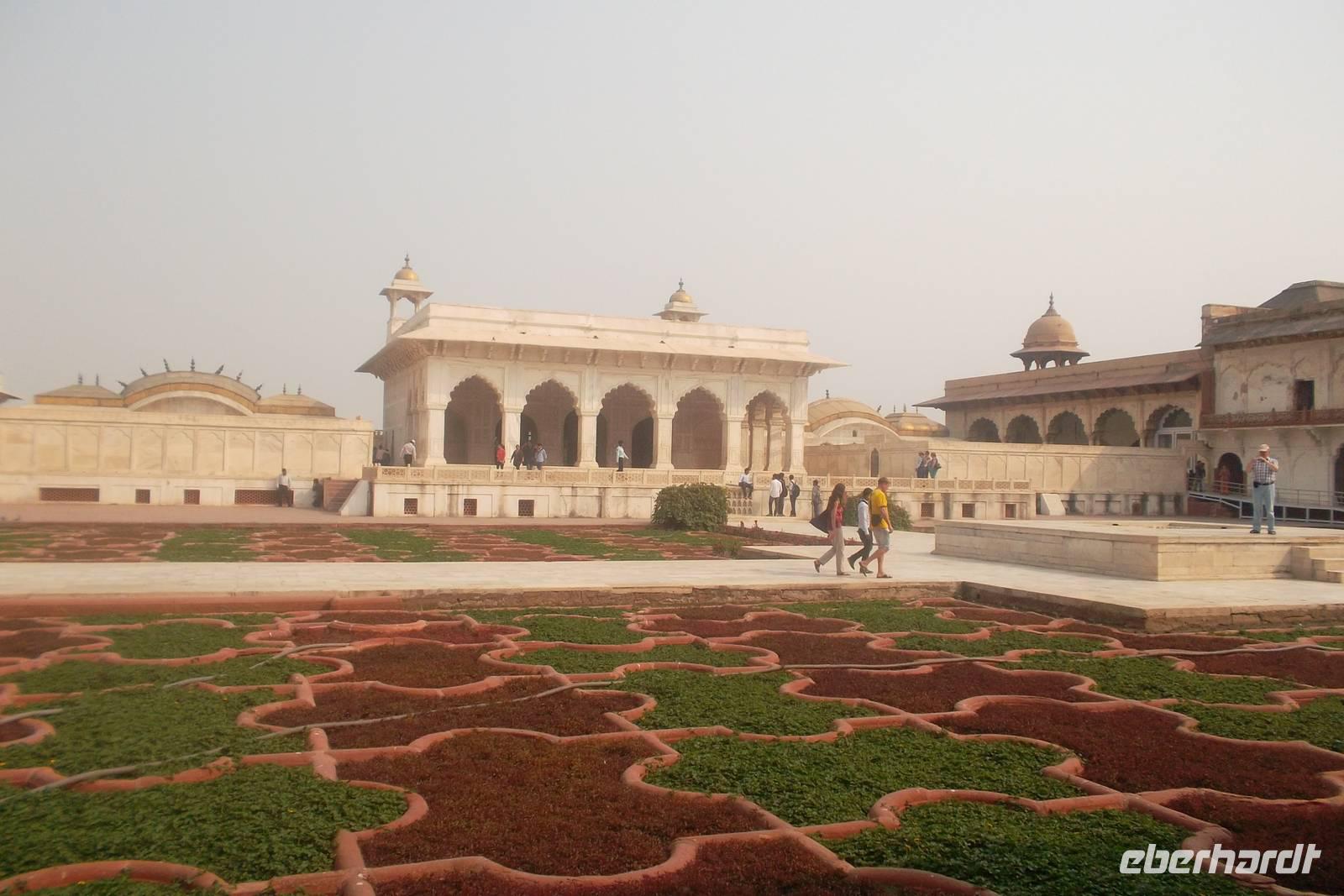 Nächstes Ziel war das Rote Fort, die Agras dominierende berühmte alte Mogul- Festung, die lange Zeit als Regierungssitz diente. Gebaut wurden die Festungsbauten überwiegend aus rotem Sandstein, dem Lieblings-Baumaterial des Kaisers Akbar. Auch die über zwei Kilometer lange Umfassungsmauer, die mancher mittelalterlichen europäischen Stadt zur Ehre gereicht hätte, umschloss die alte Militärfestung wie auch die zahlreichen Teile des prächtigen Palastes. Wir besuchten hier nach einem Blick auf die Festungswerke die äußere und eine innere Audienzhalle, die Paläste des Frauentraktes und mehrere Gebäude aus Marmor und Sandstein. Die gewaltige Anlage umfasst aber auch viele Höfe und Gärten, versehen mit Wasserspielen, darunter auch den kleinen Marmorpalast, in dem der Taj Mahal-Erbauer Shah Jahan in einen letzten Lebensjahren von seinem eigenen Sohn, Mogul Aurangzheb, der ihn entmachtet hatte, gefangengehalten wurde..