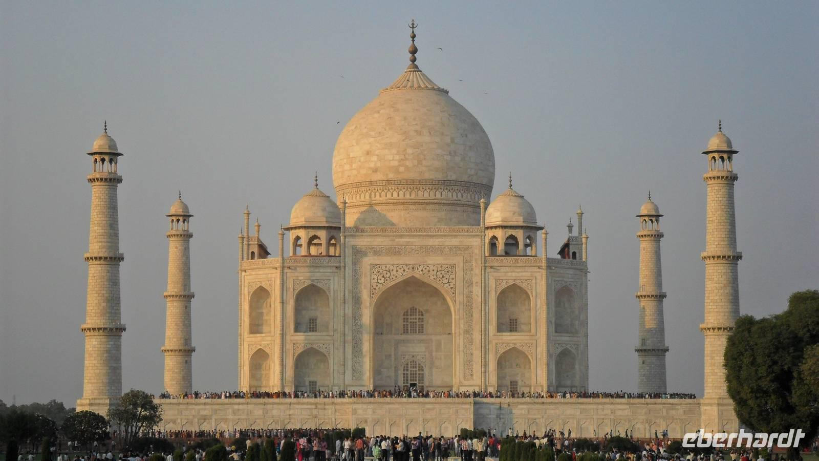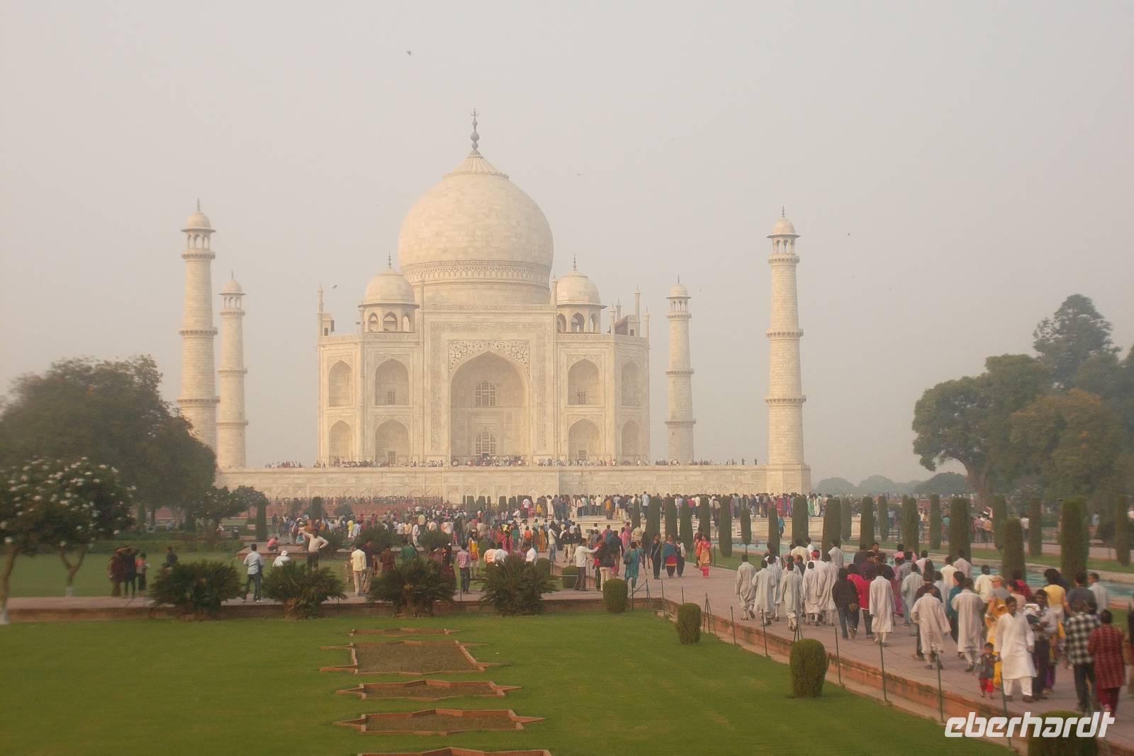 Das Marmorgrabmal ist eines der am meisten fotografierten Objekte in der Welt und gehört zu den per Internet gewählten „Sieben neuen Weltwundern". Und wer das Glück hat, es in natura zu sehen, wird gern zustimmen, dass es zu den spektakulärsten und berührendsten Sehenswürdigkeiten gehört, die man sich vorstellen kann. Natürlich ist das wundervolle Bauwerk auch bei Einheimischen sehr beliebt und noch nie habe ich das Grabmal ohne unglaubliche Scharen farbenfroh gekleideter Inder gesehen. Viele junge Eheleute kommen hierher in der Erwartung, dass ein Abglanz der gewaltigen Liebe, die in der Errichtung des vielleicht berühmtesten Grabmals der Welt durch Shah Jahan für seine verstorbene Frau Mumtatz Mahal liegt, auch auf sie fallen möge. 22 Jahre betrug die Bauzeit für das Kuppel-Bauwerk, errichtet direkt am Ufer des heiligen Flusses Yamuna auf einer quadratischen weißen Marmorplattform von etwa 100 Metern Kantenlänge. Shah Jahan wollte damit ein Zeichen seiner Liebe und seines steten Gedenkens an seine Lieblingsfrau Mumtaz Mahal, die 1631 starb, setzen. Seine Liebe hat auf diese Art ihre Verankerung in der Architekturgeschichte geschrieben gefunden und der Welt ein grandioses 58 m hohes Mausoleum aus weißem, filigran kristallinem und fast durchscheinendem Marmor beschert. Die umgebenden vier Pseudo-Minarette bilden zusammen mit dem Kuppelbau ein markantes Ensemble, das zu den bekanntesten Bauwerken weltweit zählt. Übrigens sind die Türme leicht nach außen geneigt, damit sie im Falle eines starken Erdbebens nach außen fallen und nicht das Mausoleum zerstören. Die Gesamtanlage ist - wie auch die Anlagen des Humayun Grabmals in Delhi und das Itimad-du-Daula, das wir vormittags gesehen hatten - in einer besonderen Form persischer Gartenarchitektur angelegt. „Char Bagh" nennt man den vor allem in Iran, Afghasnistasn und Nordindien zu findenden Typ Gartenarchitektur - ein rechteckiger viergeteilter Garten, der zwei sich kreuzende Achsen aufweist und so einen symmetrisch angelegten Paradiesgarten bildet.