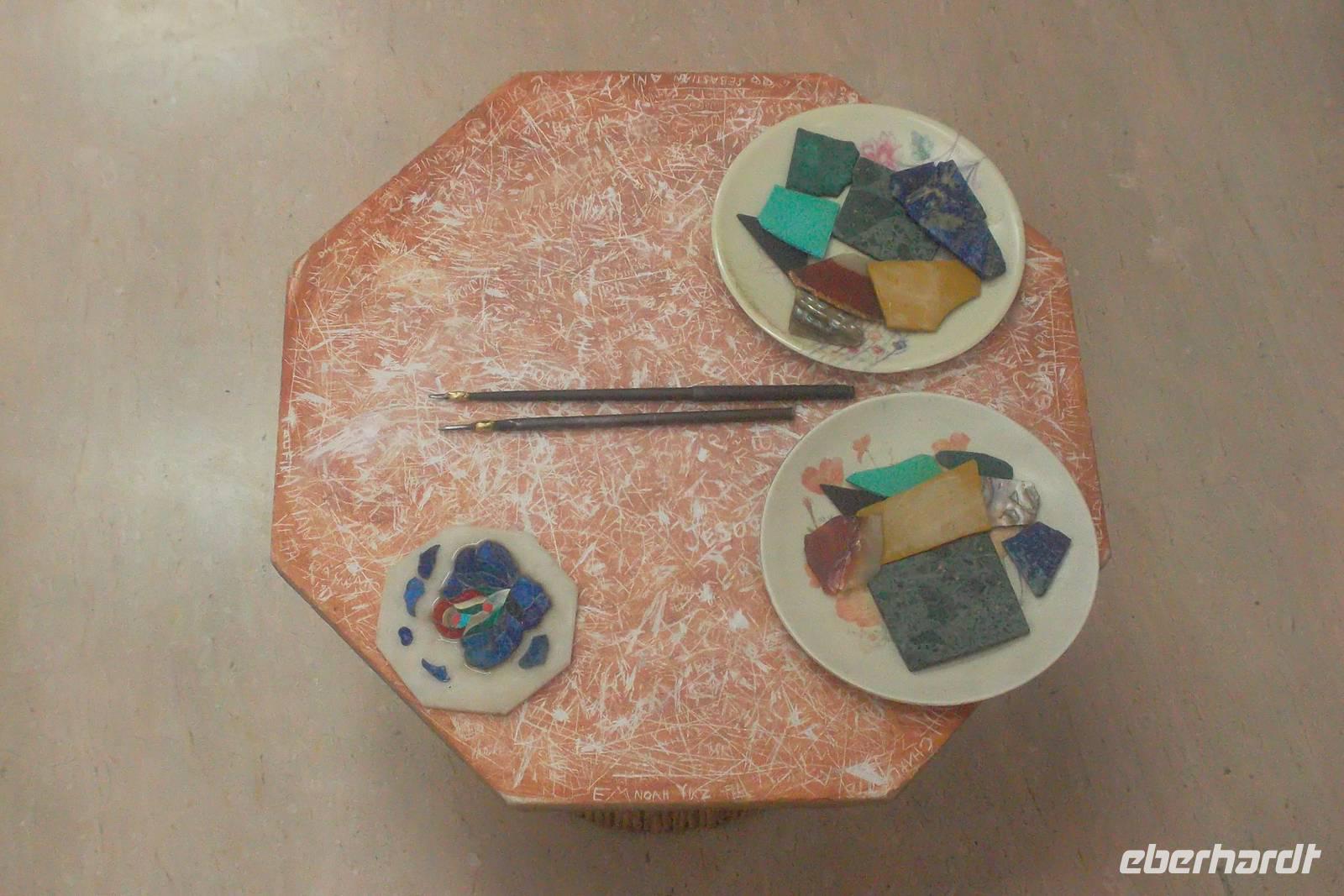 Die Familien der Künstler, die Steinschnitt und Intarsien für das Taj Mahal fertigten, sind seit dem Bau des Taj Mahal nicht fortgezogen. Immer noch in Agra angesiedelt, bewahren sie bis heute die alte traditionelle Handwerkskunst und die damit verbundenen Familiengeheimnisse. Am Abend konnten wir so einen Handwerksbetrieb besuchen, wo bis heute in traditioneller Handarbeit Marmorintarsien und Einlegearbeiten in Stein hergestellt werden. Anschließend suchten wir dann unser etwas außerhalb gelegenes Hotel auf.