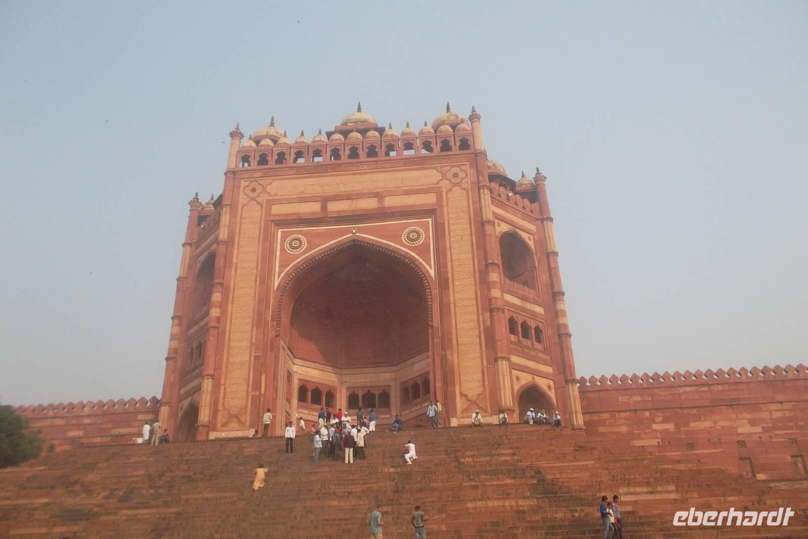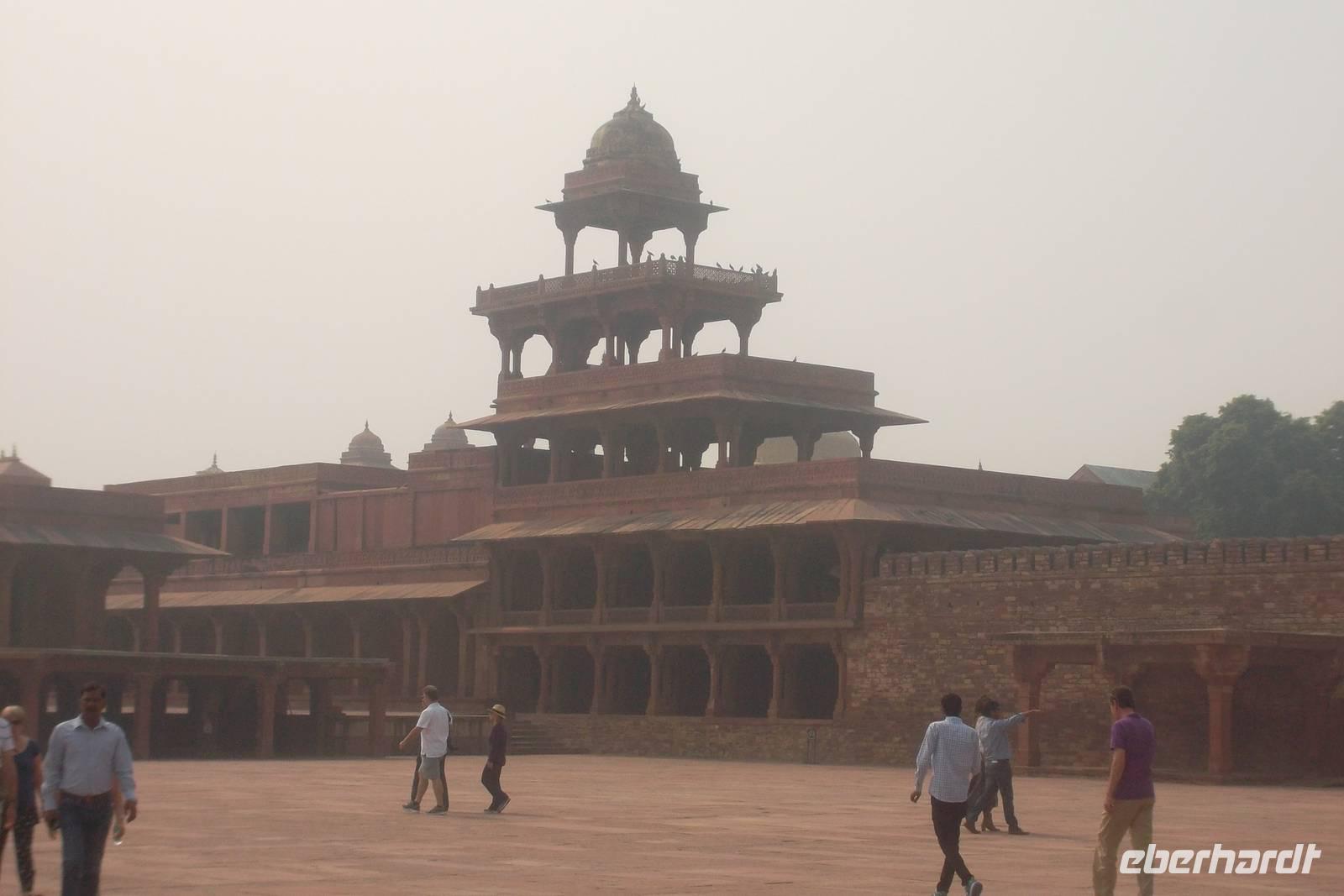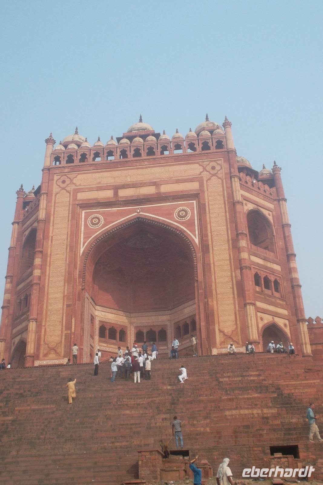Heute früh ging es zunächst nach Fatehpur Sikri, mitunter als „Geisterstadt" apostrophiert, weil die kurzzeitige Hauptstadt des Mogulreiches unter Kaiser Akhbar dem Großen im 16. Jh. zwar prächtig erbaut wurde, aber schon kurz danach wieder unzerstört verlassen wurde. Per aus Umweltschutzgründen eingesetztem Elektro-Shuttlebus gelangen wir Touristen nun in die beiden historischen Teile von Akhbars ehemaliger Hauptstadt. Der nahezu perfekte Erhaltungszustand zeugt auch vom Geschichtsbewußtsein und der traditionsverbundenen Lebensweise der Inder. Wir starteten unseren Rundgang im religiösen Bezirk von Fathepur Sikri. Der heute noch von vielen gläubigen Muslimen besuchte und genutzte Komplex enthält neben der Moschee und einem vielbesuchten Grabmal in seiner Umfassungsmauer Indiens höchstes je gebautes Siegestor. Das „Buland Darwaza" wurde gegen 1576 errichtet, nach dem Sieg Akhbars über Gujarat. Es krönt eine Außentreppe, den Hauptzugang zum Komplex, ist 54 Meter hoch und über 32 breite Stufen zu erreichen. Der Innenhof wird dominiert vom strahlend weißen Marmor-Mausoleum des Sheikhs Salim Chishti, eines berühmten Sufi-Heiligen. Auch der „profane" Palast- und Regierungskomplex - unser nächstes Ziel - ist bis heute sehr gut erhalten und ermöglicht - mit den Erklärungen unseres Reiseleiters Ambrish Sharma versehen - für die Besucher bis heute ein interessantes und gut nachvollziehbares Verständnis und Teilhaben an der Geschichte und den traditionellen Lebensweisen des Mogulhofes. Herausragend sieht man hier den „Panch Mahal", den einstigen luftigen fünfstöckigen „Windpalast" für die heißen Sommer in Fatehpur. Er ist eines der berühmtesten Bauwerke hier, dessen fünf Etagen sich zu einer einzigen Turmkammer hin verengen. Aufgrund der bedeutungsvollen mystischen hinduistischen Zahlensymbolik tragen ihn insgesamt 176 verschiedene Säulen und der Unterbau besteht wie üblich aus 84 Pfeilern - eine Quelle für Voraussagen der Hindu-Astrologen. Ein „Vergnügungshof" und die Paläste von Akhbars Frauen vervollständigten das Bild der Palaststadt, in der wir uns natürlich auch das sogenannte „Schatzhaus" des Herrschers ansahen und dann in seinen freistehenden ehemaligen Beratungs- und Audienzpalast wechselten. Hier findet sich die sogenannte „Säule der Religionen", die zu den wohl bekanntesten und berühmtesten Details der „Geisterstadt" Fathepur Sikri gehört. Ihre herrlichen Kerbschnitzereien in rotem Sandstein bilden mit vielfältigen Mustern fast eine Art „Zusammenschnitt" von Motiven verschiedener Religionen und ihr gesamtes Erscheinungsbild mit den oben angesetzten vier „Beratungswegen" ist ein oft und gern als Zeugnis für die damals an Akhbars Hof herrschende religiöse Toleranz interpretiertes Architekturdetail