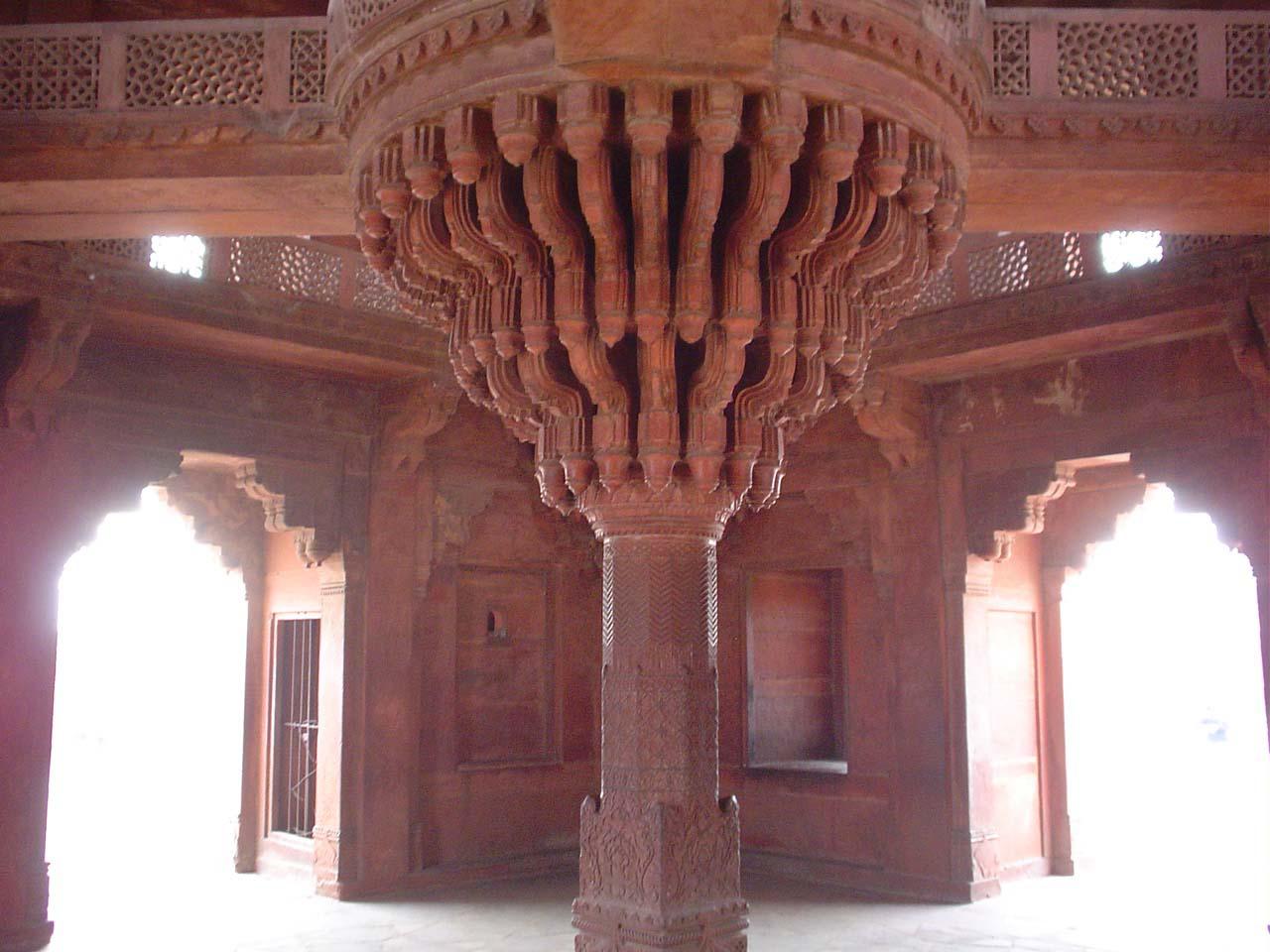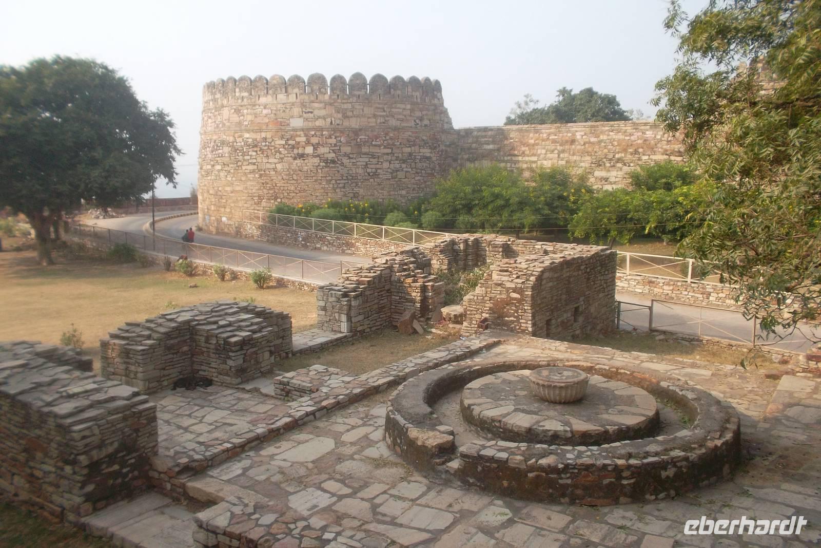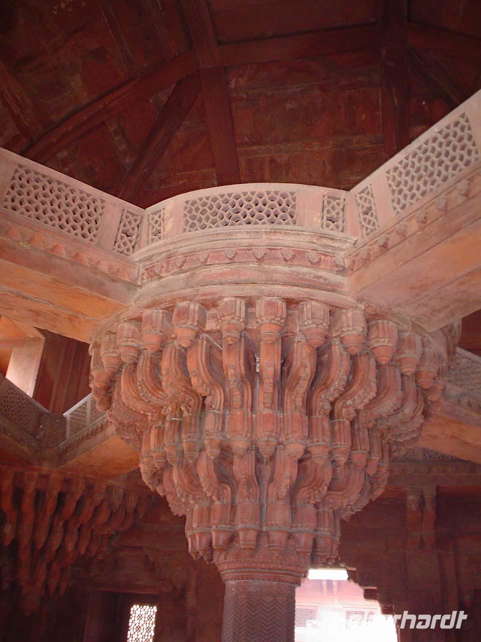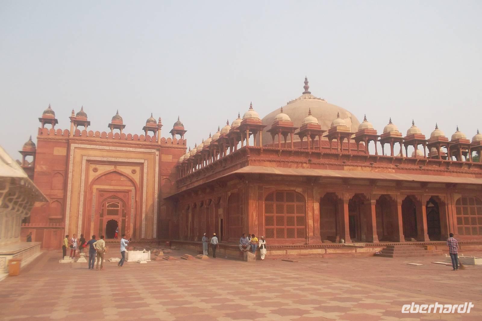 Heute früh ging es zunächst nach Fatehpur Sikri, mitunter als „Geisterstadt" apostrophiert, weil die kurzzeitige Hauptstadt des Mogulreiches unter Kaiser Akhbar dem Großen im 16. Jh. zwar prächtig erbaut wurde, aber schon kurz danach wieder unzerstört verlassen wurde. Per aus Umweltschutzgründen eingesetztem Elektro-Shuttlebus gelangen wir Touristen nun in die beiden historischen Teile von Akhbars ehemaliger Hauptstadt. Der nahezu perfekte Erhaltungszustand zeugt auch vom Geschichtsbewußtsein und der traditionsverbundenen Lebensweise der Inder. Wir starteten unseren Rundgang im religiösen Bezirk von Fathepur Sikri. Der heute noch von vielen gläubigen Muslimen besuchte und genutzte Komplex enthält neben der Moschee und einem vielbesuchten Grabmal in seiner Umfassungsmauer Indiens höchstes je gebautes Siegestor. Das „Buland Darwaza" wurde gegen 1576 errichtet, nach dem Sieg Akhbars über Gujarat. Es krönt eine Außentreppe, den Hauptzugang zum Komplex, ist 54 Meter hoch und über 32 breite Stufen zu erreichen. Der Innenhof wird dominiert vom strahlend weißen Marmor-Mausoleum des Sheikhs Salim Chishti, eines berühmten Sufi-Heiligen. Auch der „profane" Palast- und Regierungskomplex - unser nächstes Ziel - ist bis heute sehr gut erhalten und ermöglicht - mit den Erklärungen unseres Reiseleiters Ambrish Sharma versehen - für die Besucher bis heute ein interessantes und gut nachvollziehbares Verständnis und Teilhaben an der Geschichte und den traditionellen Lebensweisen des Mogulhofes. Herausragend sieht man hier den „Panch Mahal", den einstigen luftigen fünfstöckigen „Windpalast" für die heißen Sommer in Fatehpur. Er ist eines der berühmtesten Bauwerke hier, dessen fünf Etagen sich zu einer einzigen Turmkammer hin verengen. Aufgrund der bedeutungsvollen mystischen hinduistischen Zahlensymbolik tragen ihn insgesamt 176 verschiedene Säulen und der Unterbau besteht wie üblich aus 84 Pfeilern - eine Quelle für Voraussagen der Hindu-Astrologen. Ein „Vergnügungshof" und die Paläste von Akhbars Frauen vervollständigten das Bild der Palaststadt, in der wir uns natürlich auch das sogenannte „Schatzhaus" des Herrschers ansahen und dann in seinen freistehenden ehemaligen Beratungs- und Audienzpalast wechselten. Hier findet sich die sogenannte „Säule der Religionen", die zu den wohl bekanntesten und berühmtesten Details der „Geisterstadt" Fathepur Sikri gehört. Ihre herrlichen Kerbschnitzereien in rotem Sandstein bilden mit vielfältigen Mustern fast eine Art „Zusammenschnitt" von Motiven verschiedener Religionen und ihr gesamtes Erscheinungsbild mit den oben angesetzten vier „Beratungswegen" ist ein oft und gern als Zeugnis für die damals an Akhbars Hof herrschende religiöse Toleranz interpretiertes Architekturdetail