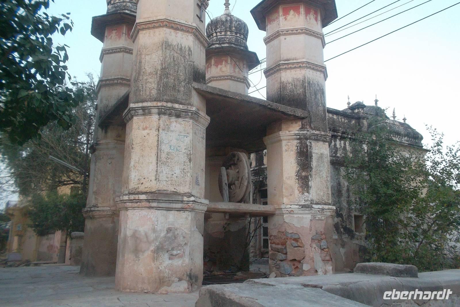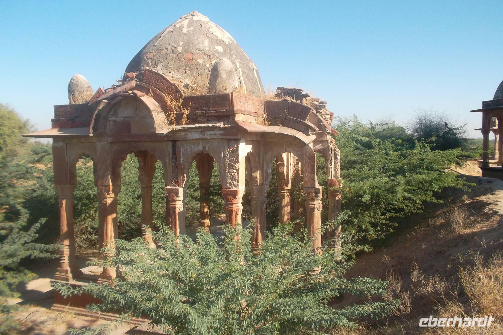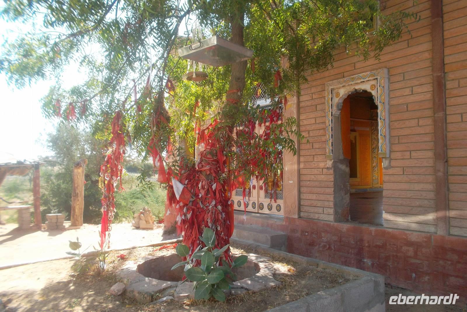 Um aber nicht unbedingt den ganzen Tag am Pool in der prallen Sonne liegen zu müssen, offerierten wir fakultativ eine halbtägige Jeepsafari am Vormittag. Bei der konnte jeder, der es wollte, mehr vom Leben auf dem Land kennenlernen. Und da alle Gäste mitmachten, fuhren wir nach dem mit zwei Jeeps querfeldein durch die Steppe. Zwar gab es in diesem Jahr wenig Tiere hier zu sehen - nur von weitem machten wir ein paar Axishirsche aus - , aber es gab dennoch so einiges zu sehen. So machten wir als erstes einen kleinen Bummel zu den traditionellen historischen Verbrennungsstätten der Herrscher von Khejrela. Die Hindusitte verlangt eine Feuerbestattung, um den Körper mit den fünf Elementen zu vereinen und so der Seele eine Wiedergeburt zu ermöglichen. Während einfache Inder in örtlichen Krematorien - oder im besten Fall auf den „Ghats", den Treppen an heiligen Flüssen verbrannt werden, wird bei wichtigen Persönlichkeiten an der Stätte ihrer Einäscherung eine steinerne Plattform mit Baldachin errichtet. „Chhatris" nennt man solche Erinnerungsstätten, die man allerorten als wichtigste Gedenkstätten der jeweiligen Umgebung finden kann. Anschließend besichtigten wir einen kleinen Tempel - den Göttern Shiva und Hanuman gewidmet - an einem heiligen See, bevor wir in ein traditionelles Dorf der einheimischen Bevölkerung fuhren. Die urwüchsig lebenden Bewohner dieser Gegend, die sich seit Jahrtausenden an 29 Regeln des Zusammenlebens mit der Natur halten, werden nach dieser Tradition mit dem Wort für „29" - Bishnoi - genannt.