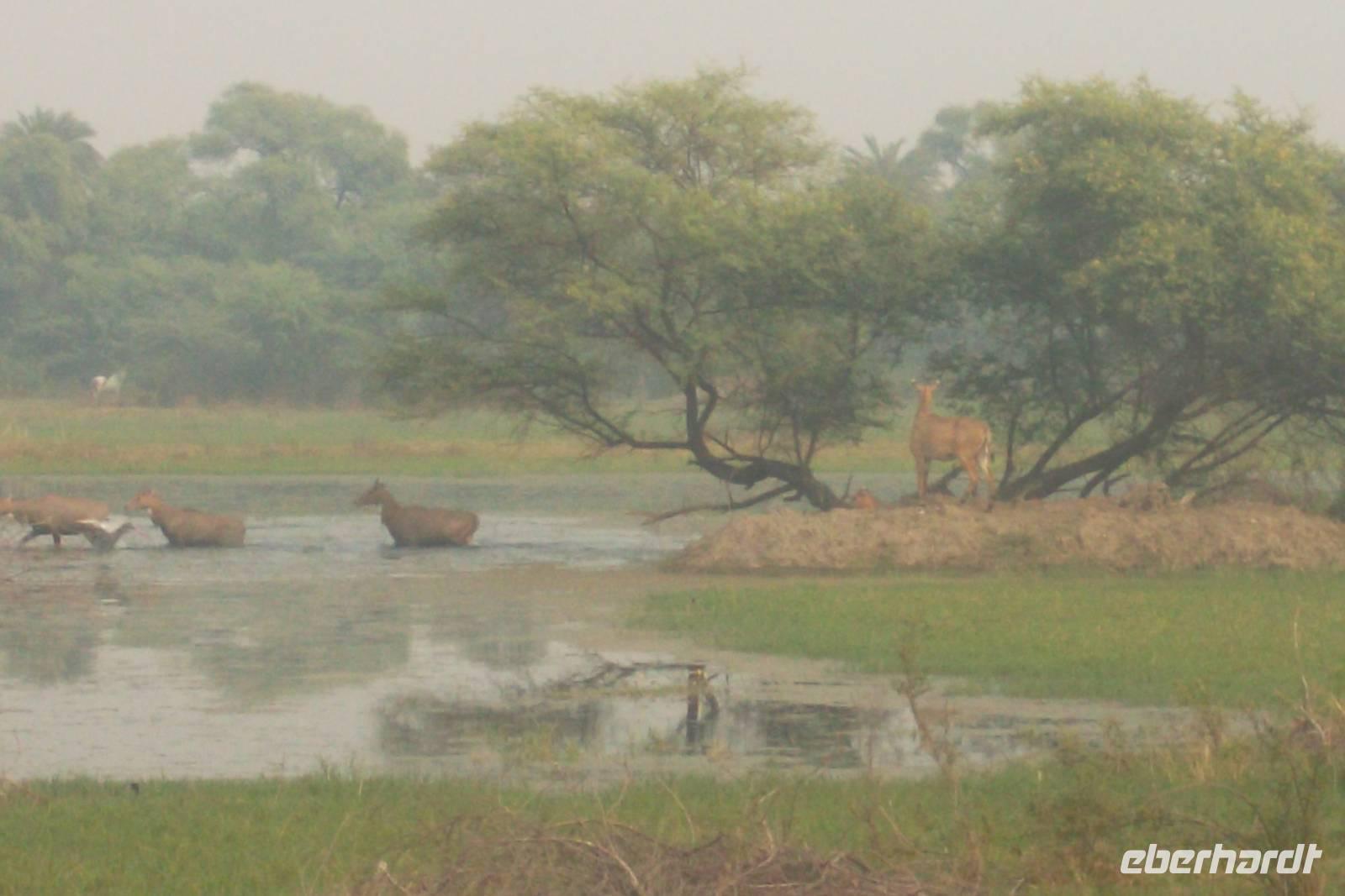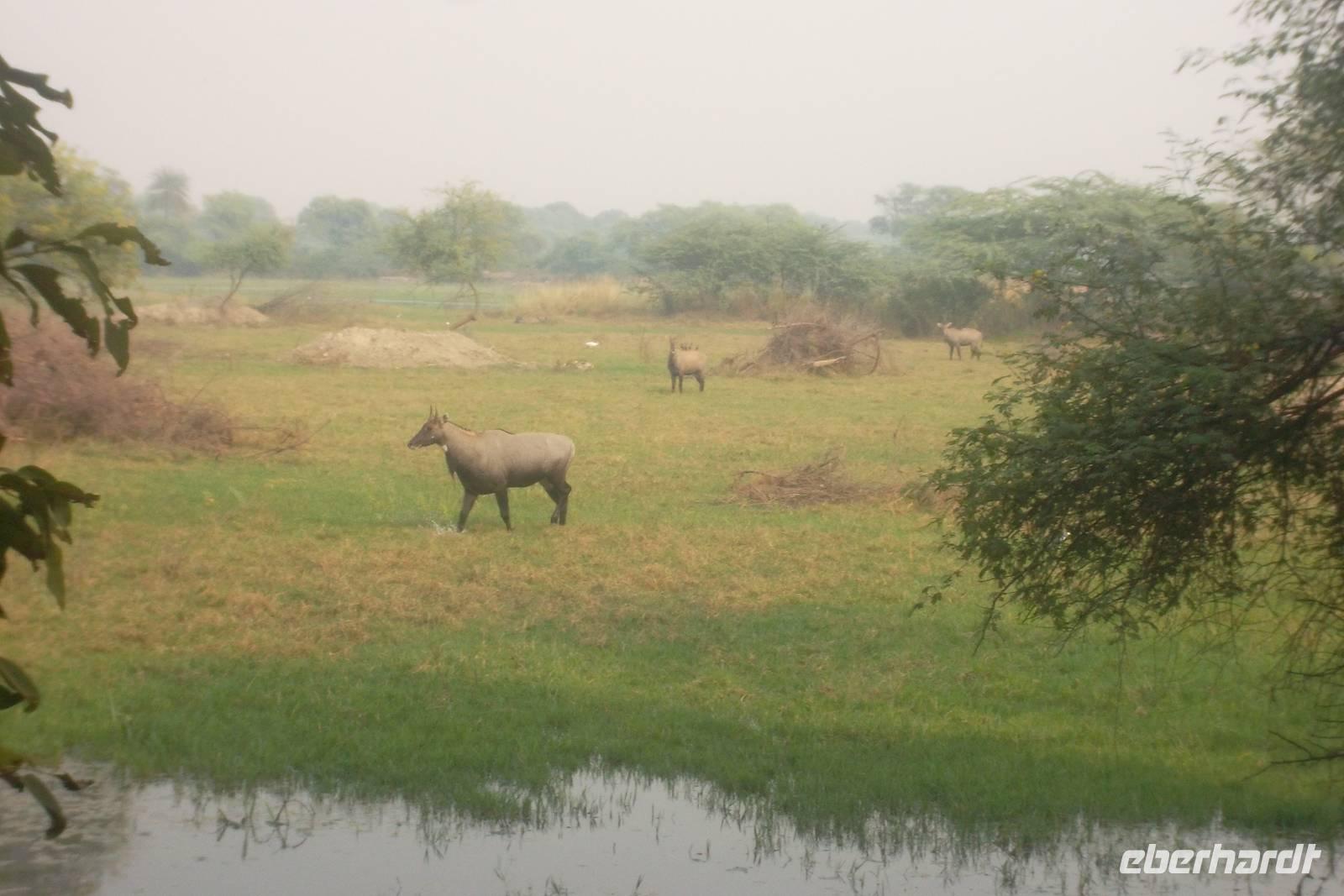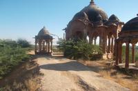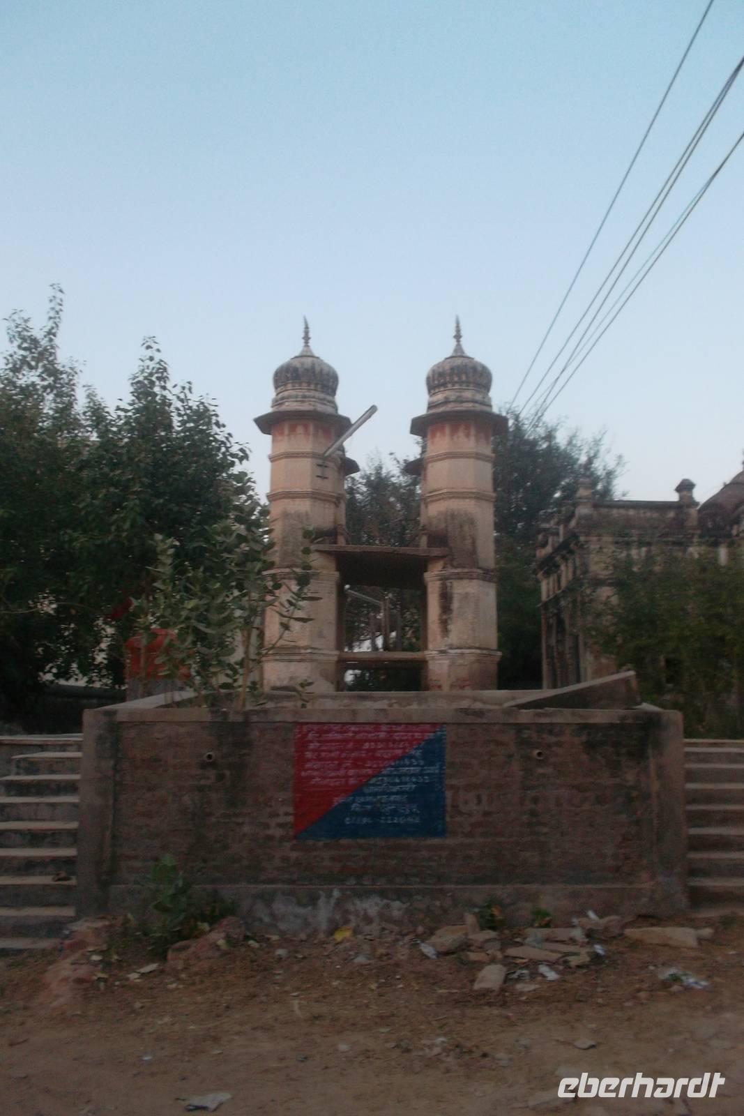 Um aber nicht unbedingt den ganzen Tag am Pool in der prallen Sonne liegen zu müssen, offerierten wir fakultativ eine halbtägige Jeepsafari am Vormittag. Bei der konnte jeder, der es wollte, mehr vom Leben auf dem Land kennenlernen. Und da alle Gäste mitmachten, fuhren wir nach dem mit zwei Jeeps querfeldein durch die Steppe. Zwar gab es in diesem Jahr wenig Tiere hier zu sehen - nur von weitem machten wir ein paar Axishirsche aus - , aber es gab dennoch so einiges zu sehen. So machten wir als erstes einen kleinen Bummel zu den traditionellen historischen Verbrennungsstätten der Herrscher von Khejrela. Die Hindusitte verlangt eine Feuerbestattung, um den Körper mit den fünf Elementen zu vereinen und so der Seele eine Wiedergeburt zu ermöglichen. Während einfache Inder in örtlichen Krematorien - oder im besten Fall auf den „Ghats", den Treppen an heiligen Flüssen verbrannt werden, wird bei wichtigen Persönlichkeiten an der Stätte ihrer Einäscherung eine steinerne Plattform mit Baldachin errichtet. „Chhatris" nennt man solche Erinnerungsstätten, die man allerorten als wichtigste Gedenkstätten der jeweiligen Umgebung finden kann. Anschließend besichtigten wir einen kleinen Tempel - den Göttern Shiva und Hanuman gewidmet - an einem heiligen See, bevor wir in ein traditionelles Dorf der einheimischen Bevölkerung fuhren. Die urwüchsig lebenden Bewohner dieser Gegend, die sich seit Jahrtausenden an 29 Regeln des Zusammenlebens mit der Natur halten, werden nach dieser Tradition mit dem Wort für „29" - Bishnoi - genannt.