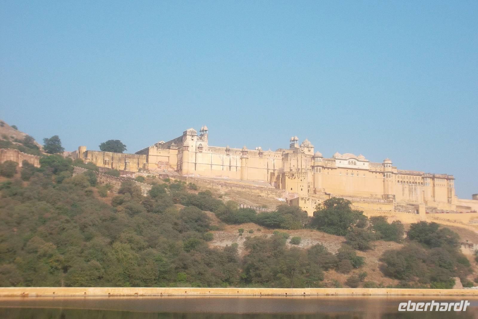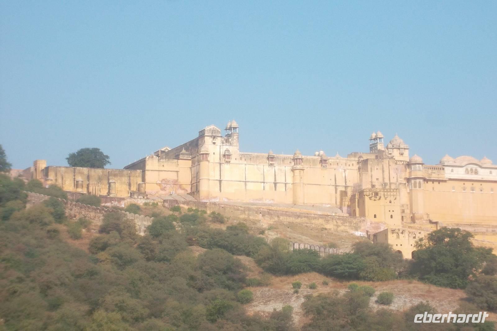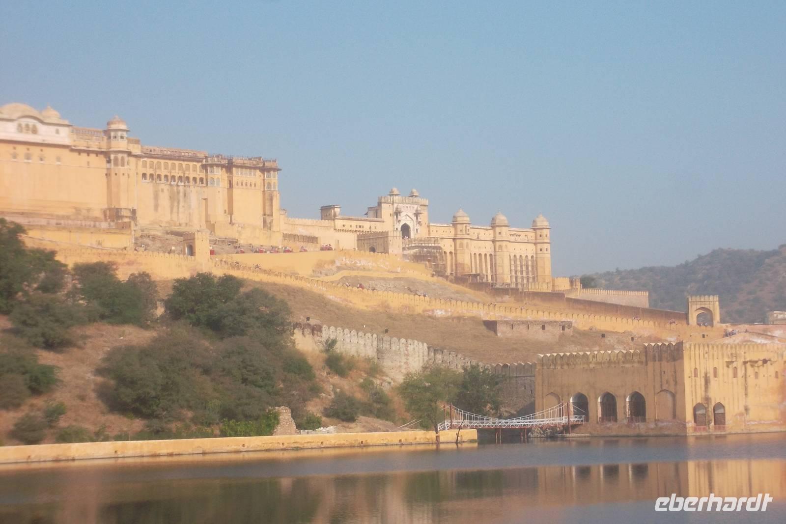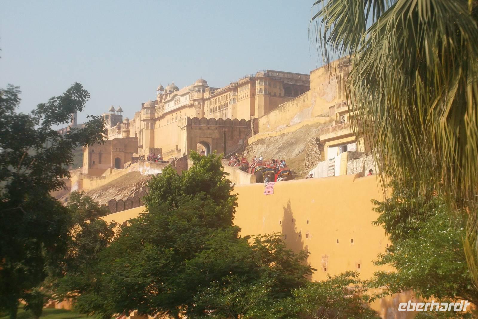 Nach einem Fotostopp hier ging es für uns weiter zum heutigen Vormittags-Abenteuer: hoch zu Elefant wollten wir das Amber-Fort erreichen. Relativ kurz war die Wartezeit zu Füßen der Anhöhe, die die Festung Amber trägt. Vor der Gründung Jaipurs war dies die Hauptstadt eines großen Reiches, noch heute weitläufig von einer Mauer umgeben. Größte Touristenattraktion sind hier aber zweifellos die buntgeschmückten Elefanten, die die Besucher den Höhenunterschied des steilen Burgbergs hinaufschaukeln. Ein wenig soll man sich hier schon so fühlen wie zur Zeit der Maharadschahs, die früher selbst und mit ihren wichtigsten Gästen in Elefantensänften hinaufgelangten. Heute tragen die Rüsseltiere ein einigermaßen bequemes Podest, auf dem immer zwei Personen sitzen können.
