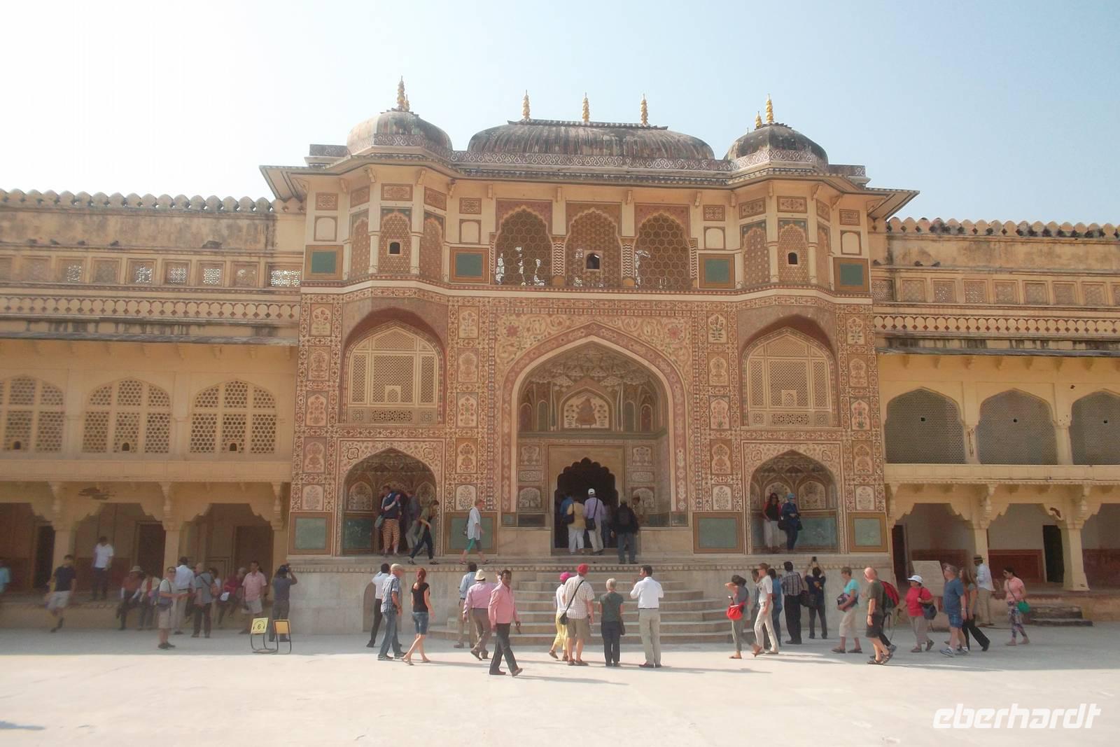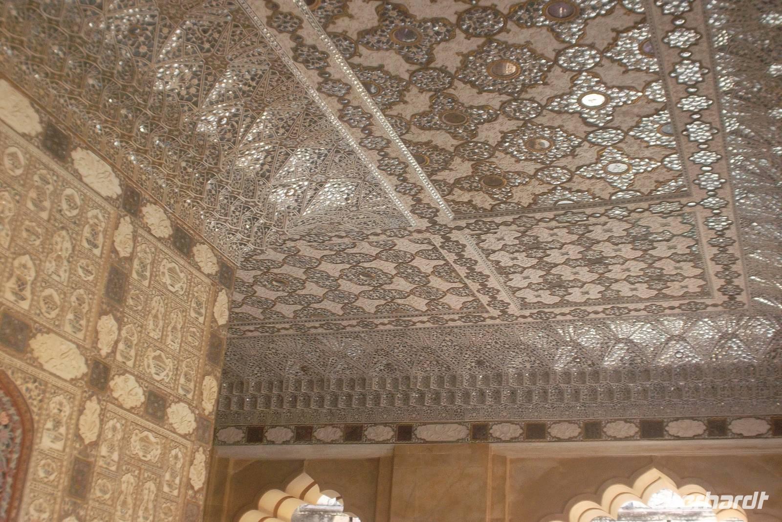 Per Elefant erreichten wir also das Amber Fort, dessen ersten Innenhof mit seiner bemalten Torfassade und der äußeren Audienzhalle wir dann betraten. Der schöne ehemalige Audienzsaal besitzt Wände, die mit tausenden geschickt eingesetzten Spiegelscherben verziert sind. Das innere Eingangstor zählt ebenfalls zu den Höhepunkten altindischen Kunsthandwerks und leuchtet mit wundervollen Malereien an den Außenwänden. Auch im Palastinneren finden sich überall Verzierungen als Steinintarsien und Malerei. Besonders bedeutsam aber sind die historischen Kühl- und Klima-Anlagen, die noch bis heute ähnlich in manchen indischen Häusern verwendet werden. Durch fließendes kaltes Wasser sollte im Sommer die große Hitze im Palast erträglicher werden, wobei zudem Vorhänge und Teppiche mit Wasser benetzt und durch Menschenkraft fächelnd bewegt wurden - moderner Komfort bereits im 16. und 17. Jahrhundert!