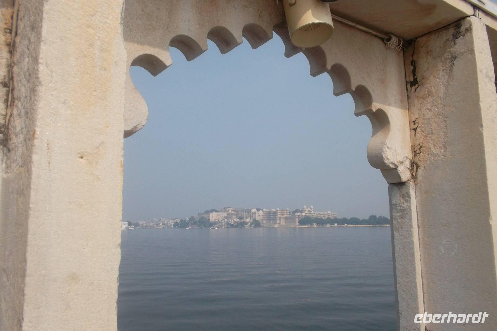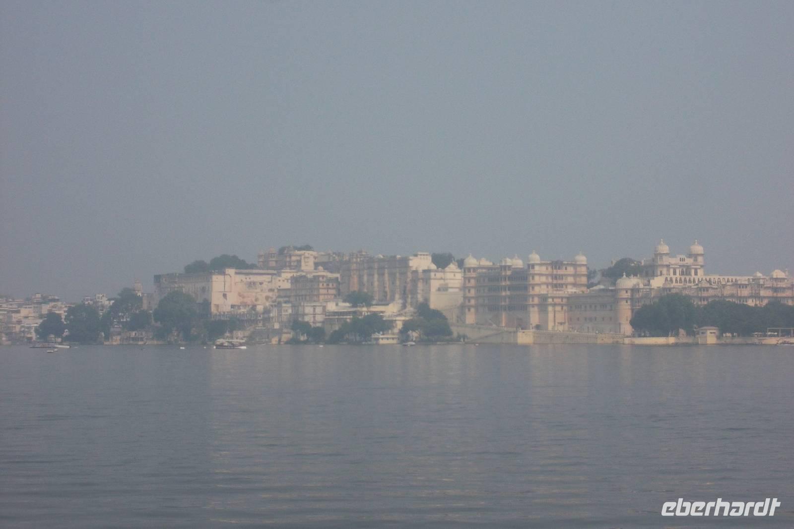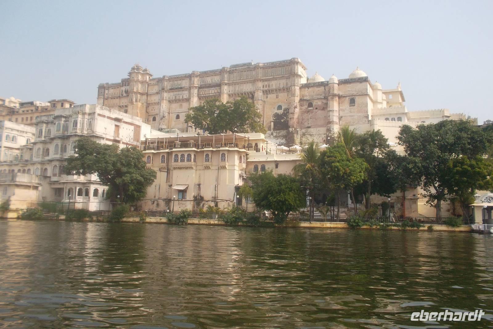 Das mitten in den Aravalli-Bergen gelegene Udaipur gilt als eines der für Inder beliebten Urlaubsziele und zudem wegen seiner etwas milderen Temperaturen als „Sommerfrische". Die hübsche Stadt - of als „weiße Stadt am See" apostrophiert - ist allemal einen Besuch wert. Wir begannen also unseren heutigen Tag mit einem Bummel von unserem zentral gelegenen Dreisternehotel „Rajdarshan" aus durch die überaus interessante Altstadt von Udaipur, die gerade zu erwachen begann. Vorbei an Wohnhäusern und Geschäften, an den Eingängen zu kleinen Tempeln und entlang bemalter Mauern und Hauseingänge, Garküchen und kleinen Werkstätten gelangten wir schließlich zum Jagdish-Schrein, dem Stadttempel von Udaipur. Wir konnten uns im Hindutempel umsehen und die Frömmigkeit der Menschen registrieren, bevor wir dem Stadtpalast einen Besuch abstatteten. Wie immer überfüllt - denn Udaipur ist auch bei Indern ein höchst beliebtes Touristenziel - präsentierte sich das gewaltige Bauwerk mit seinen Audienzsälen, Herrscherzimmern und Frauengemächern. Einer der Höhepunkte ist der mit Spiegelgläsern und Pfauenbildern aus Keramik verzierte Innenhof. Besonders hübsch war dann der Ausblick auf den See, als wir den Stadtpalast verließen, vor allem auf den Seepalast, in dem sich heute das „Lake-Palace"-Hotel" befindet, das auf dem Wasser zu schwimmen scheint. See, Ausblick und Stadt- sowie Seeschloß wurden schon oft als Filmkulisse genutzt: Nicht nur Bollywood-Regisseure wissen das schneeweiße „schwimmende" Schloß - das in Wirklichkeit natürlich auf einer Insel liegt - zu würdigen. Der Ort diente nicht nur als Filmkulisse für den James-Bond-Film „Octopussy", sondern auch für einen der berühmtesten deutschen Abenteuerfilme: Fritz Lang drehte Ende der 50er Jahre des 20. Jh. hier den bekannten deutschen Zweiteiler „Der Tiger von Eschnapur" und „Das indische Grabmal", mit Paul Hubschmidt in der Hauptrolle.