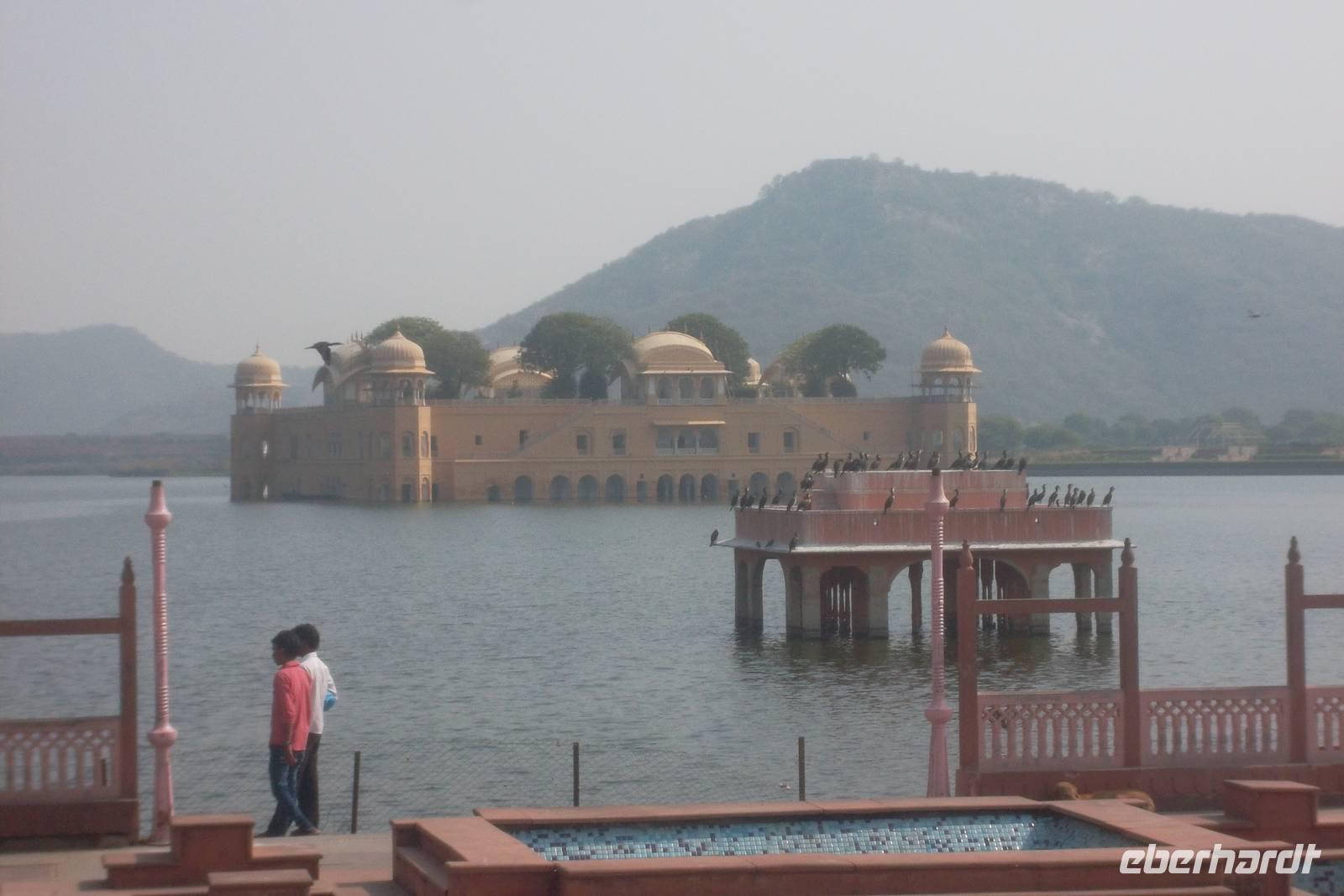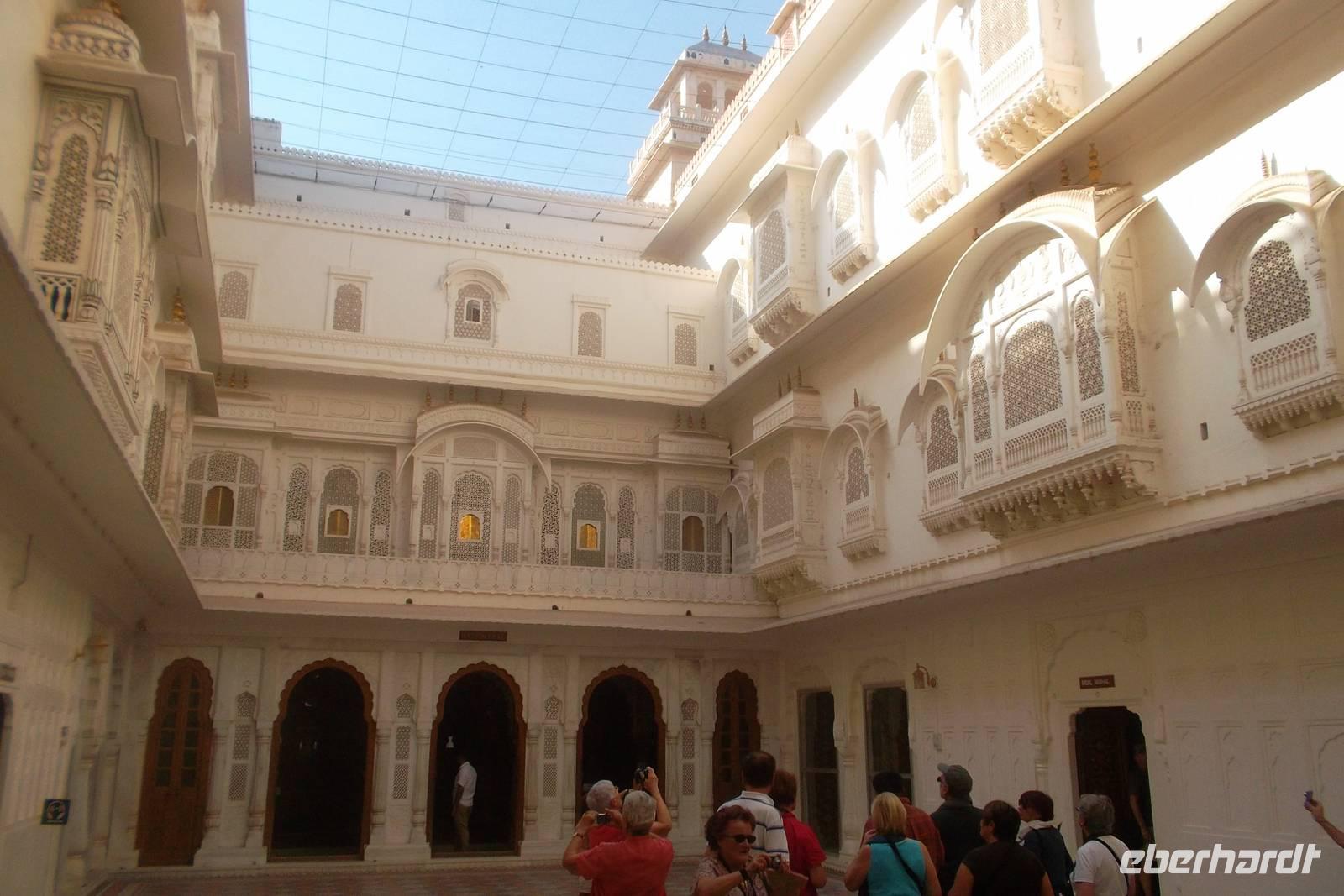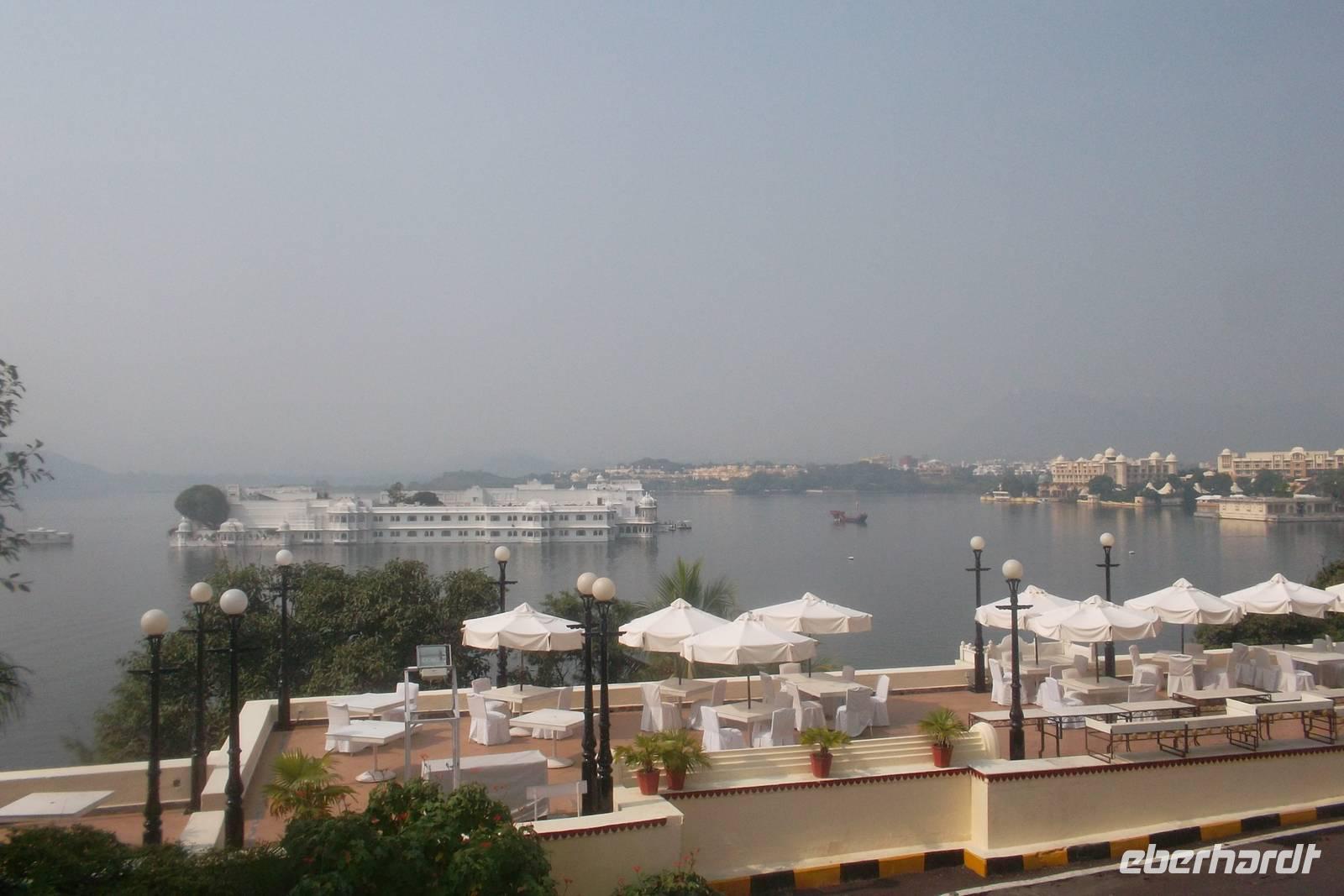 Das mitten in den Aravalli-Bergen gelegene Udaipur gilt als eines der für Inder beliebten Urlaubsziele und zudem wegen seiner etwas milderen Temperaturen als „Sommerfrische". Die hübsche Stadt - of als „weiße Stadt am See" apostrophiert - ist allemal einen Besuch wert. Wir begannen also unseren heutigen Tag mit einem Bummel von unserem zentral gelegenen Dreisternehotel „Rajdarshan" aus durch die überaus interessante Altstadt von Udaipur, die gerade zu erwachen begann. Vorbei an Wohnhäusern und Geschäften, an den Eingängen zu kleinen Tempeln und entlang bemalter Mauern und Hauseingänge, Garküchen und kleinen Werkstätten gelangten wir schließlich zum Jagdish-Schrein, dem Stadttempel von Udaipur. Wir konnten uns im Hindutempel umsehen und die Frömmigkeit der Menschen registrieren, bevor wir dem Stadtpalast einen Besuch abstatteten. Wie immer überfüllt - denn Udaipur ist auch bei Indern ein höchst beliebtes Touristenziel - präsentierte sich das gewaltige Bauwerk mit seinen Audienzsälen, Herrscherzimmern und Frauengemächern. Einer der Höhepunkte ist der mit Spiegelgläsern und Pfauenbildern aus Keramik verzierte Innenhof. Besonders hübsch war dann der Ausblick auf den See, als wir den Stadtpalast verließen, vor allem auf den Seepalast, in dem sich heute das „Lake-Palace"-Hotel" befindet, das auf dem Wasser zu schwimmen scheint. See, Ausblick und Stadt- sowie Seeschloß wurden schon oft als Filmkulisse genutzt: Nicht nur Bollywood-Regisseure wissen das schneeweiße „schwimmende" Schloß - das in Wirklichkeit natürlich auf einer Insel liegt - zu würdigen. Der Ort diente nicht nur als Filmkulisse für den James-Bond-Film „Octopussy", sondern auch für einen der berühmtesten deutschen Abenteuerfilme: Fritz Lang drehte Ende der 50er Jahre des 20. Jh. hier den bekannten deutschen Zweiteiler „Der Tiger von Eschnapur" und „Das indische Grabmal", mit Paul Hubschmidt in der Hauptrolle.