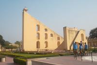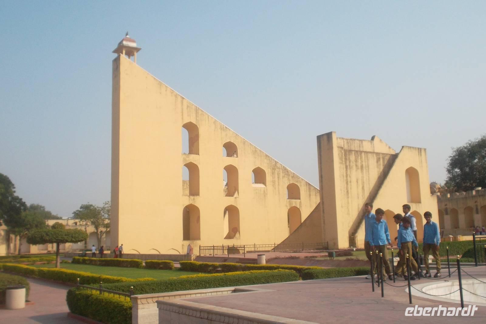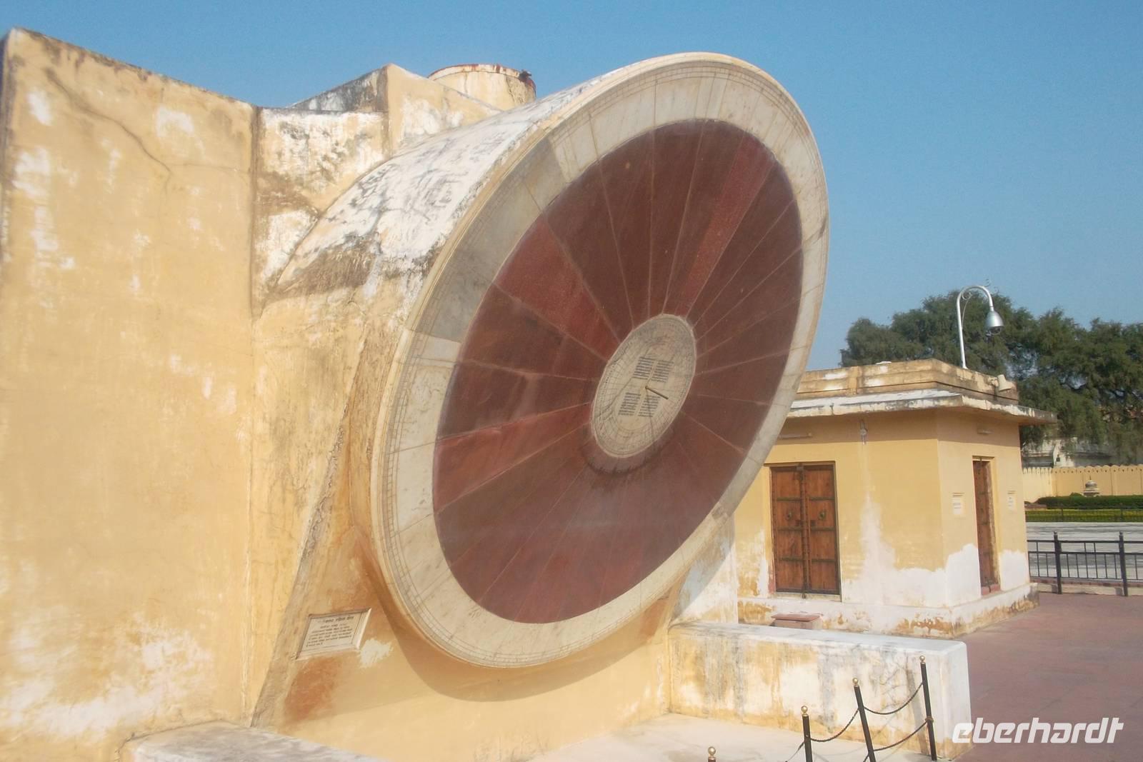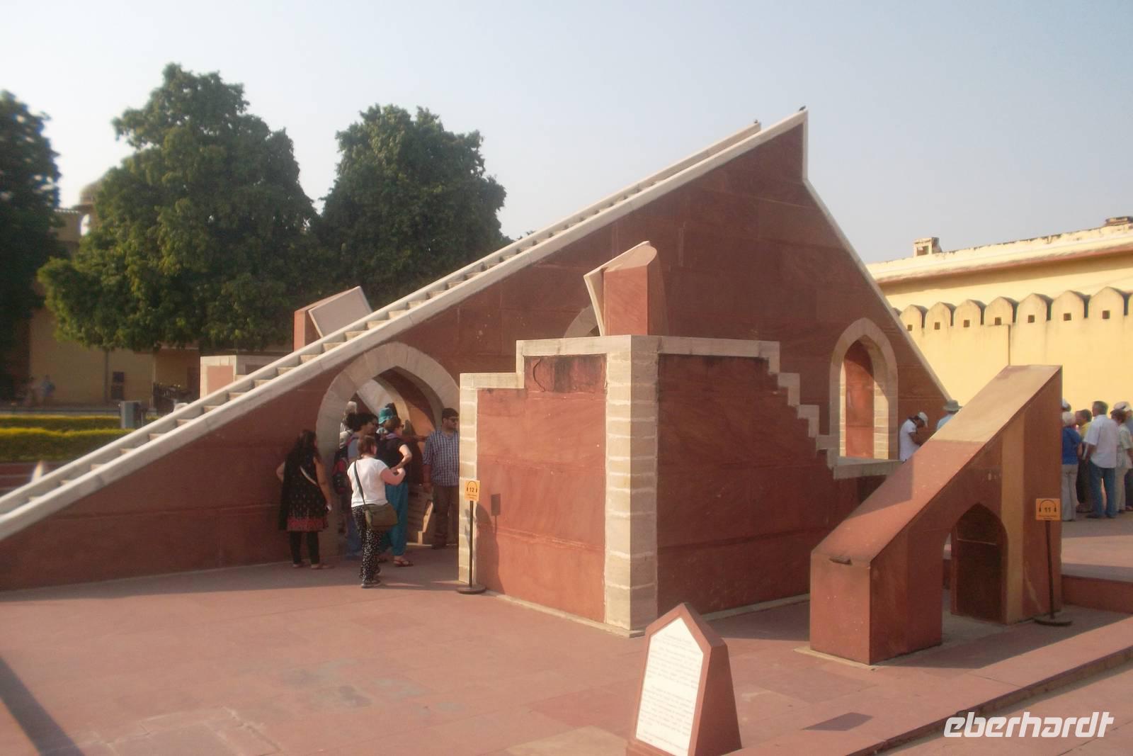Nach ausführlicher Besichtigung des Amber Forts fuhren wir mit kurzerhand angemieteten Jeeps den langen Weg zum Busparkplatz und kehrten danach in die Stadt Jaipur zurück. Der Nachmittag brachte uns das nächste UNESCO-Weltkulturerbe-Highlight - den Besuch des berühmten Steinernen Observatoriums „Jantar Mantar". Das bedeutet etwa „Magisches Gerät" und zeugt von der Wertschätzung, die man schon beim Bau der steinernen Himmelsbeobachtungszentren - nur fünf in Indien, eines im Iran und eines im usbekischen Samarkand sind überliefert - der wissenschaftlichen Leistung zollte. Jaipurs Herrscher Maharaja Jai Singh II. war schon im 18. Jahrhundert wissenschaftlich interessiert und ließ die steinernen Gerätschaften zur Beobachtung von Sonne, Mond und Sternen errichten. So kam es, dass hier Jaipur beispielsweise die größte Sonnenuhr der Welt steht - angeblich auf fünf Sekunden genau!
