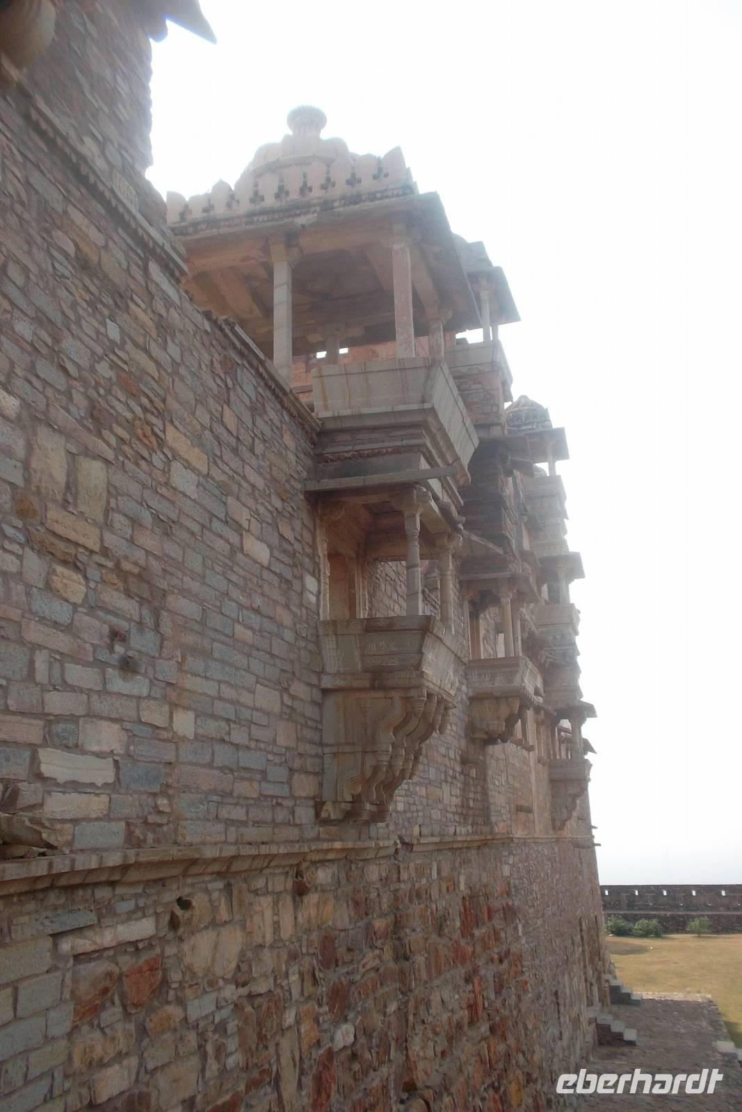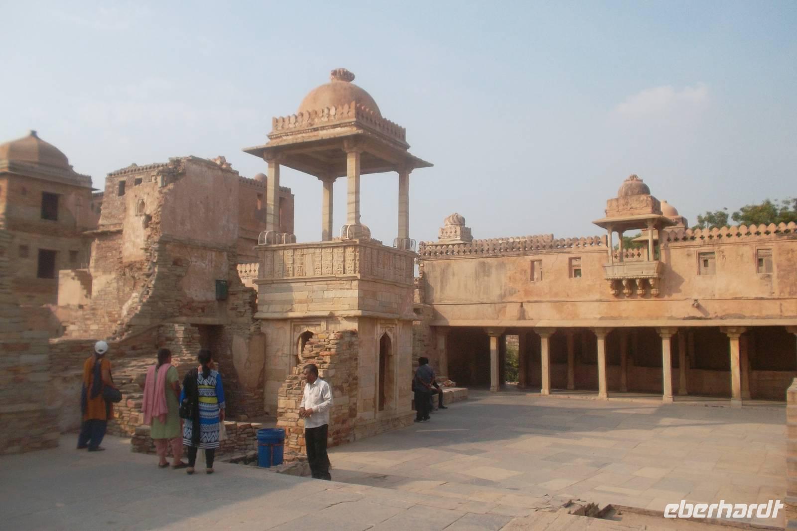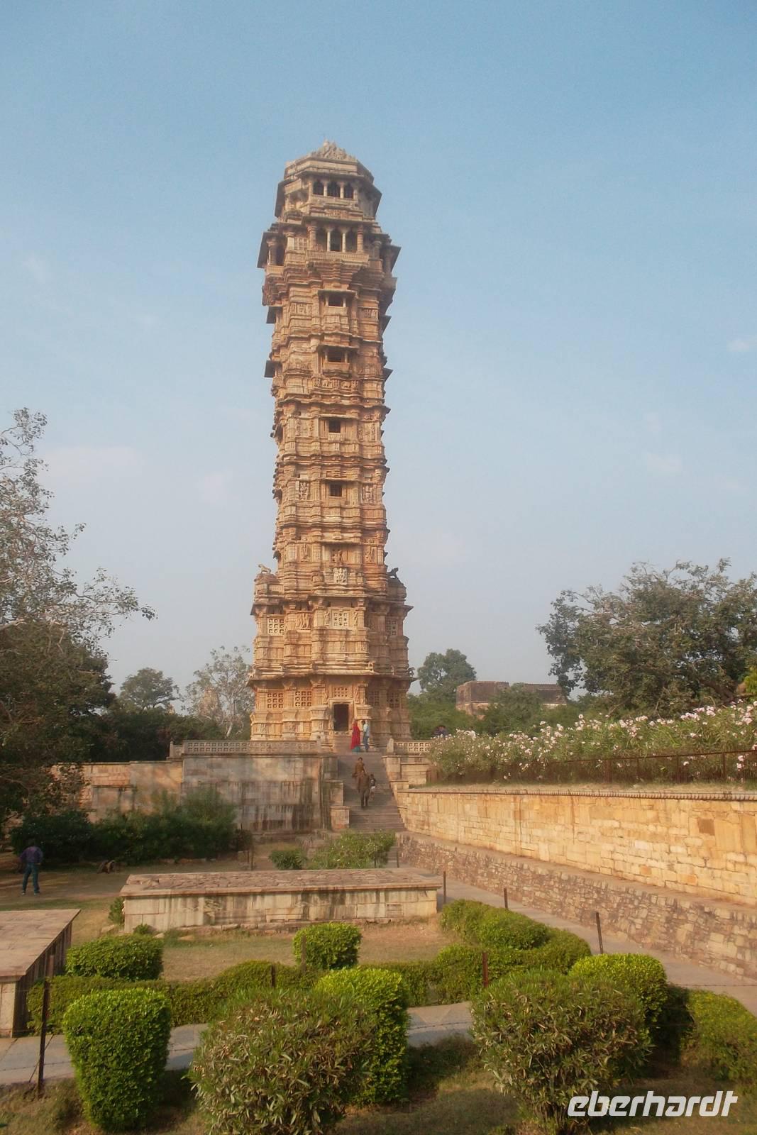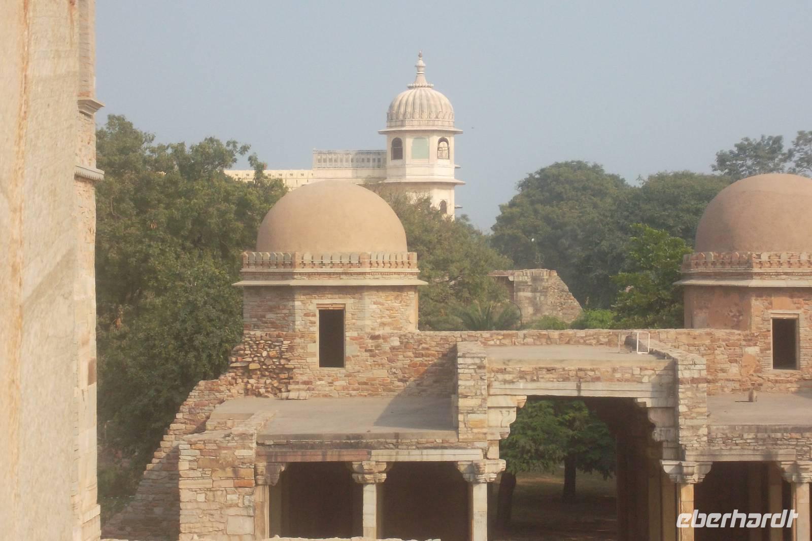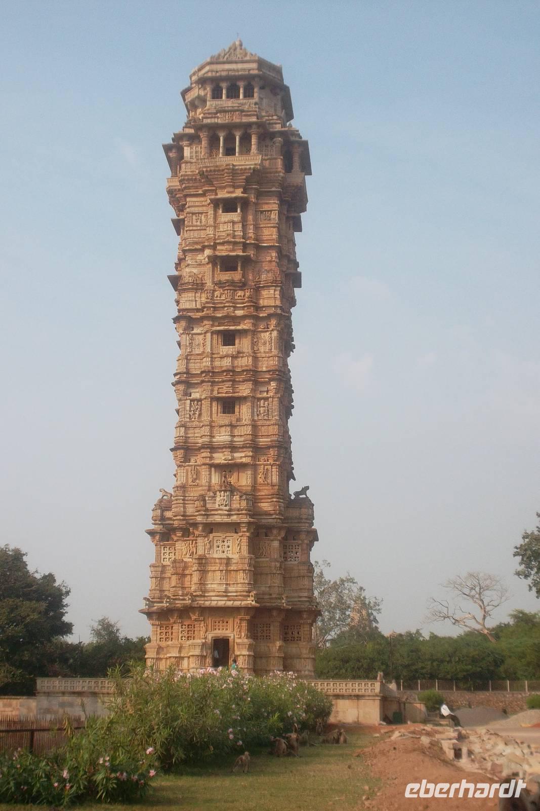 Das Gebiet, flach und steppenähnlich, wurde lebhafter, erste Höhenzüge, die zum über 1000 km langen Aravalli-Gebirge gehörten, zeigten sich. Nach langer Benutzung der Autobahn erreichten wir gegen Mittag Chittaurgarh. Der Ort, bis heute eine der größten Festungen der Welt, war einst die Hauptstadt des Königsreiches Marwar. Doch die Rajputenherrscher wollten sich der Gewalt der muslimischen Mogulkaiser nicht beugen und nach einigen Niederlagen mußte die Hauptstadt des Landes neu gegründet werden. So verlor Chittaurgarh seine Bedeutung an die damalige Neugründung Udaipur, aber die Reste seiner Befestigungen haben die Zeiten überdauert. Als besonderes Extra getreu dem Eberhardt-Motto „Richtig Reisen! In die ganze Welt!" hatten wir einen Abstecher in die Zitadelle vor. Unser indischer Reiseleiter Ambrish organisierte zwei Jeeps für unsere kleine Gruppe und wir fuhren ein paar Kilometer zu den Bauten und Ruinen von Chittaurgarh. Die Straße erwies sich als so eng und kurvenreich, dass unser Bus sie nicht hätte passieren können! Schon unterwegs staunten wir über die gewaltigen mehrfachen Befestigungsringe mit mehreren engen Stadttoren - alles zeugte von einstiger Macht und Sonderstellung der riesigen Zitadelle. Dann waren wir in der vielleicht größten Burganlage der Welt! Neben den Ruinen mehrere Paläste war das vielleicht schönste - im Übrigen komplett erhaltene - historische Bauwerk auch das von uns am meisten bestaunte: ein berühmter Siegesturm des Herrschers Rana Kumbha, der sogenannte „Vijaya Stambha" aus dem 15. Jh. Obwohl die meisten der Palastanlagen nur in Resten und als Ruinen erhalten sind, wirkt der 37 m hohe verzierte Turm würdevoll, kräftig und steckt voller Anziehungskraft. Zahlreiche Affen hielten sich in den Palastruinen auf und verliehen dem gesamten Besuch eine zusätzlich exotische Note. Nach Rückkehr zu unserem Bus ging es dann in die neue Hauptstadt des alten Reiches Mewar, nach Udaipur, das Herrscher Rana Udai Singh im 16. Jh. nach dem Sieg des Mogulherrschers Akhbar über Mewar in den Bergen gegründet hatte.