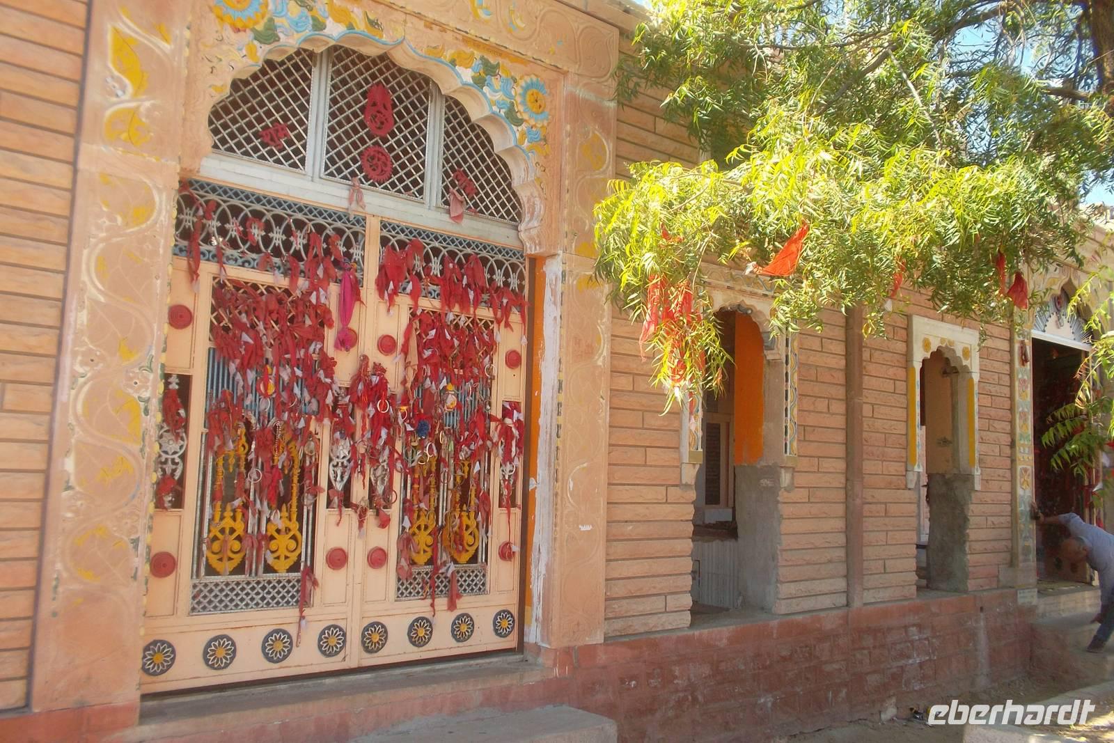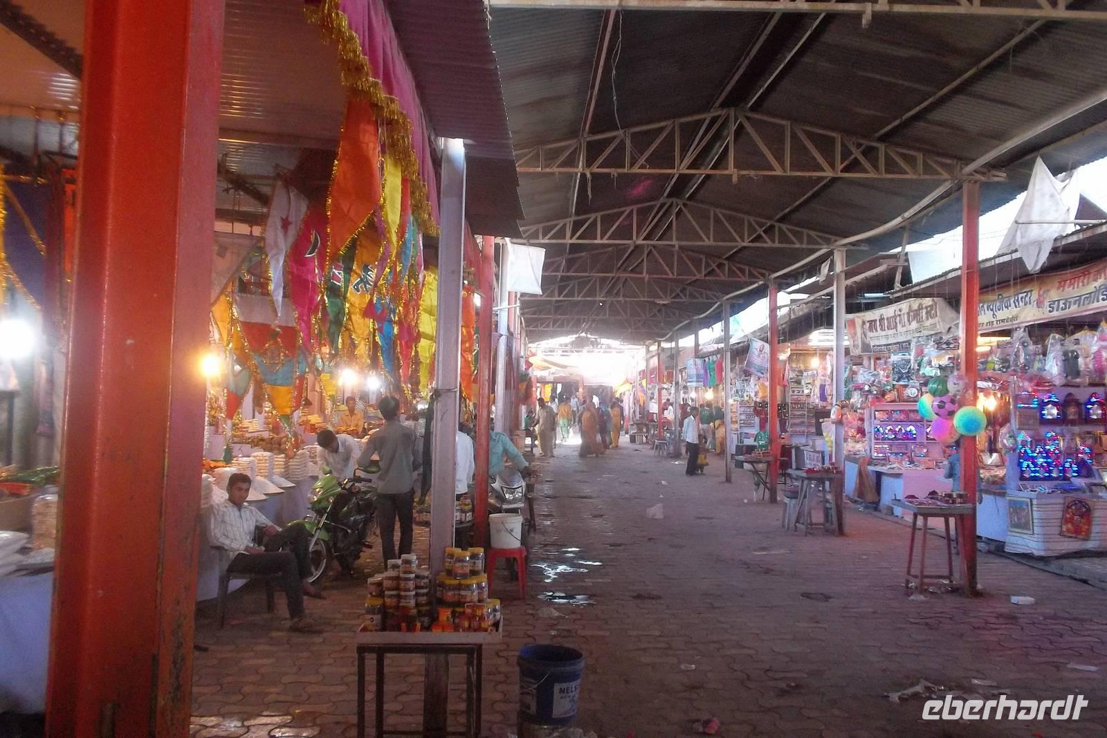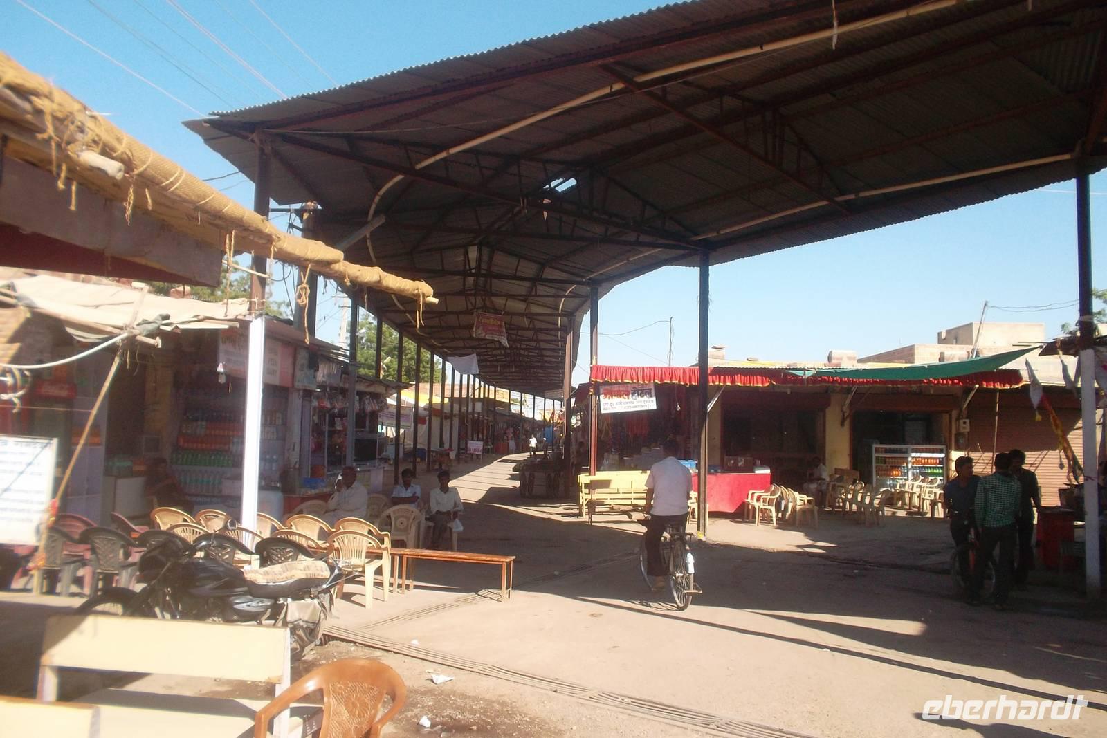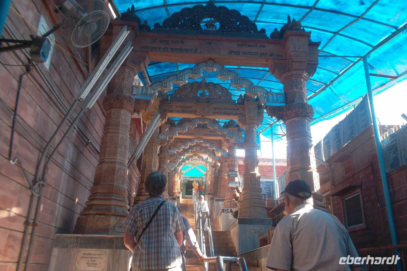 Auf unserem weiteren Weg gönnten wir uns noch ein kleines „Richtig Reisen!"-Extra: Reiseleiter Ambrish führte uns in einem kurzen Abstecher zu einem für Hindus bedeutenden, aufwendig gestalteten Wallfahrtsort. Ramdeora, in dessen Tempel eine lokale Stammesgottheit verehrt wird, ist außerhalb Indiens kaum bekannt. Der Ort unterscheidet sich mit seiner langgezogenen, von Wellblech überdachten Prozessionsstraße wesentlich von anderen Orten - obwohl er zur Hauptzeit im August jeden Jahres mehrere Millionen Pilger aufnimmt. Überall um den Tempel herum gibt es zahlreiche Verkaufsstände speziell für Opfergaben und für Mitbringsel, in denen mit grellbunten Auslagen, blinkenden Reklamelichtern und lauter aufreizender Musik um Kundschaft geworben wird.