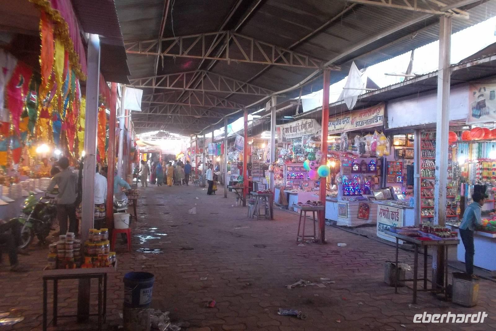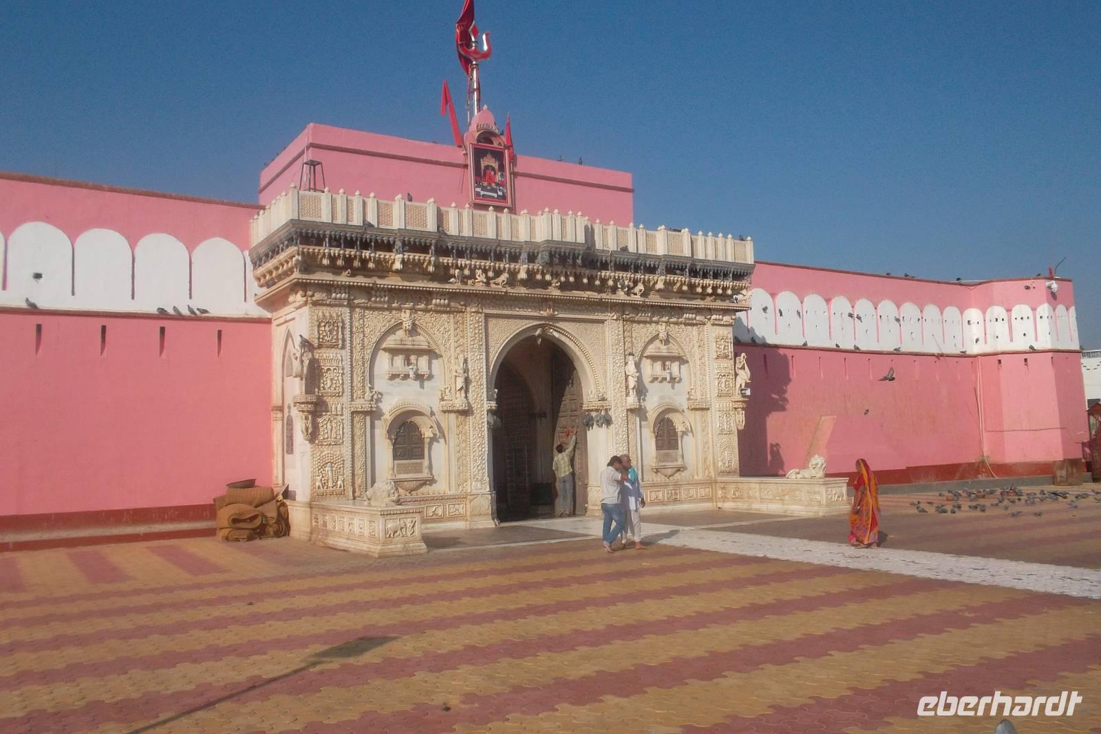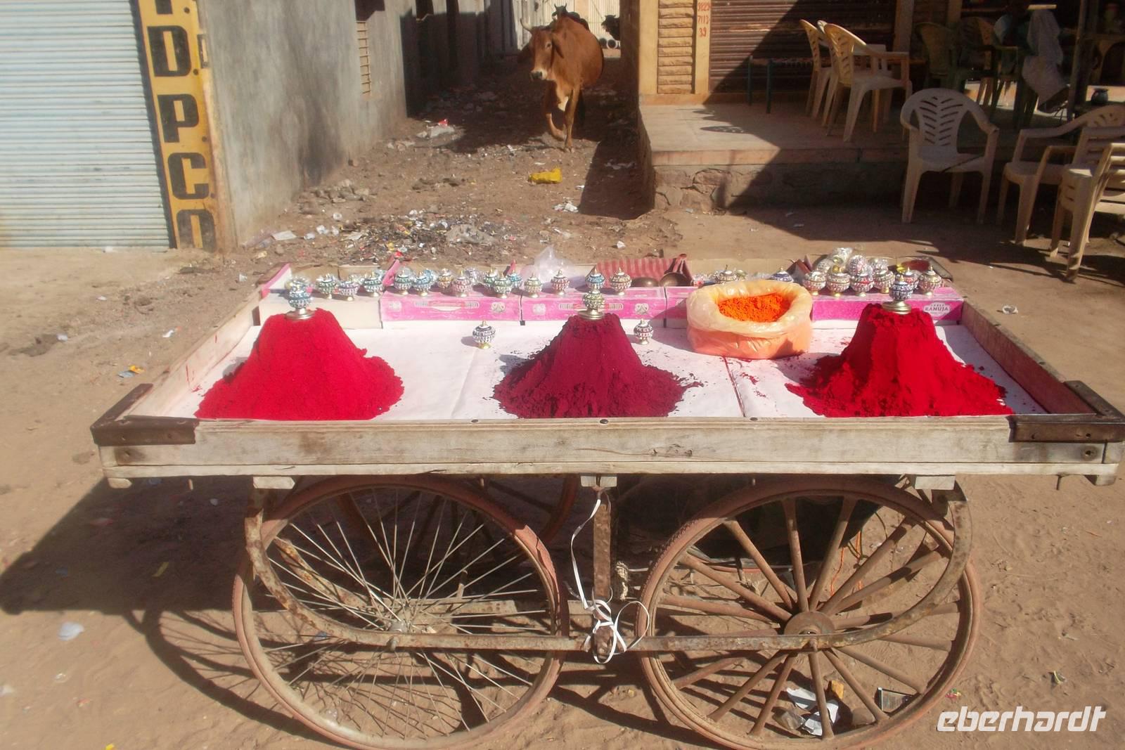 Auf unserem weiteren Weg gönnten wir uns noch ein kleines „Richtig Reisen!"-Extra: Reiseleiter Ambrish führte uns in einem kurzen Abstecher zu einem für Hindus bedeutenden, aufwendig gestalteten Wallfahrtsort. Ramdeora, in dessen Tempel eine lokale Stammesgottheit verehrt wird, ist außerhalb Indiens kaum bekannt. Der Ort unterscheidet sich mit seiner langgezogenen, von Wellblech überdachten Prozessionsstraße wesentlich von anderen Orten - obwohl er zur Hauptzeit im August jeden Jahres mehrere Millionen Pilger aufnimmt. Überall um den Tempel herum gibt es zahlreiche Verkaufsstände speziell für Opfergaben und für Mitbringsel, in denen mit grellbunten Auslagen, blinkenden Reklamelichtern und lauter aufreizender Musik um Kundschaft geworben wird.