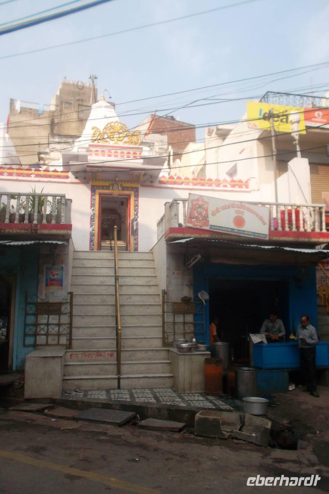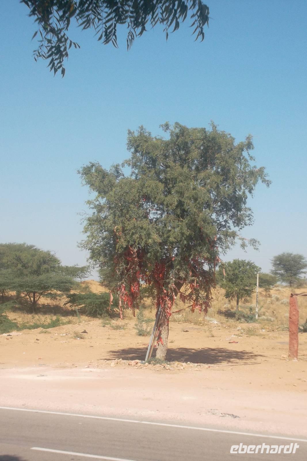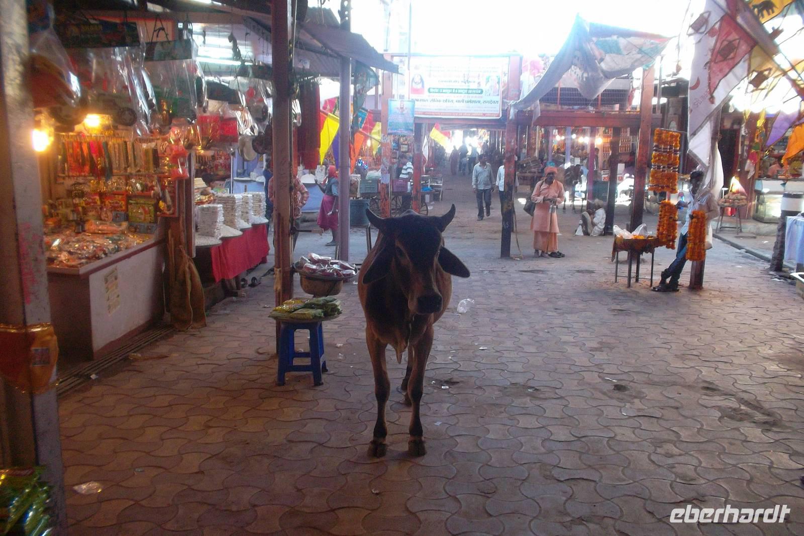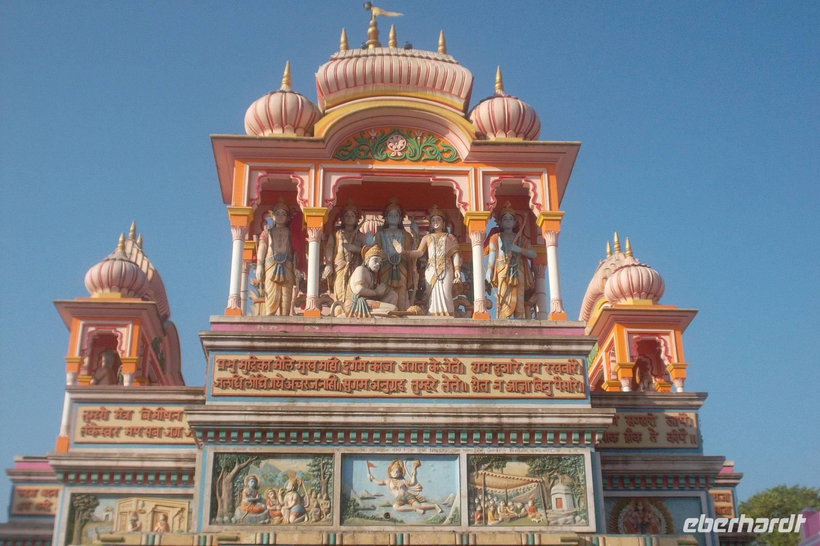 Auf unserem weiteren Weg gönnten wir uns noch ein kleines „Richtig Reisen!"-Extra: Reiseleiter Ambrish führte uns in einem kurzen Abstecher zu einem für Hindus bedeutenden, aufwendig gestalteten Wallfahrtsort. Ramdeora, in dessen Tempel eine lokale Stammesgottheit verehrt wird, ist außerhalb Indiens kaum bekannt. Der Ort unterscheidet sich mit seiner langgezogenen, von Wellblech überdachten Prozessionsstraße wesentlich von anderen Orten - obwohl er zur Hauptzeit im August jeden Jahres mehrere Millionen Pilger aufnimmt. Überall um den Tempel herum gibt es zahlreiche Verkaufsstände speziell für Opfergaben und für Mitbringsel, in denen mit grellbunten Auslagen, blinkenden Reklamelichtern und lauter aufreizender Musik um Kundschaft geworben wird.