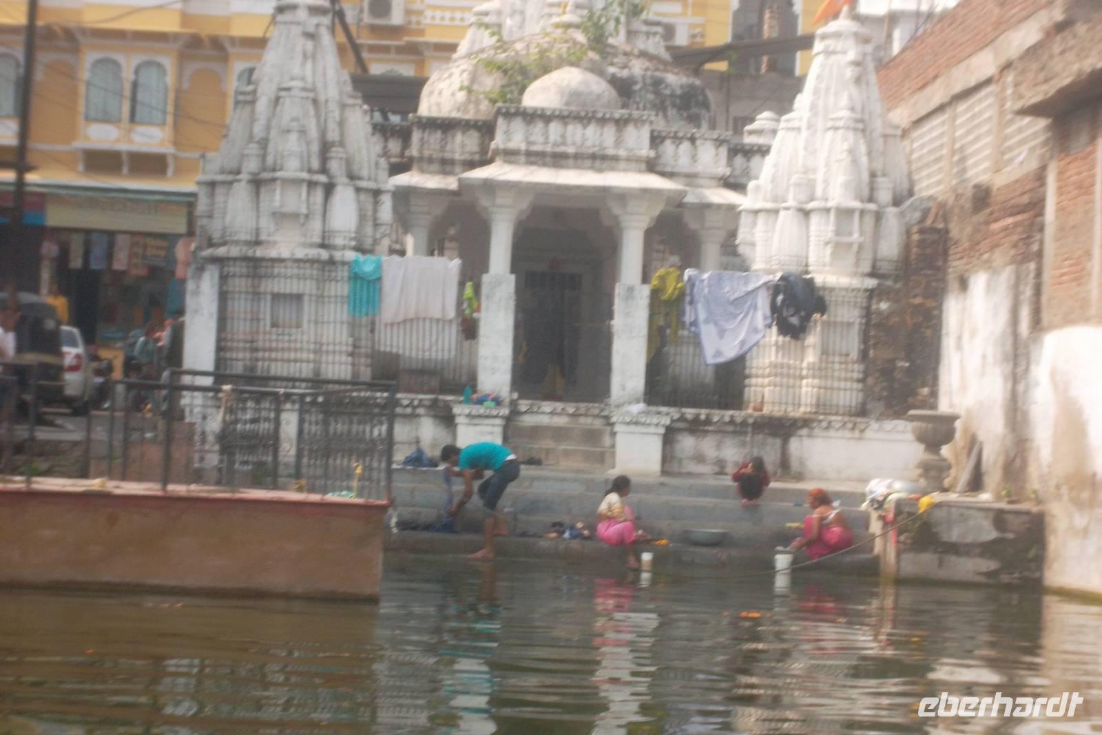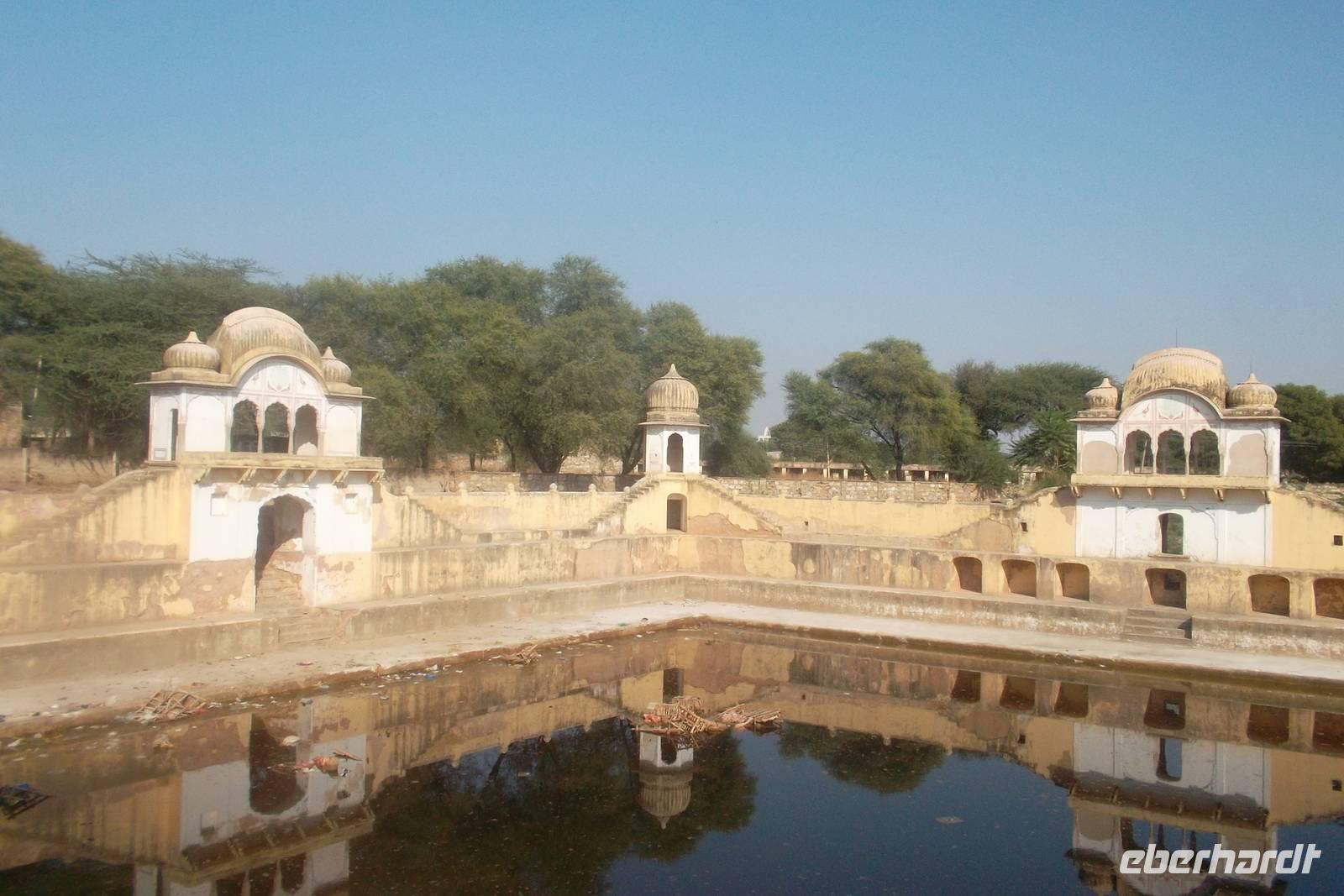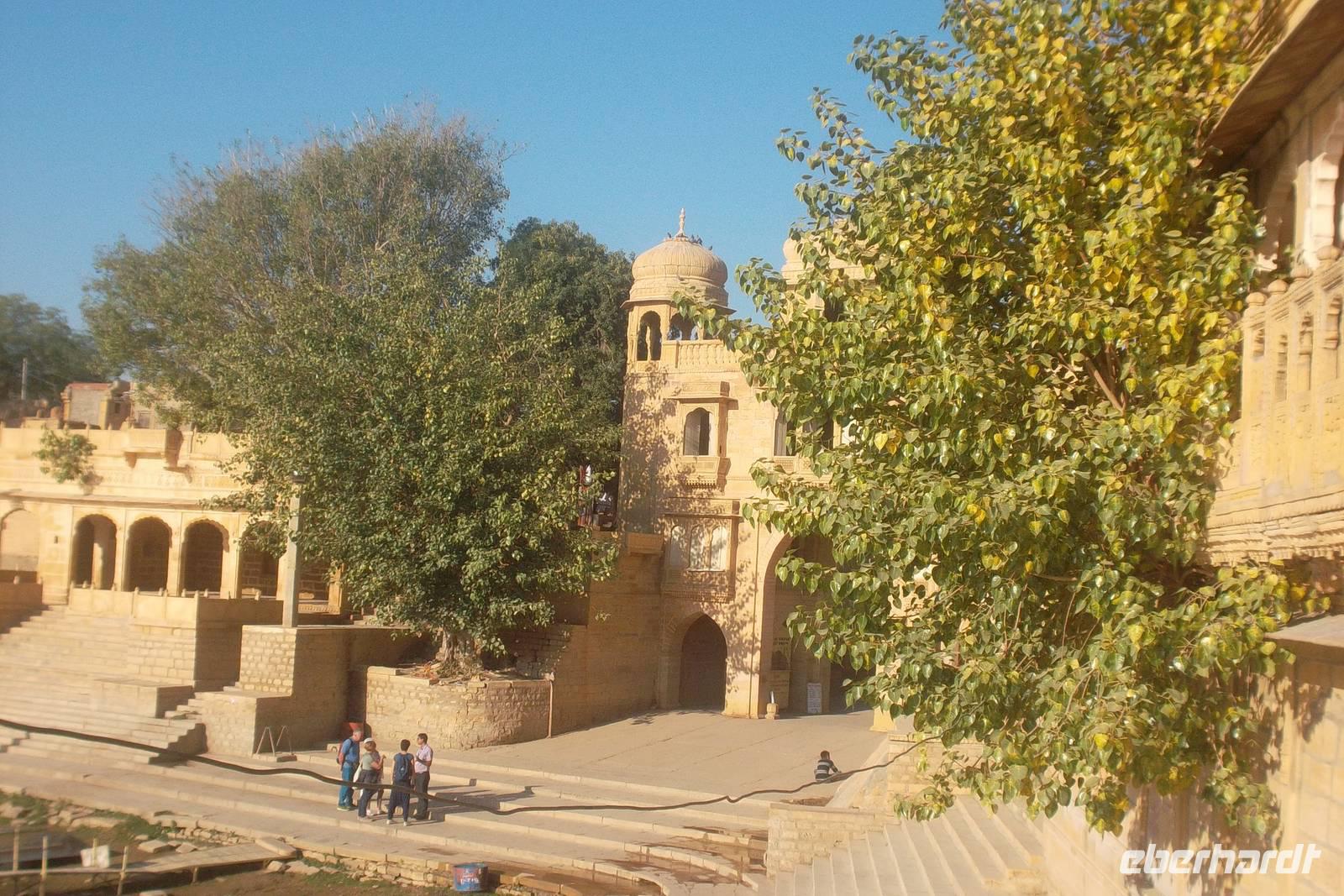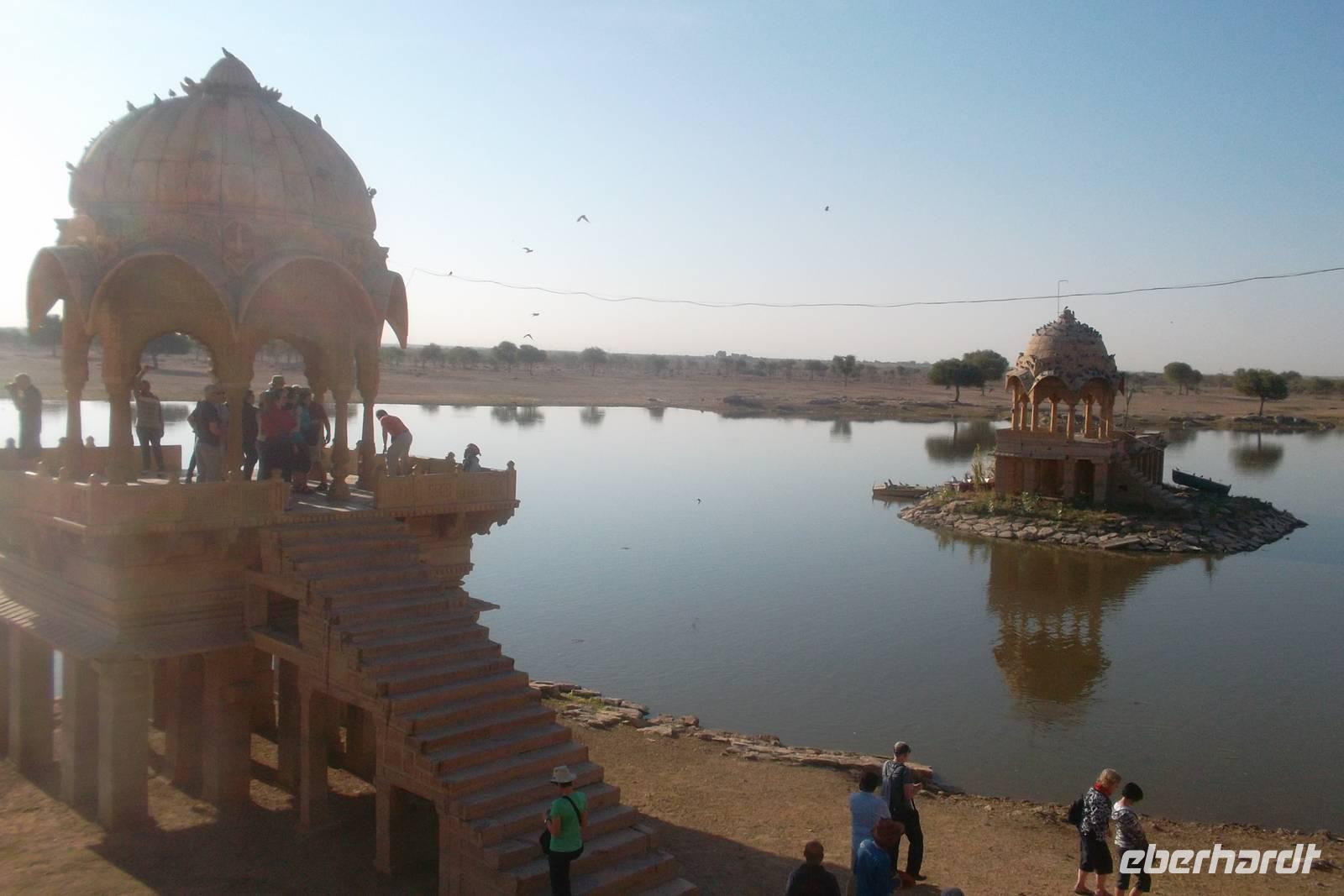 Der „heilige" See vor den Toren Jaisalmers war einer der wichtigsten Überlebensfaktoren für denm im 12. Jh. gegründeten Rajputenstaat. Es handelt sich um einen in der Wüste zum Auffangen von Regenwasser angelegten Monsunstausee, der die Fruchtbarkeit der Oase und den Grundwasserspiegel sicherte. Versehen mit einem alten Tor, verschiedener Randbebauung und einem Shivatempel ist er ein Anziehungspunkt für Einheimische, besonders aber (morgens!) für Touristen.