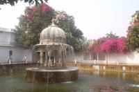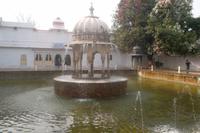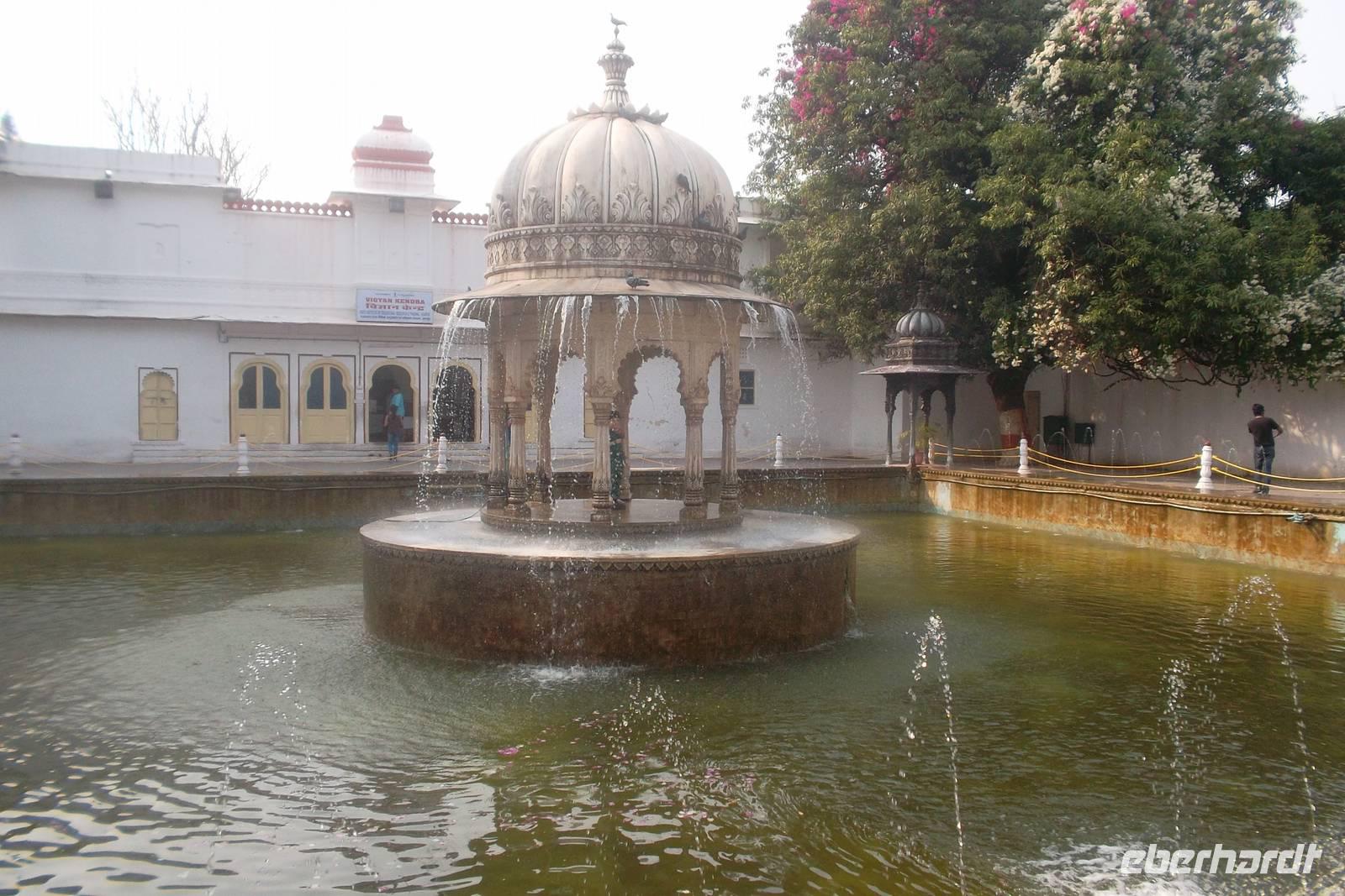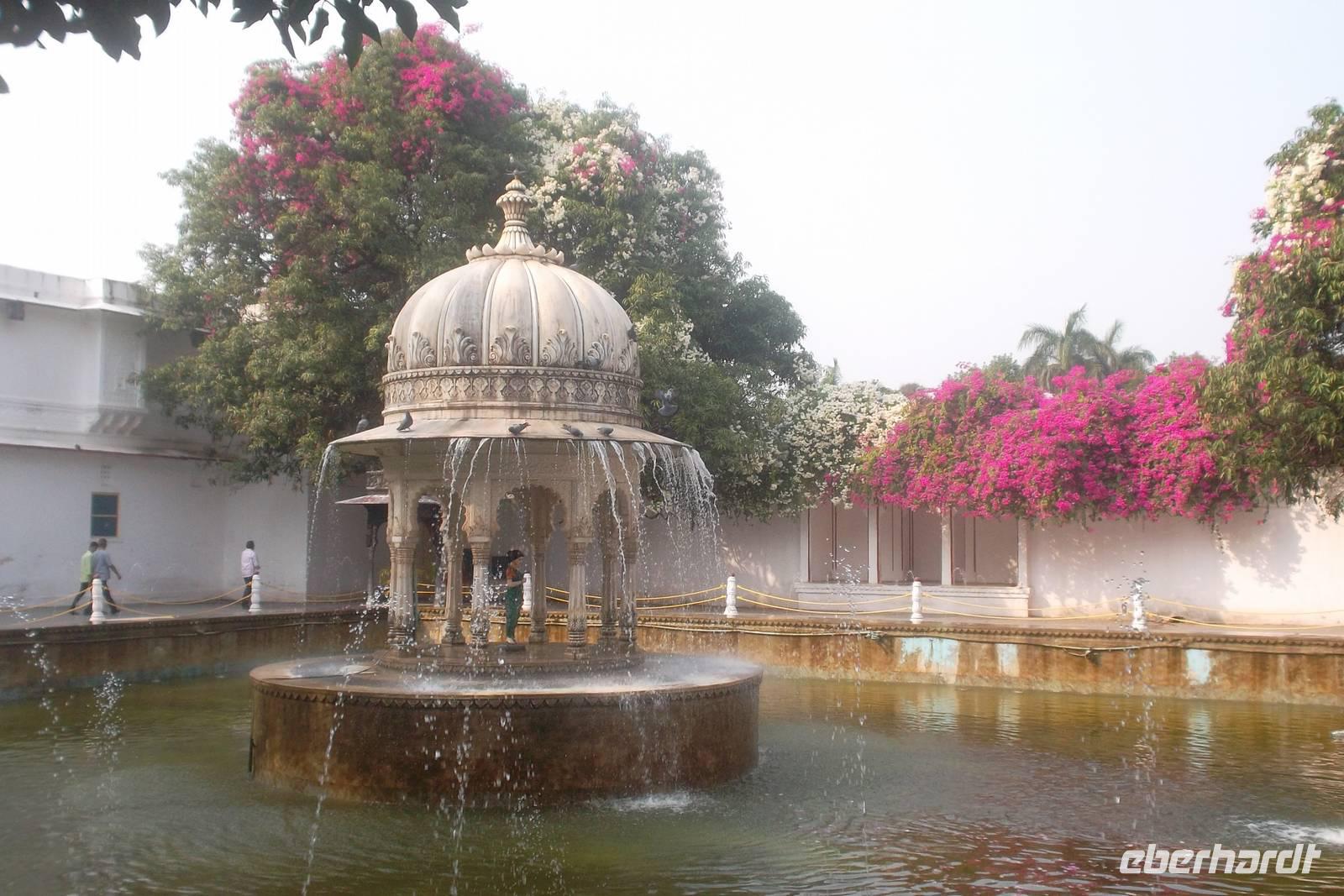 Als nächsten Höhepunkt erlebten wir dann unsere Bootsfahrt auf dem im Monsun reichhaltig mit Wasser gefüllten Pichola-See. Das ruhige Dahingleiten mit atemberaubenden Ausblicken auf das gewaltige Stadtschloss und den Seepalast ist ein echter Genuss! Wir unterbrachen die Bootsfahrt auf der kleinen Insel mit dem berühmten Garten „Jaghmandir" und kehrten dann „an Land" zurück. Nach dem Mittagessen besuchten wir noch eine weitere Sehenswürdigkeit, die snst nicht jeder ausländische Besucher zu sehen bekommt: „Saheliyon Ki Bari", der sogenannte „Garten der Jungfrauen" gilt als „geheimer Garten", den früher nur die Damen des Hofes betreten durften. Versehen mit vielen Wasserspielen und Springbrunnen, gespeist aus dem nahen Fateh-See, hat ihn angeblich der Maharana von Udaipur im 18. Jahrhundert selbst entworfen und seinen Frauen zum Geschenk gemacht.