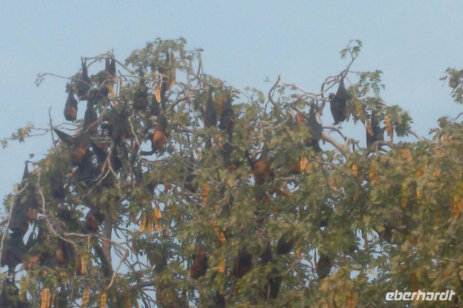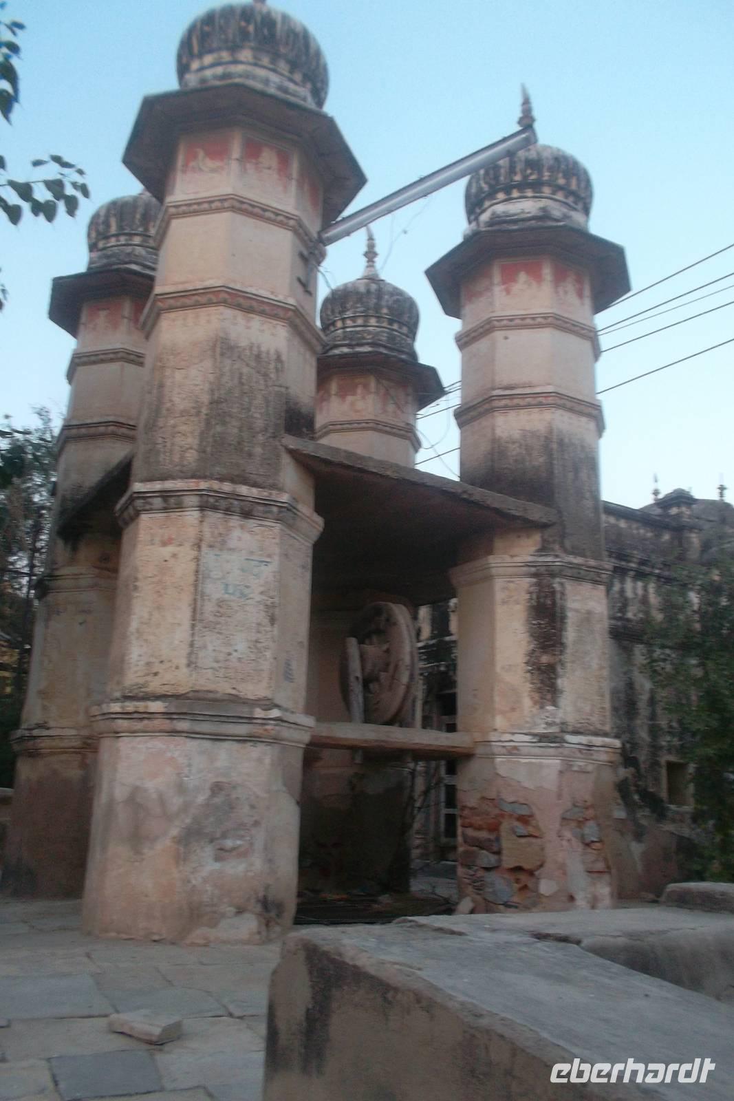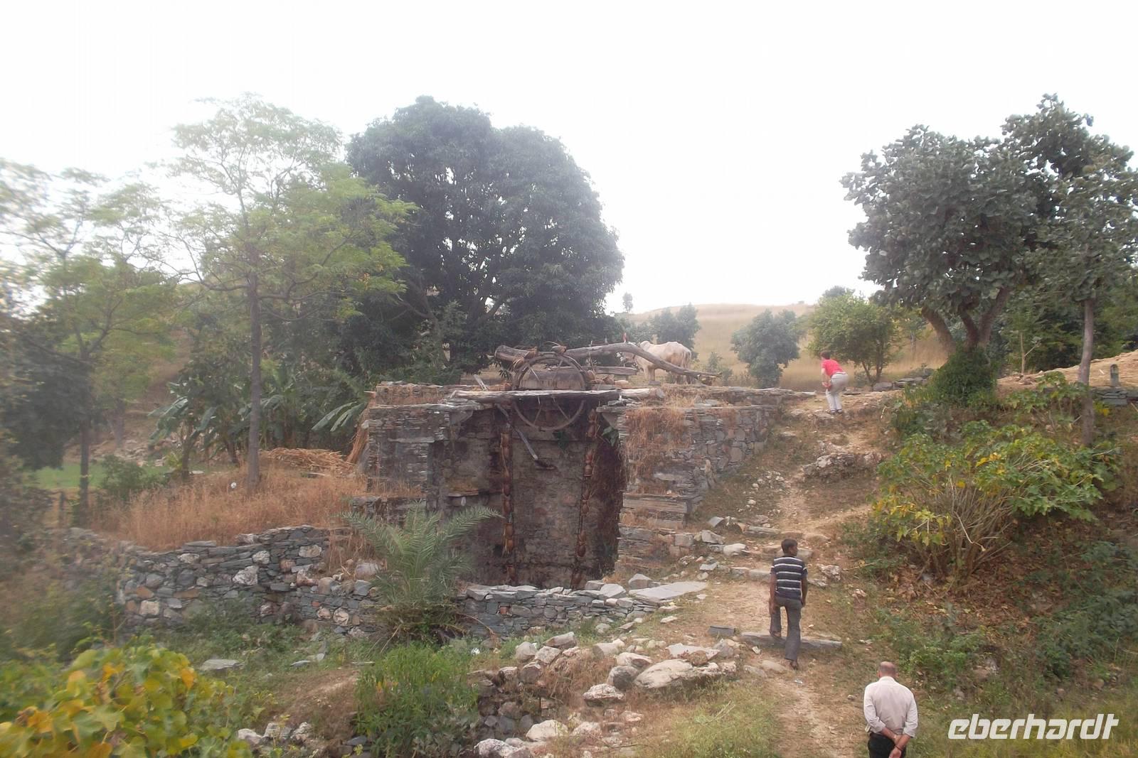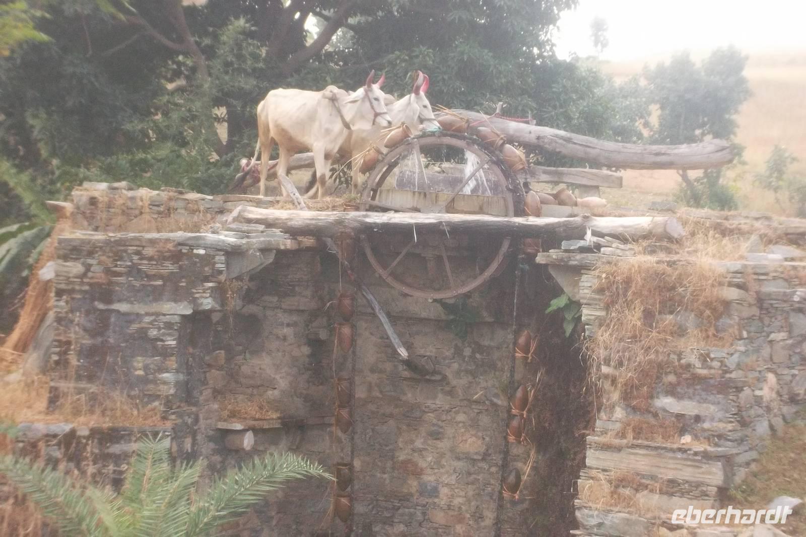 Heute durchquerten wir die Gebirgsfalten der Aravalli-Berge. Nach einem Fotostopp an einem Baum voller Flughunde - die nachtaktiven Tiere hielten hier ihren Tagesschlaf - durchfuhren ein Gebiet mit vielen hochinteressanten uralten Wasser-Förderanlagen. Schon die Arier, die Nord- und Mittelindien vor Jahrtausenden eroberten, bedienten sich derselben Technik: die historischen Wasserschöpf-Anlagen in den felsigen und normalerweise wasserarmen Höhenzügen nutzen die vom Monsunregen gefüllten Teiche und Wasserlöcher, die wiederum Quellen und kleine Grundwasserseen speisen. Lange Bänder aus Gewebe und Stricken laufen über ein großes Holzrad und reichen bis zum Wasserspiegel. Becher, kleine Blechbehälter oder Schöpfkrüge sind an den ununterbrochen umlaufenden Bändern befestigt und fördern das Wasser nach oben. Das Schöpfrad wird über ein System von Zahnrädern - oft aus Holz - bewegt, die durch ein angetrieben werden. Das hochgeschöpfte Wasser entleeren die sich weiter mitdrehenden Krüge in ein Wasserbecken, von wo aus es dann über Kanäle verteilt wird, um die Felder zu bewässern.