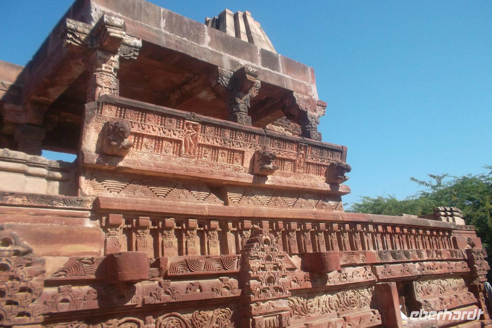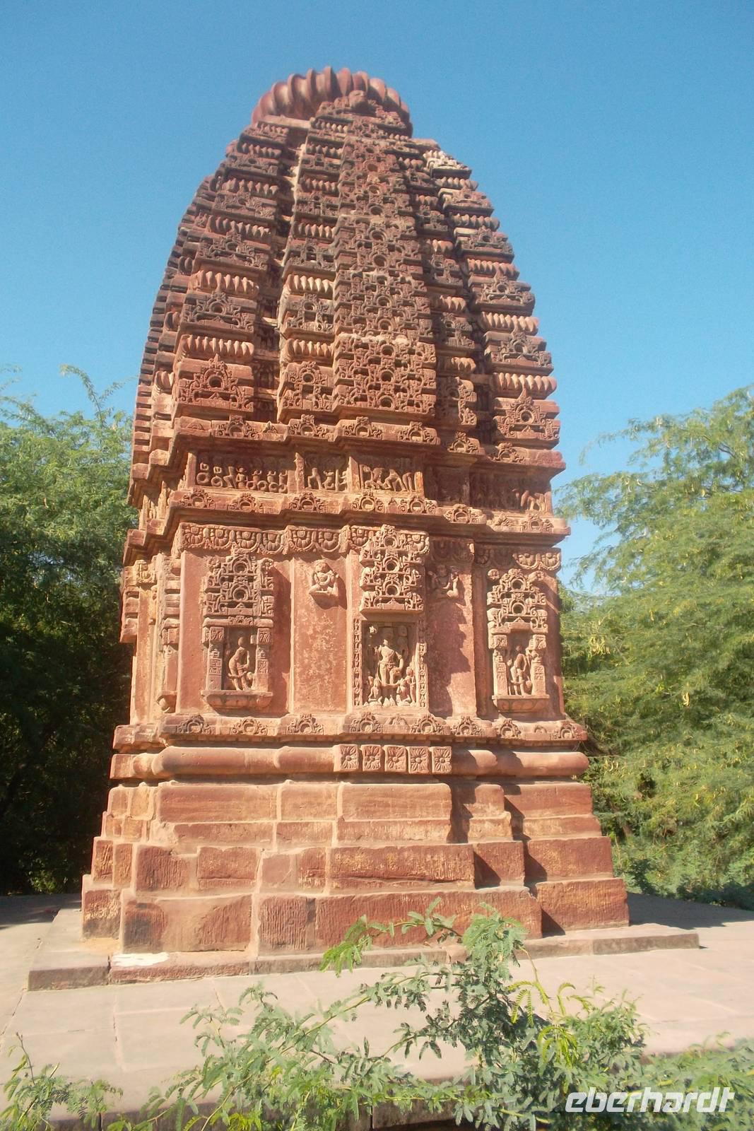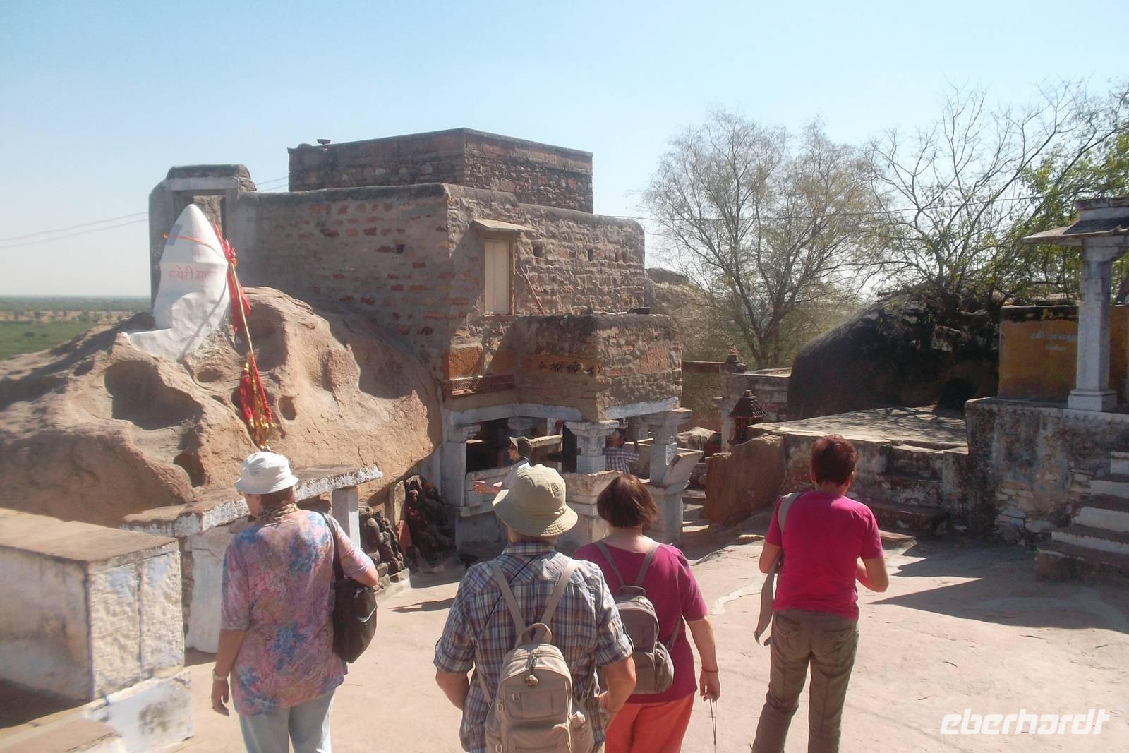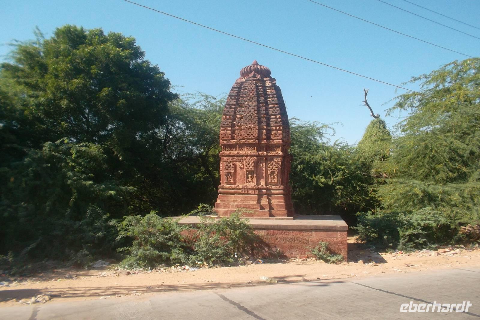 Erstes Ziel waren heute die berühmten Wallfahrts-Tempel von Osyan ein. Der Ort ist ein wichtiges Pilgerzentrum von Hindus und Jains - und das seit über 1300 Jahren ist der Ort ein Wallfahrtsziel und Pilgerzentrum. Im gewaltigen neuen Sachiya Mata Tempel stellt der stufenförmige Aufbau das Himmelsgefüge dar, überspannt von mehreren Torana-Torbögen, die den Übergang von der profanen zur himmlischen Welt symbolisieren sollen. Verehrt werden hier, in Jahrhunderten immer wieder neu durch reichen Figurenschmuck verziert, mehrere der bedeutenden Hindugötter, natürlich der mächtige Zerstörergott Shiva mit seinem Symbol, dem Dreizack, aber auch die Muttergöttin Durga in einer ihrer vielen Inkarnationen. Aber noch ältere Tempel finden sich im Wallfahrtsort, direkt neben dem eigentlichen Ortseingang. Zum Teil nicht mehr komplett erhalten, findet man hier einige kleinere, heute nicht mehr genutzte Sakralbauwerke. Errichtet um 700 - 800 n.Chr. kann man nicht mehr alle dieser Sandsteintempel zuordnen. Sie alle werden nicht mehr genutzt, aber man vermutet einige als Kultplätze des einstigen Gottes Indra, für mindestens drei der größeren aber ist die Nutzung als „Harihara"-Tempel wahrscheinlich, in der die eigentlich gegensätzlichen Aspekte zweier Hauptgötter - Vishnu als Bewahrer und Shiva als Zerstörer - in einer Einheit begriffen und verehrt wurden.