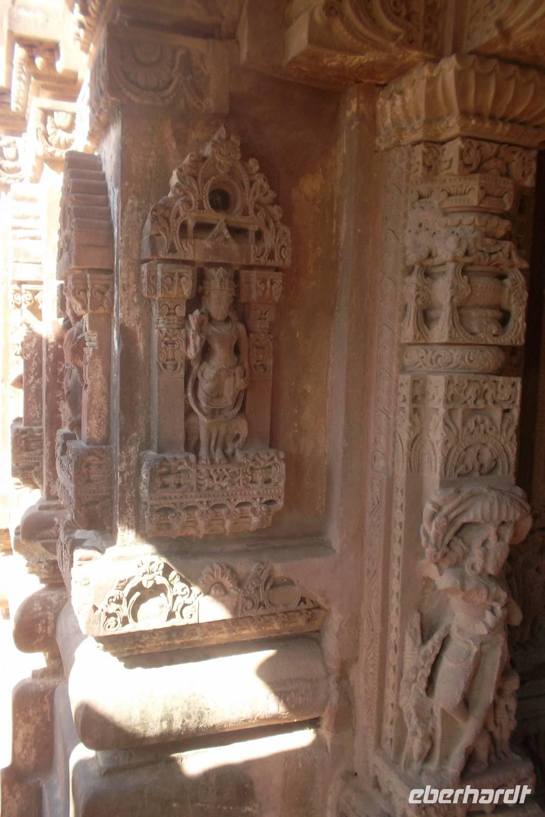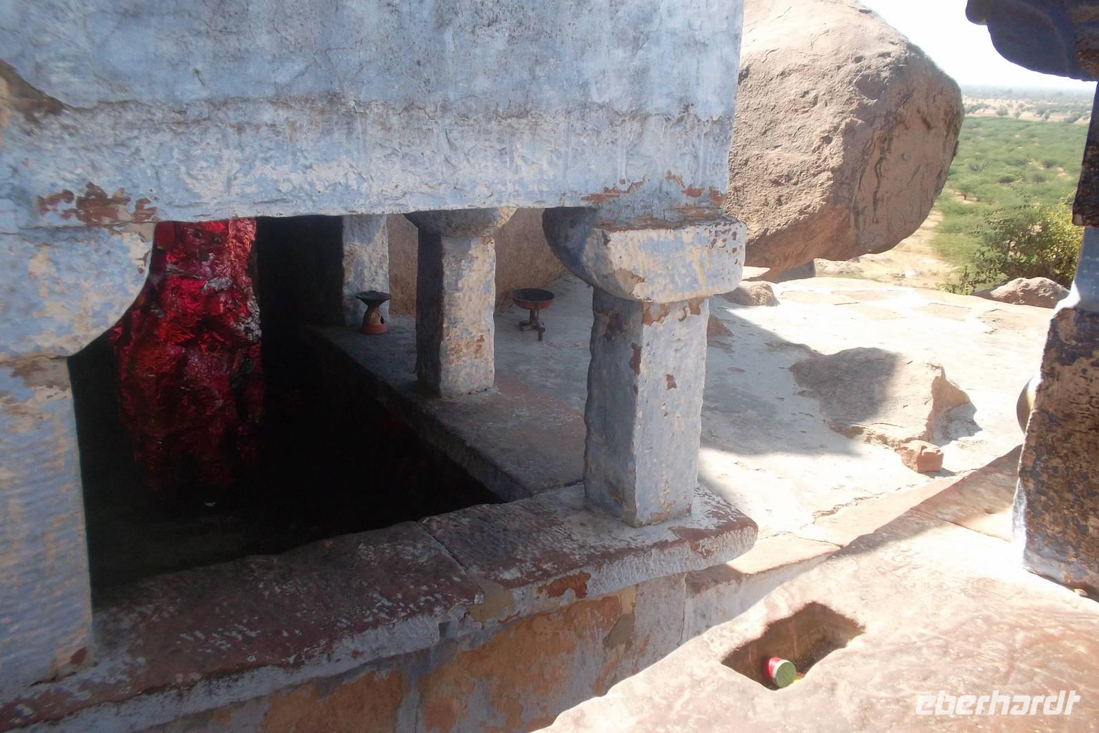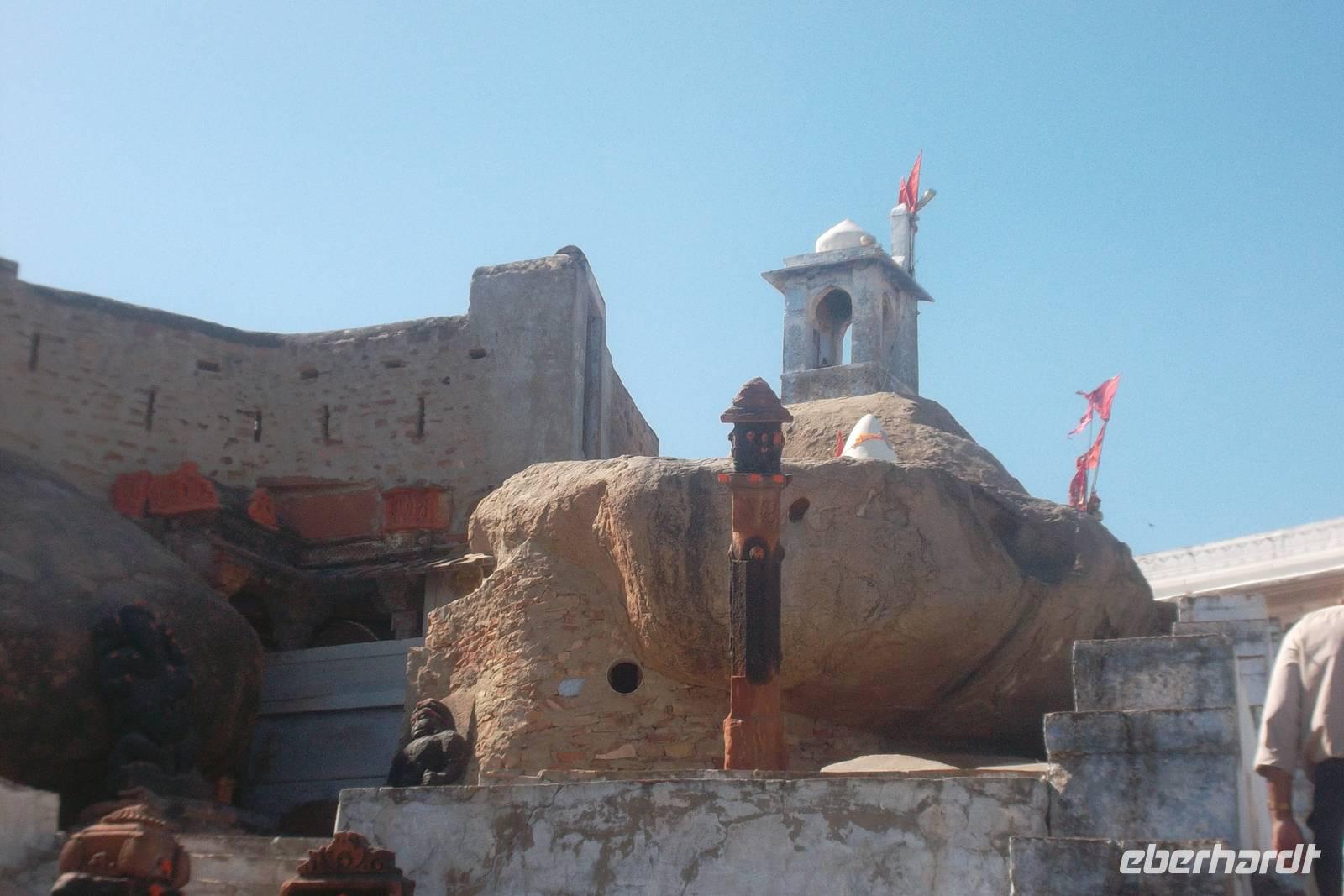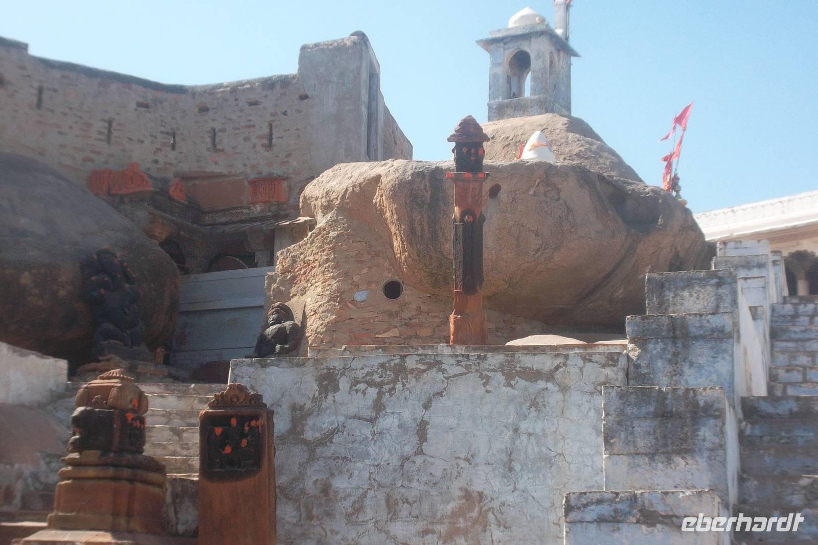 Erstes Ziel waren heute die berühmten Wallfahrts-Tempel von Osyan ein. Der Ort ist ein wichtiges Pilgerzentrum von Hindus und Jains - und das seit über 1300 Jahren ist der Ort ein Wallfahrtsziel und Pilgerzentrum. Im gewaltigen neuen Sachiya Mata Tempel stellt der stufenförmige Aufbau das Himmelsgefüge dar, überspannt von mehreren Torana-Torbögen, die den Übergang von der profanen zur himmlischen Welt symbolisieren sollen. Verehrt werden hier, in Jahrhunderten immer wieder neu durch reichen Figurenschmuck verziert, mehrere der bedeutenden Hindugötter, natürlich der mächtige Zerstörergott Shiva mit seinem Symbol, dem Dreizack, aber auch die Muttergöttin Durga in einer ihrer vielen Inkarnationen. Aber noch ältere Tempel finden sich im Wallfahrtsort, direkt neben dem eigentlichen Ortseingang. Zum Teil nicht mehr komplett erhalten, findet man hier einige kleinere, heute nicht mehr genutzte Sakralbauwerke. Errichtet um 700 - 800 n.Chr. kann man nicht mehr alle dieser Sandsteintempel zuordnen. Sie alle werden nicht mehr genutzt, aber man vermutet einige als Kultplätze des einstigen Gottes Indra, für mindestens drei der größeren aber ist die Nutzung als „Harihara"-Tempel wahrscheinlich, in der die eigentlich gegensätzlichen Aspekte zweier Hauptgötter - Vishnu als Bewahrer und Shiva als Zerstörer - in einer Einheit begriffen und verehrt wurden.