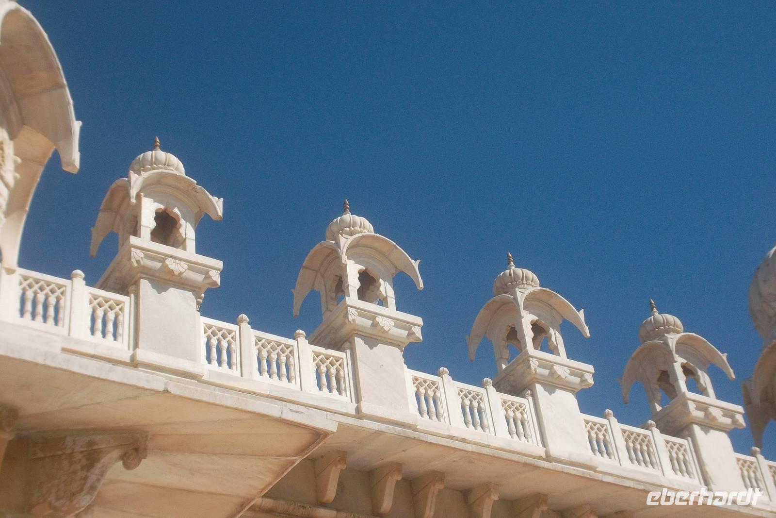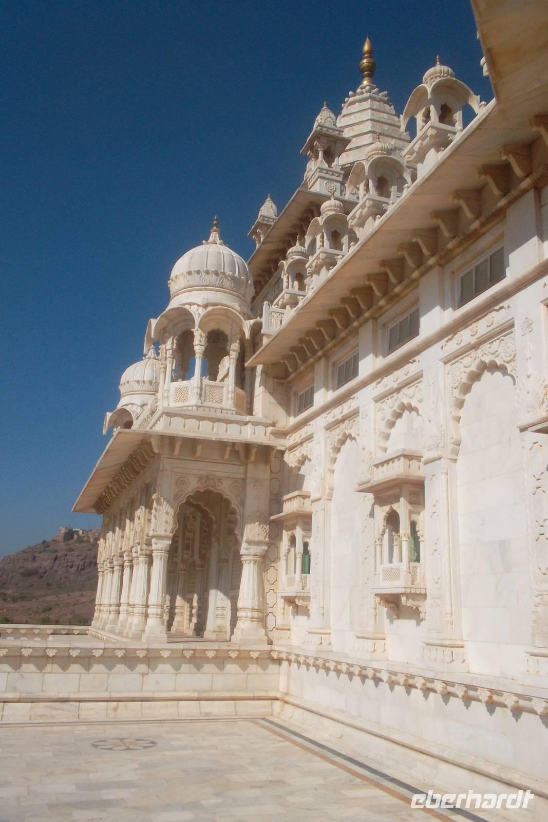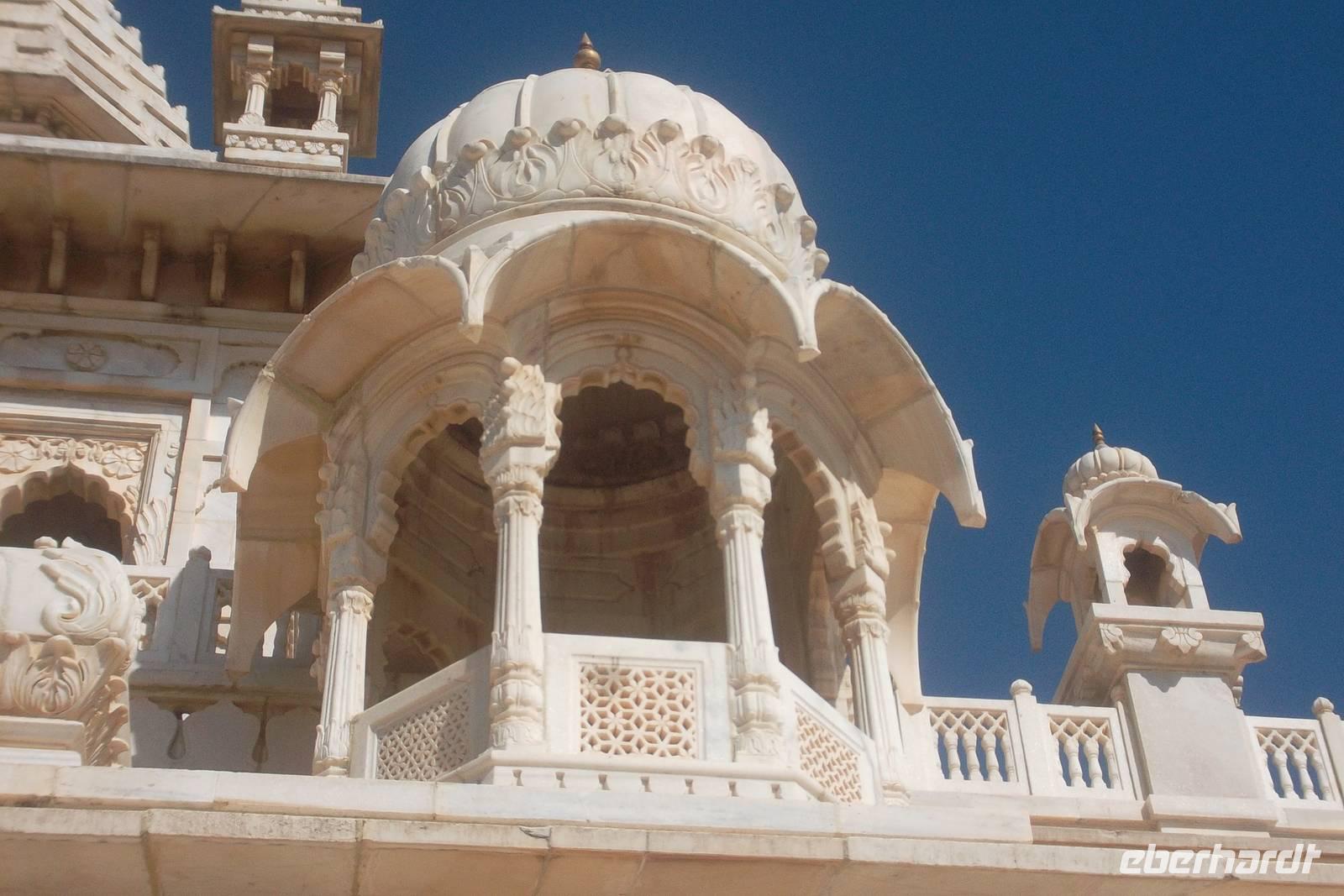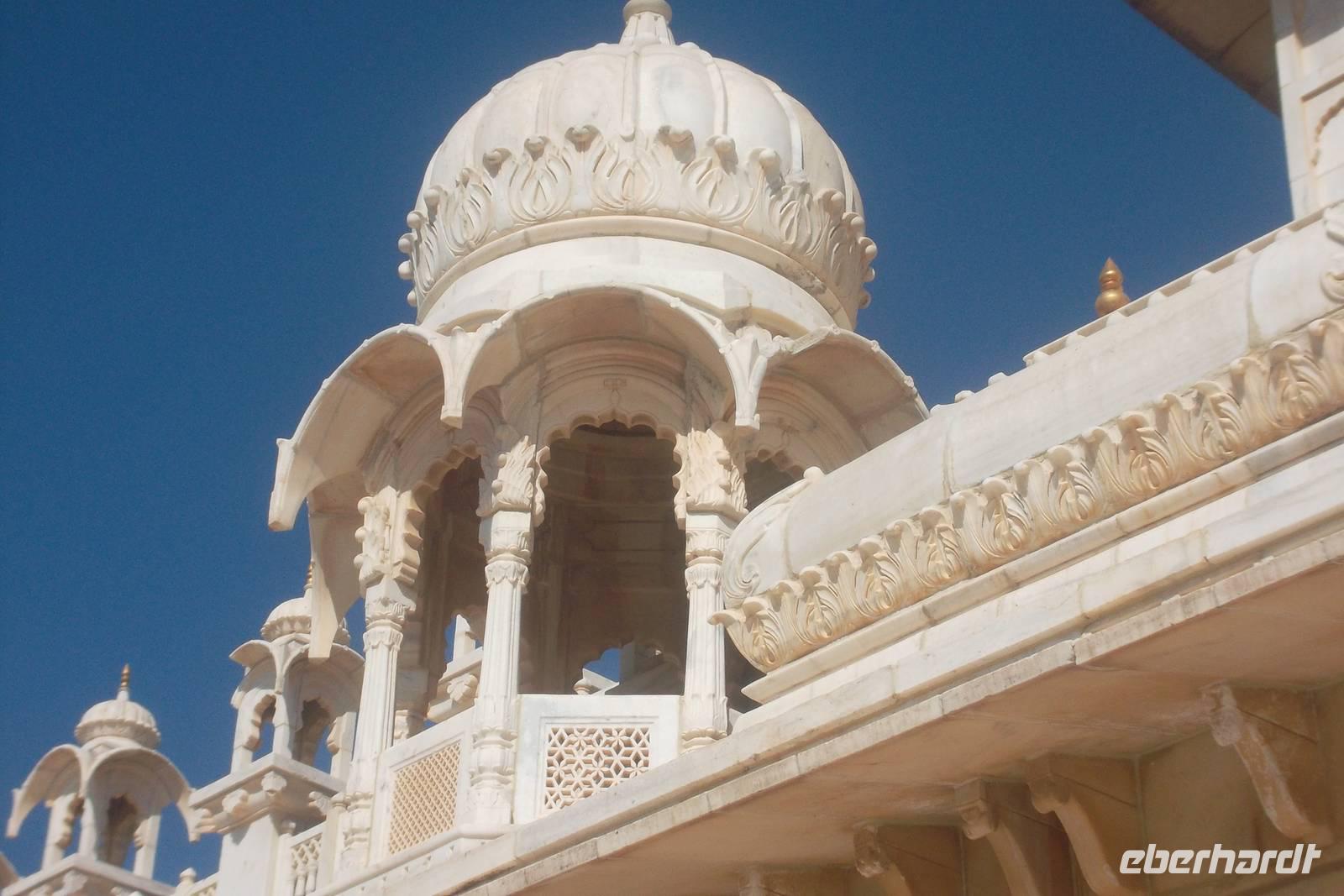 Nach etwa 80 km Busfahrt erreichten wir den Ort und fuhren sogleich zur ersten Besichtigung. Das Mausoleum Jaswant Thada, Gedenkstätte für den Maharadscha Jaswant Singh II., der von der Bevölkerung sehr verehrt wurde, errichtete man Ende des 19. Jh. wie das Taj Mahal aus weißem rajasthanischen Marmor, dessen Lichtdurchlässigkeit ihn von asllen anderen Marmorarten unterscheidet. Die Grundgedanken von Liebe, Verehrung und Achtung sollen in diesem reich mit Schnitzwerk verzierten Grabmal zum Ausdruck kommen. .