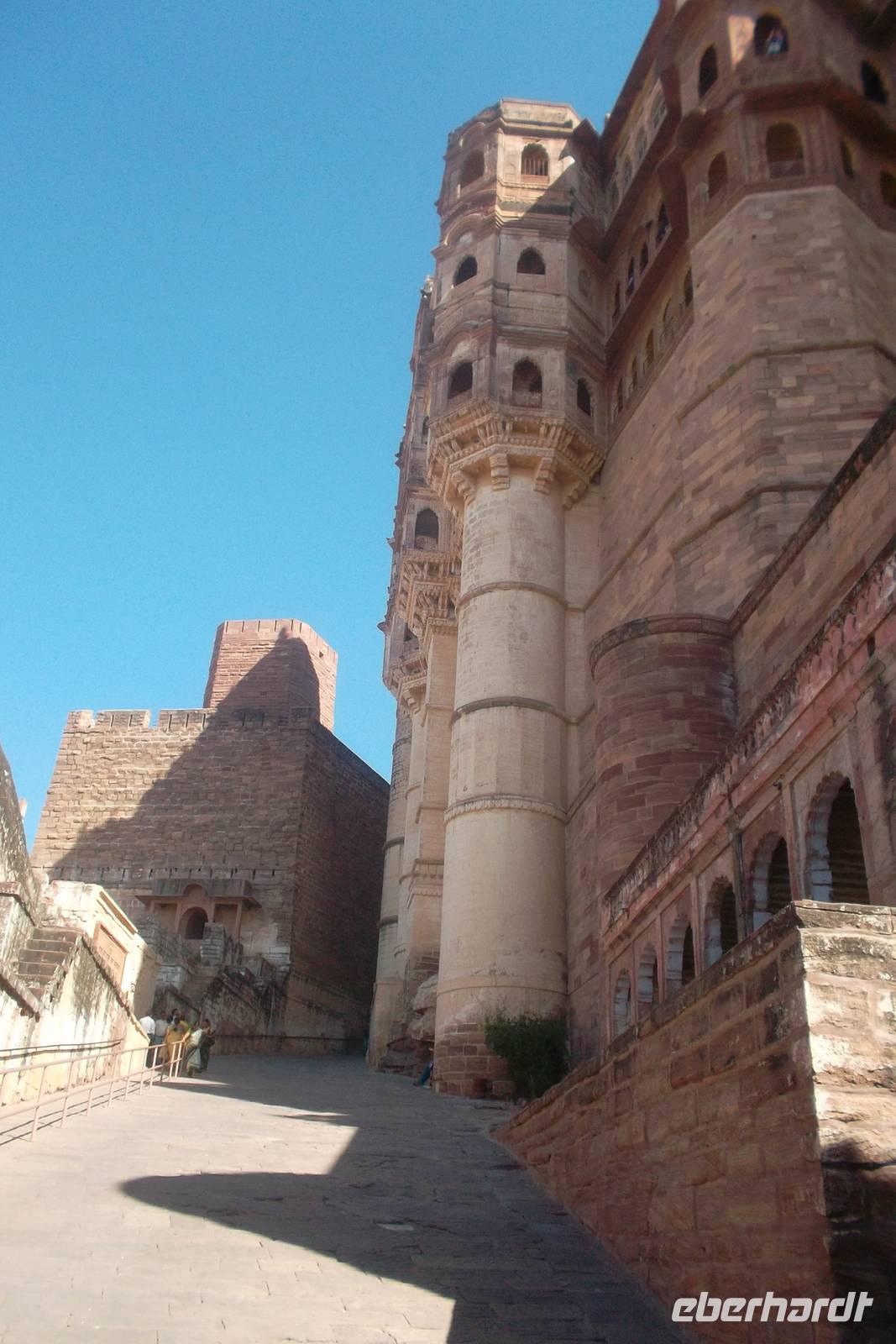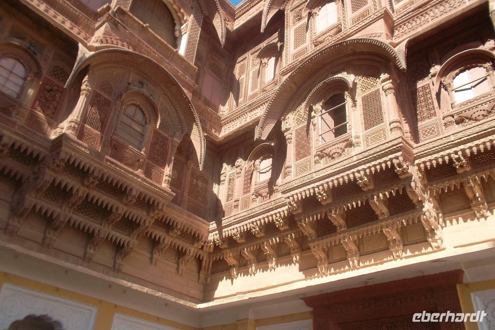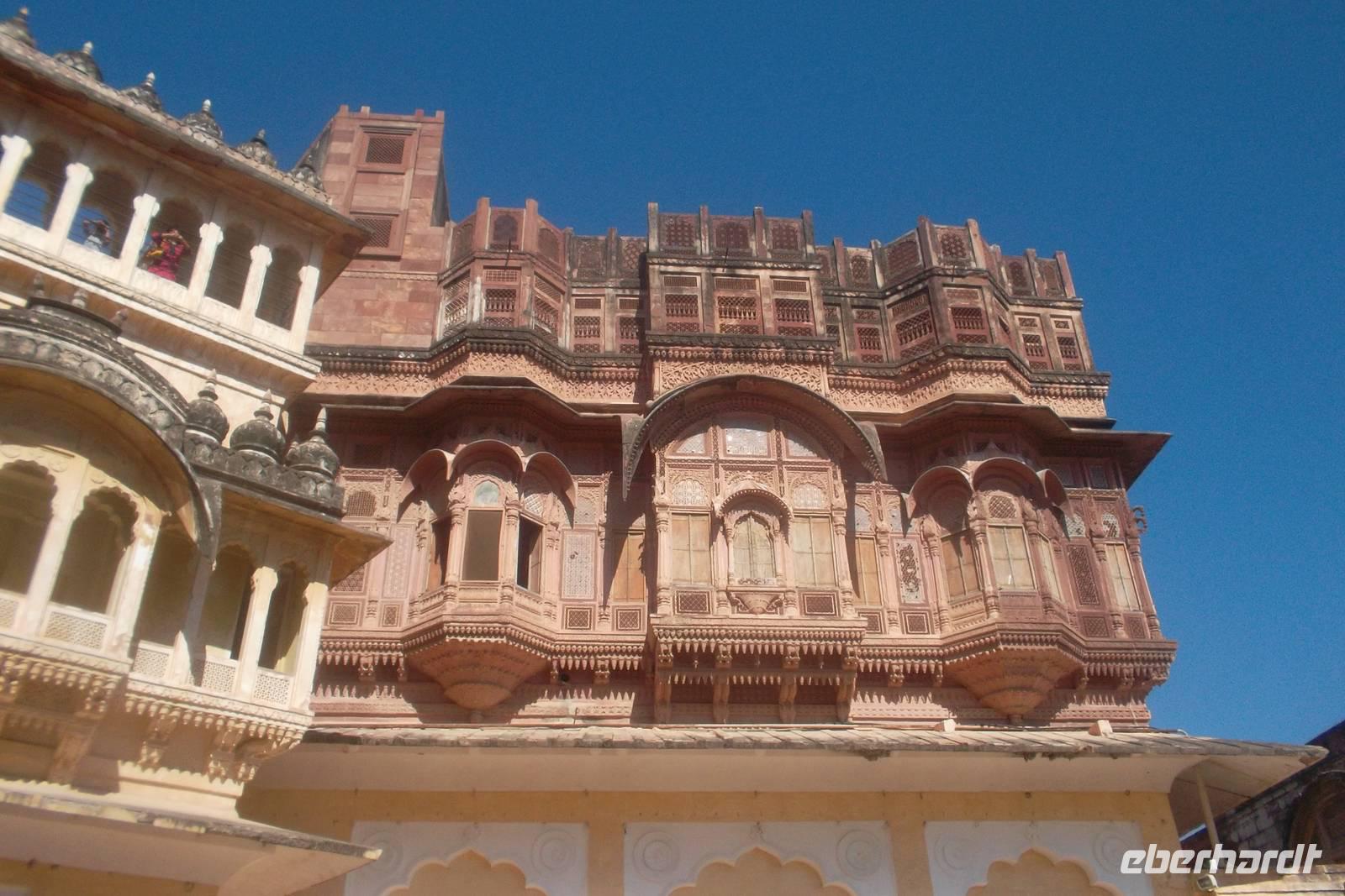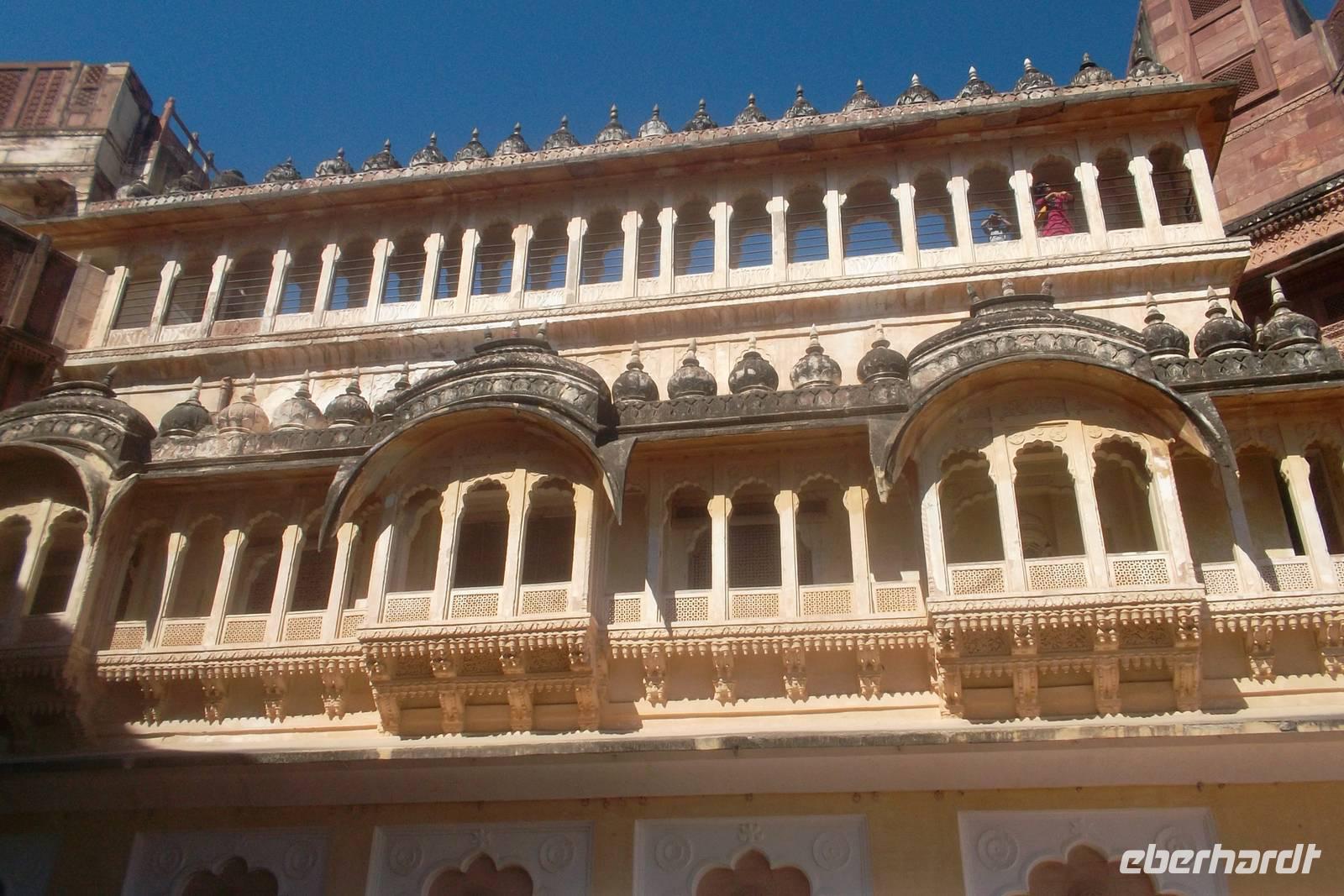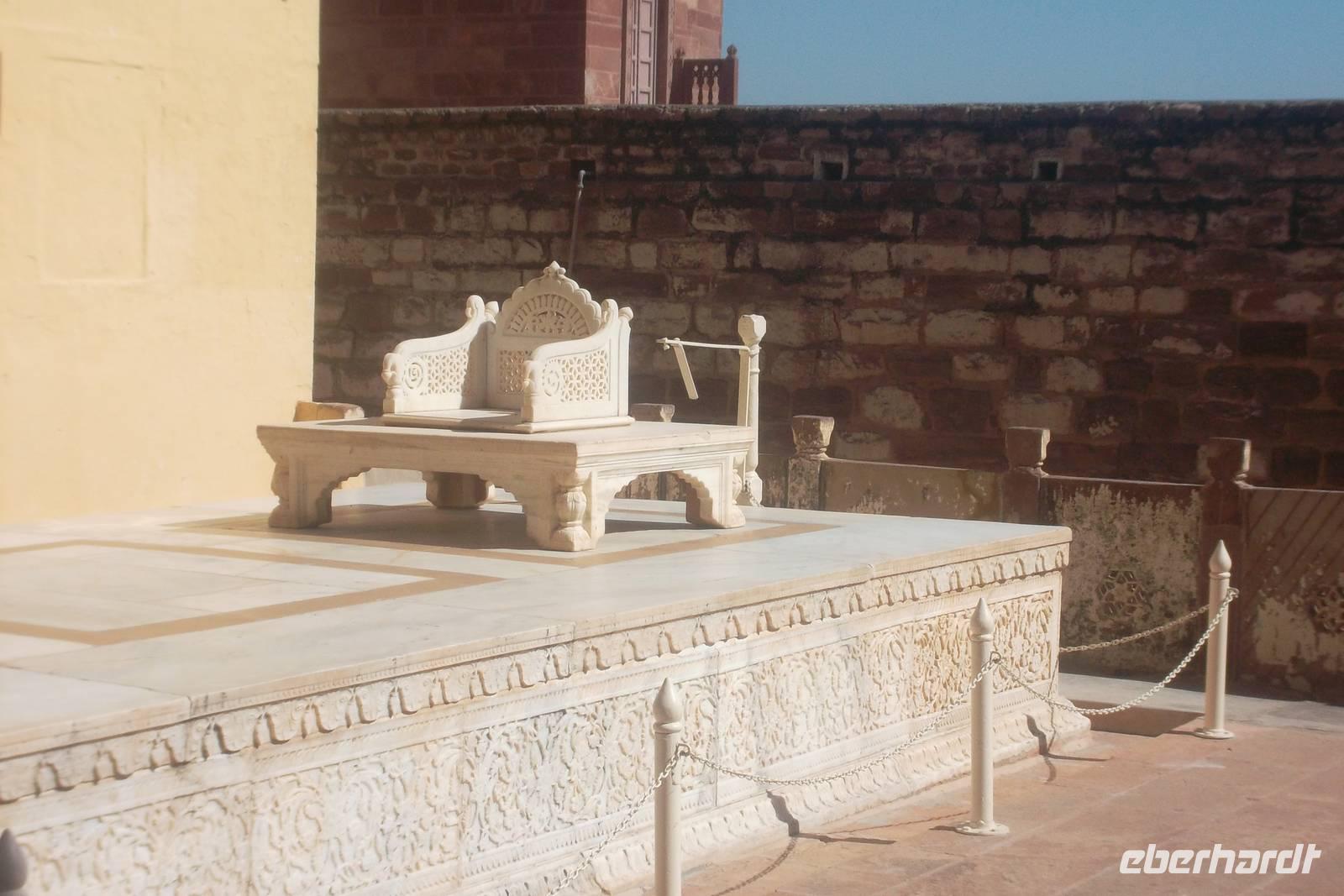 Das zweite Wahrzeichen Jodhpurs besichtigten wir danach - hoch auf einem Felsen thront das nie eroberte Meherangarh Fort. Der Felsen mit dem Residenzschloss, das sich etwa 120 m über der Millionenstadt erhebt, wird von einer insgesamt fast zehn Kilometer langen gewaltigen Wehrmauer mit acht Toren umschlossen. Unser Besuch begann nach kurzem Warten mit der Auffahrt zur Burg in einem Lift, der uns einen schweißtreibenden Aufstieg zu Fuß ersparte. Nach kurzem Blick über die Kanonen der Festung standen wir schon im ersten Innenhof des königlichen Palastes, der wie die anderen Höfe auch von reich verzierten Gebäudefassaden mit netzartig durchbrochenen steinernen Fensterplatten gesäumt wurde. Nach Besuch in einigen kleinen Museumsräumen ging es schon zum zweiten Innenhof, dem alten Audienzhof, der noch den historischen Marmorthron des Maharadschahs von Jodhpur beherbergt. Als interessante Einlage zwischendurch zeigten uns zwei Angehörige der Palastwache, wie ein Turban, bestehend aus einer acht bis neun Meter langen und eineinhalb Meter breiten Stoffbahn, gewickelt wird. Gekonnt legten sich die Turbanträger ihre Kopfbedeckung um Stirn und Nacken. Unser weiterer Rundgang zeigte uns die Prunk- und Repräsentationsgemächer des alten Staates Marwar ebenso wie die Balkone und Terrassen, die einen schönen Ausblick auf die „blaue Stadt" zuließen. In die Torfahrt eingelassen finden sich bis heute sogenannte „Sati-Steine", eine Sammlung von Handabdrücken aus gebranntem Ton, mit man die Opfer freiwilliger Witwenverbrennungen ehrte.