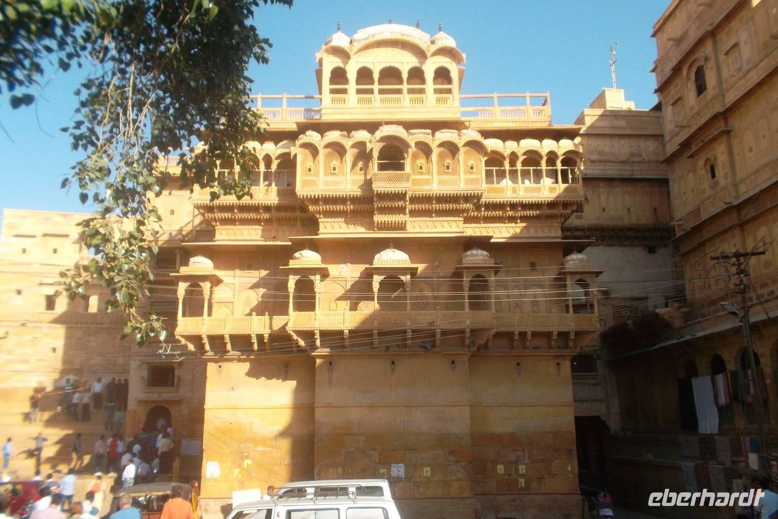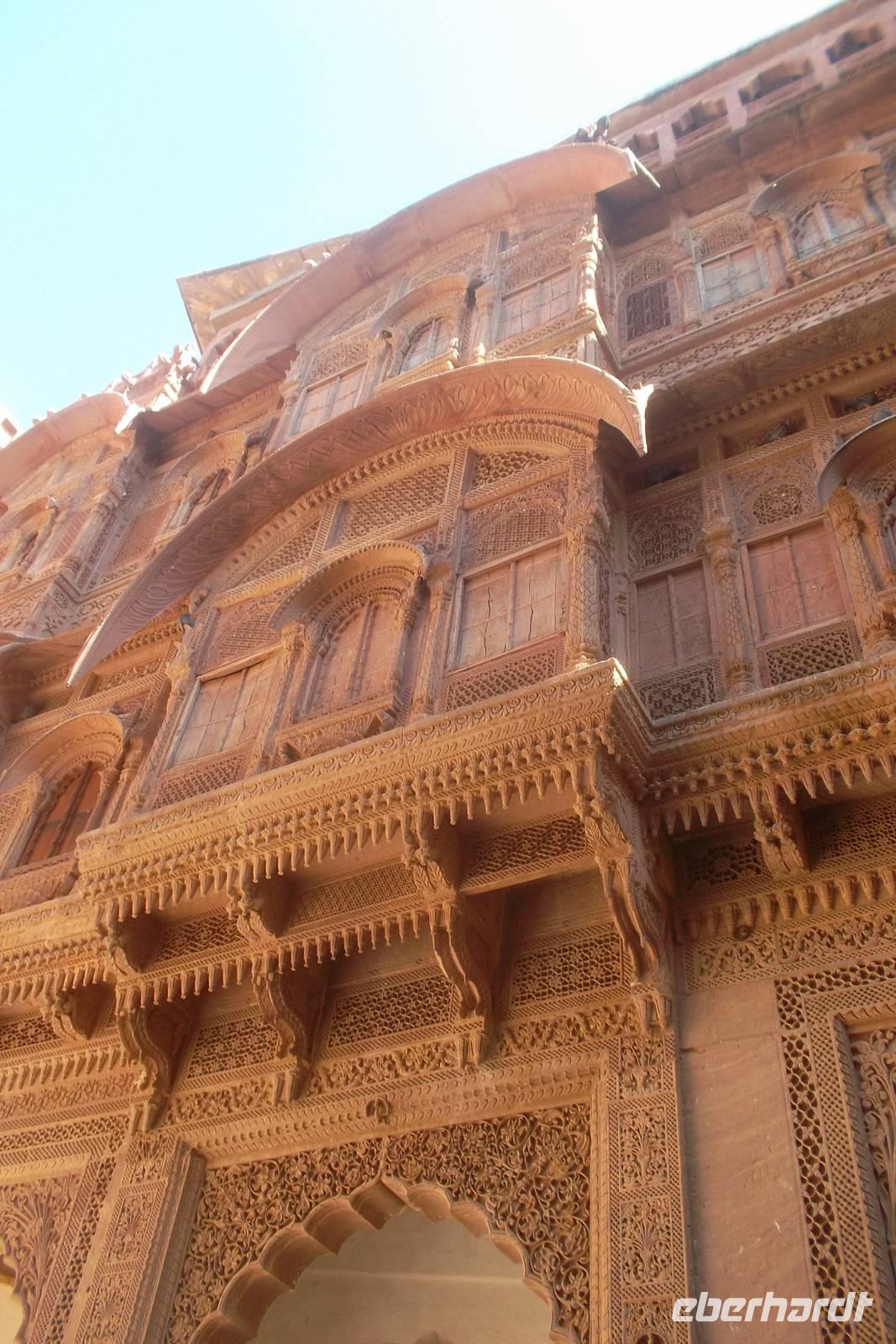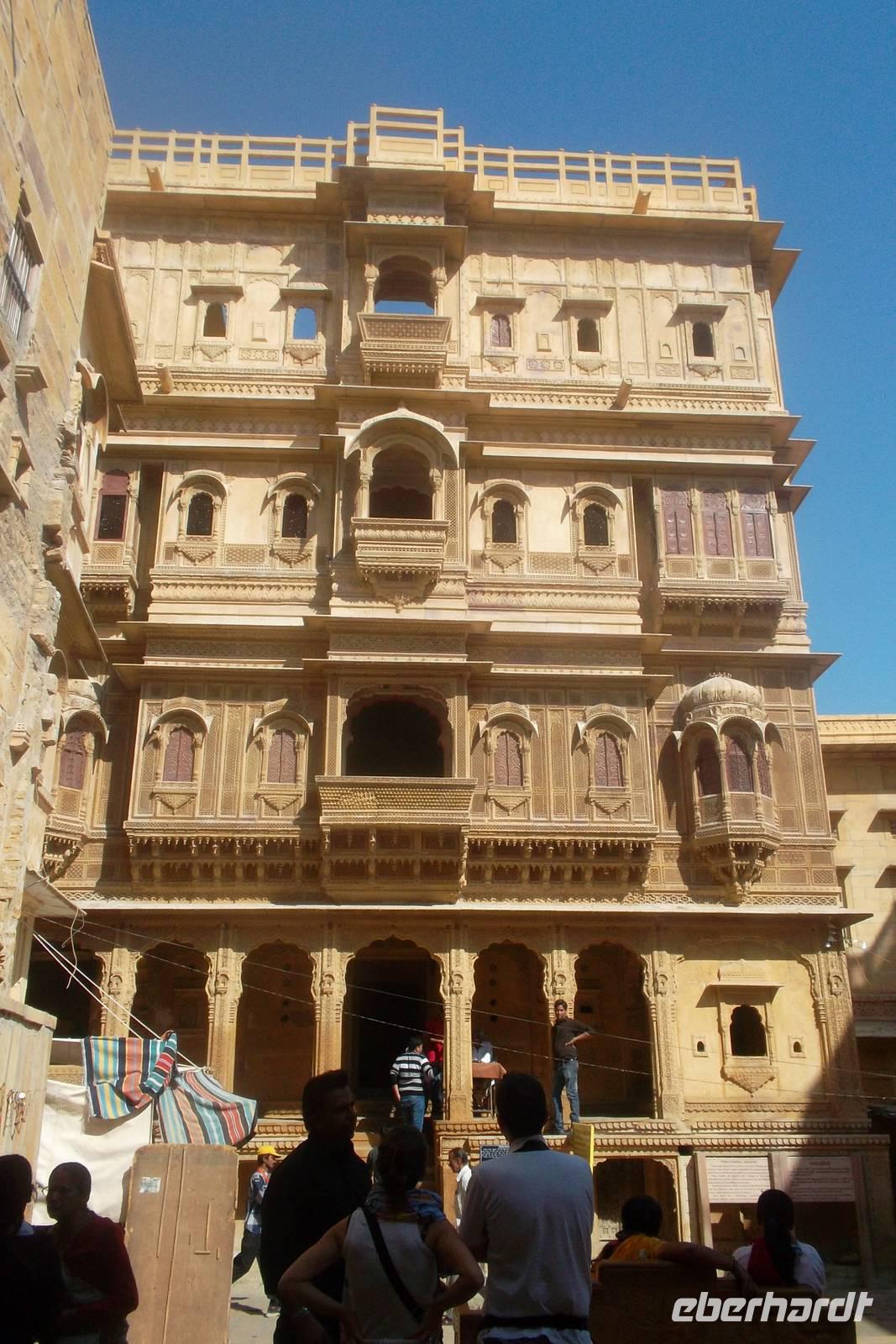 Der Vormittag war aber unbedingt den Türmen und doppelten Mauern der Altstadt-Zitadelle, gewidmet. Wie schon vorher das Rote Fort in Agra und das Meherangarh-Fort in Jodhpur, die aber aus anderen Epochen stammen, ist die Festung von Jaisalmer ein bedeutendes Prunkstück indischer Festungsarchitektur. Mehrere Dutzend Meter hoch sind die Mauern, die die Festungsstadt umgeben, die man nur auf einem kurvenreichen Weg unter Passieren mehrerer Stadttore betreten kann. Die Besichtigung der Altstadt mit ihren engen Gassen - Achtung! Heilige Kühe oft im Gegenverkehr! - ist sehr beeindruckend und bietet jede Mnge ungewöhnlicher Fotomotive. Immer wieder sind dabei die herrlichen geschnitzten Sandsteinfassaden der Wohnhäuser der Blickfang und allein das Stehen auf dem kleinen Stadtplatz mit Blick zur reichverzierten Fassade des Stadtpalastes ist ein Erlebnis. Hier hatten wir dann auch etwas Freizeit zum Bummel auf eigene Faust oder zum Erhandeln von Souvenirs... Nächstes Ziel war die Neustadt mit ihren „Havelis", den einstigen Kaufmanns-Palästen. Reiche Händler, Verwaltungsangestellte der Herrscher von Jaisalmer oder auch hohe Offiziere oder adelige Würdenträger leisteten sich berauschend große Häuser, die sie auf einzigartige Weise mit filigran geschmückten Sandsteinfassaden in kunstvoller Kerbschnitzerei verzieren ließen.
