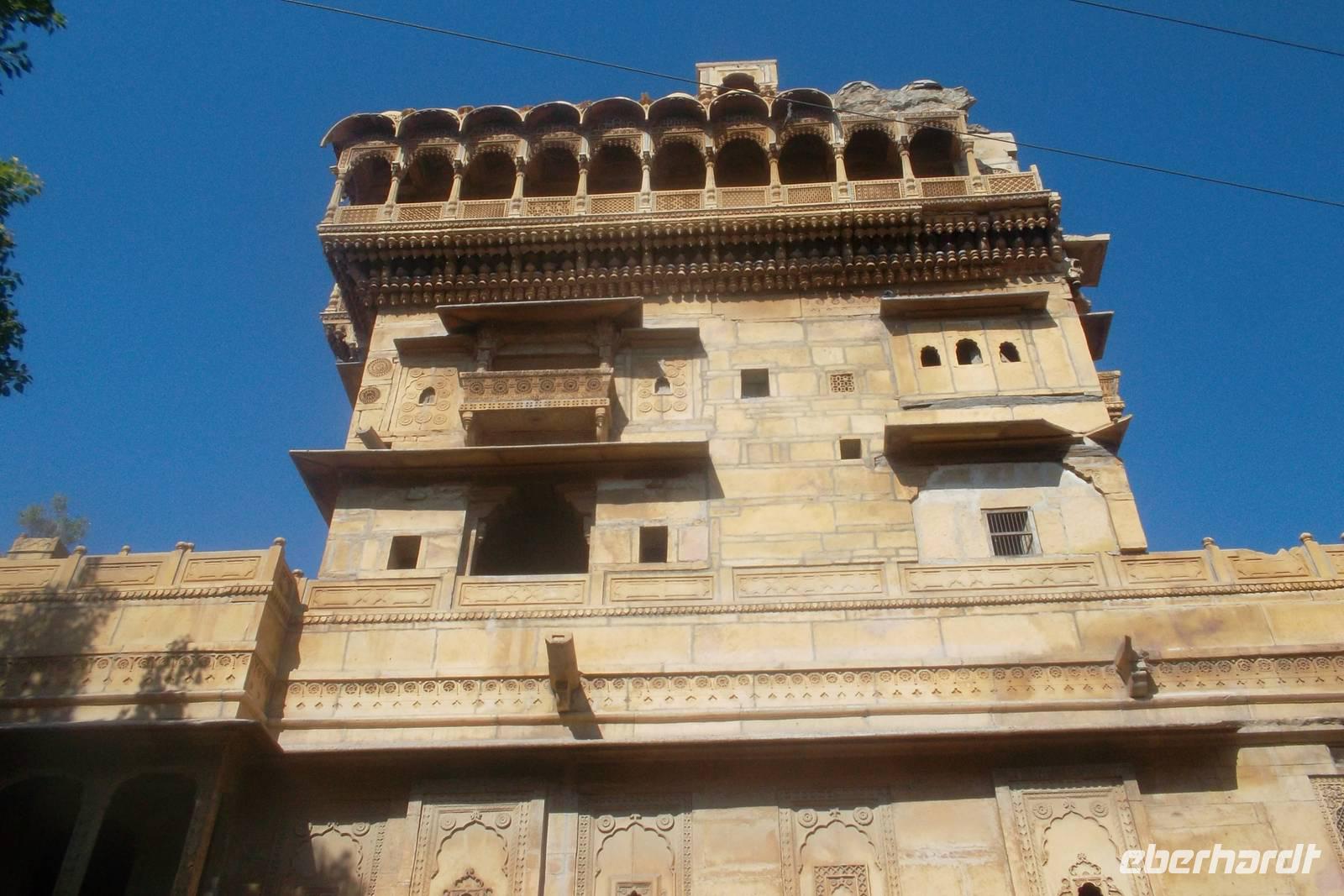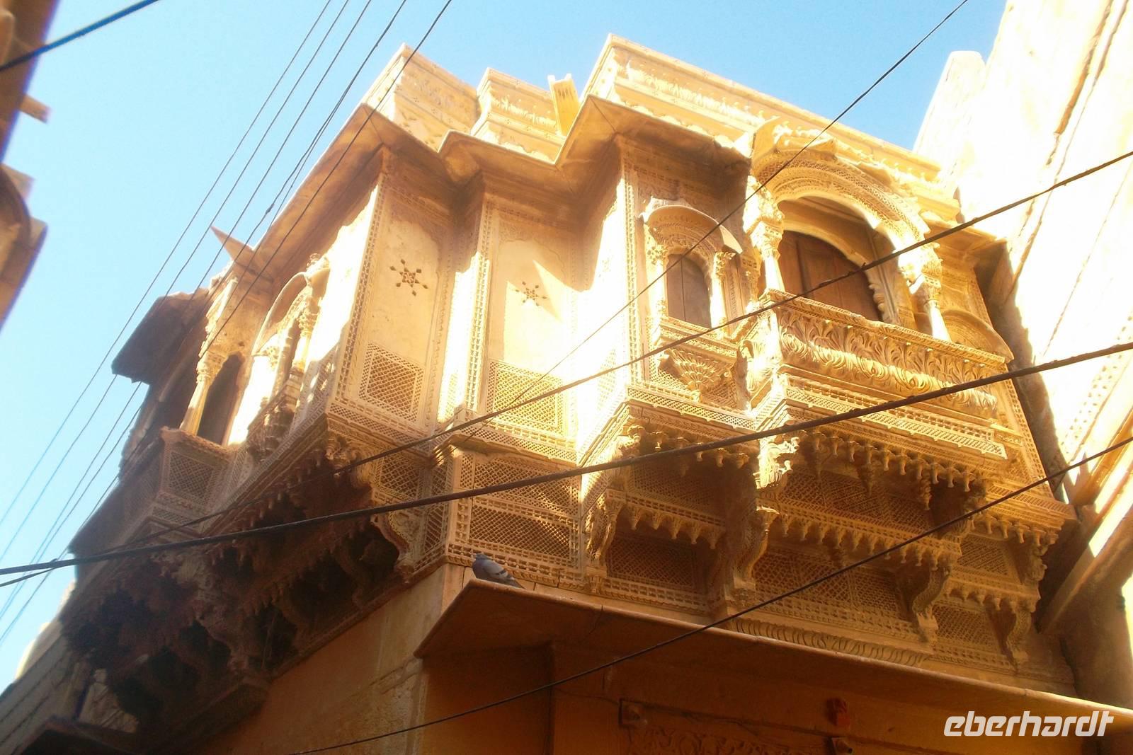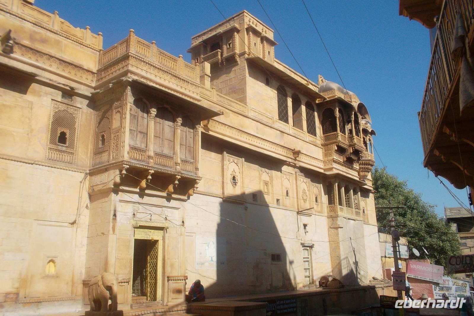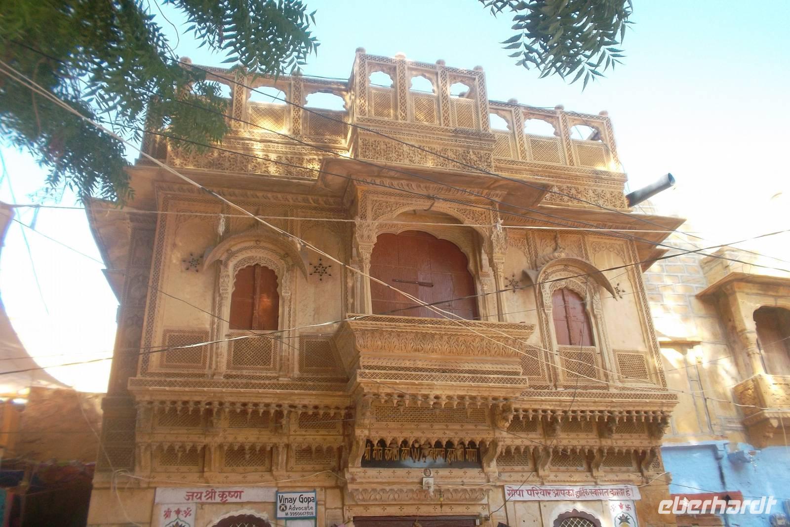 Der Vormittag war aber unbedingt den Türmen und doppelten Mauern der Altstadt-Zitadelle, gewidmet. Wie schon vorher das Rote Fort in Agra und das Meherangarh-Fort in Jodhpur, die aber aus anderen Epochen stammen, ist die Festung von Jaisalmer ein bedeutendes Prunkstück indischer Festungsarchitektur. Mehrere Dutzend Meter hoch sind die Mauern, die die Festungsstadt umgeben, die man nur auf einem kurvenreichen Weg unter Passieren mehrerer Stadttore betreten kann. Die Besichtigung der Altstadt mit ihren engen Gassen - Achtung! Heilige Kühe oft im Gegenverkehr! - ist sehr beeindruckend und bietet jede Mnge ungewöhnlicher Fotomotive. Immer wieder sind dabei die herrlichen geschnitzten Sandsteinfassaden der Wohnhäuser der Blickfang und allein das Stehen auf dem kleinen Stadtplatz mit Blick zur reichverzierten Fassade des Stadtpalastes ist ein Erlebnis. Hier hatten wir dann auch etwas Freizeit zum Bummel auf eigene Faust oder zum Erhandeln von Souvenirs... Nächstes Ziel war die Neustadt mit ihren „Havelis", den einstigen Kaufmanns-Palästen. Reiche Händler, Verwaltungsangestellte der Herrscher von Jaisalmer oder auch hohe Offiziere oder adelige Würdenträger leisteten sich berauschend große Häuser, die sie auf einzigartige Weise mit filigran geschmückten Sandsteinfassaden in kunstvoller Kerbschnitzerei verzieren ließen.